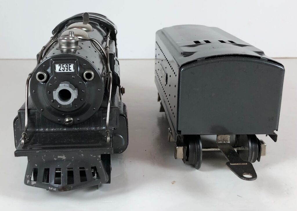 6. No. 259E / 259T 2-4-2 Steam Locomotive in black with nickel trim, brass circle “L”, black wheels with steel rims (1936). The No. 259T Tender is black with nickel trim, brass plates and nickel journals.