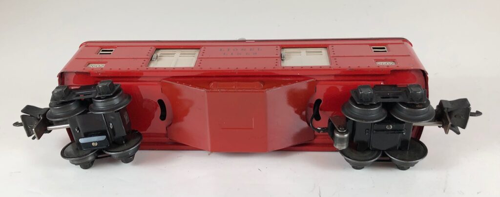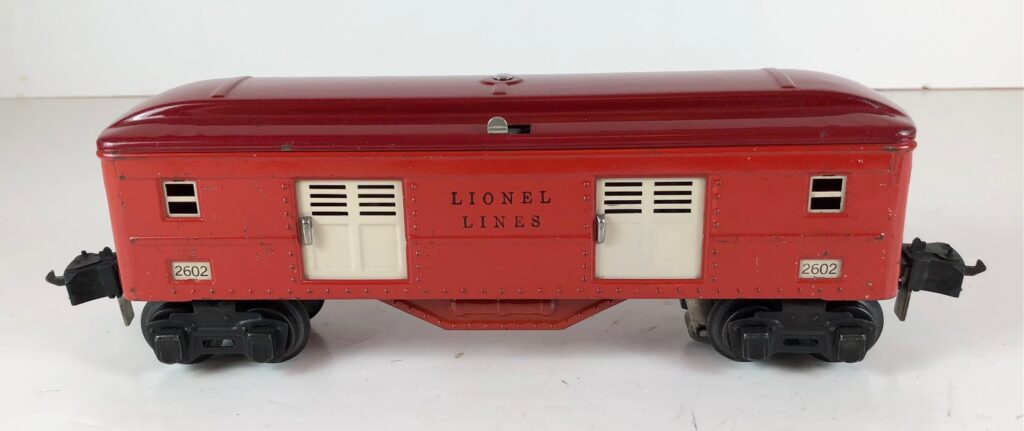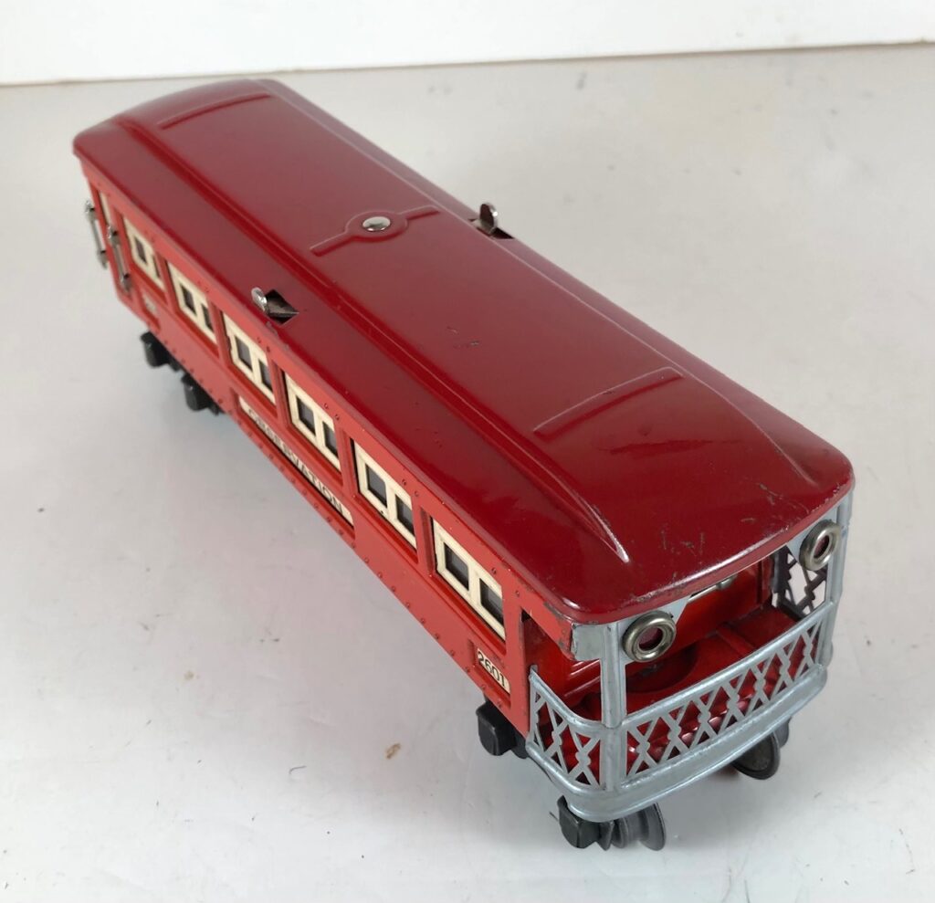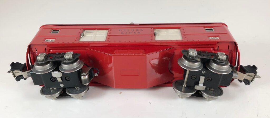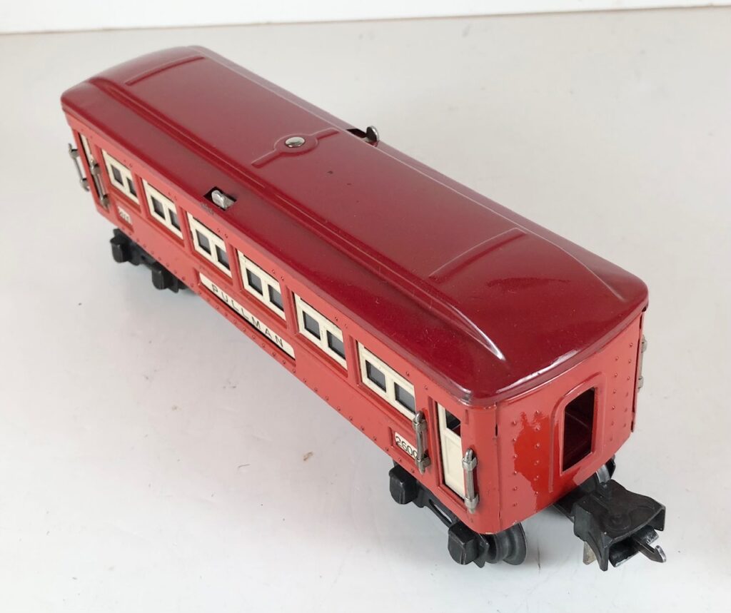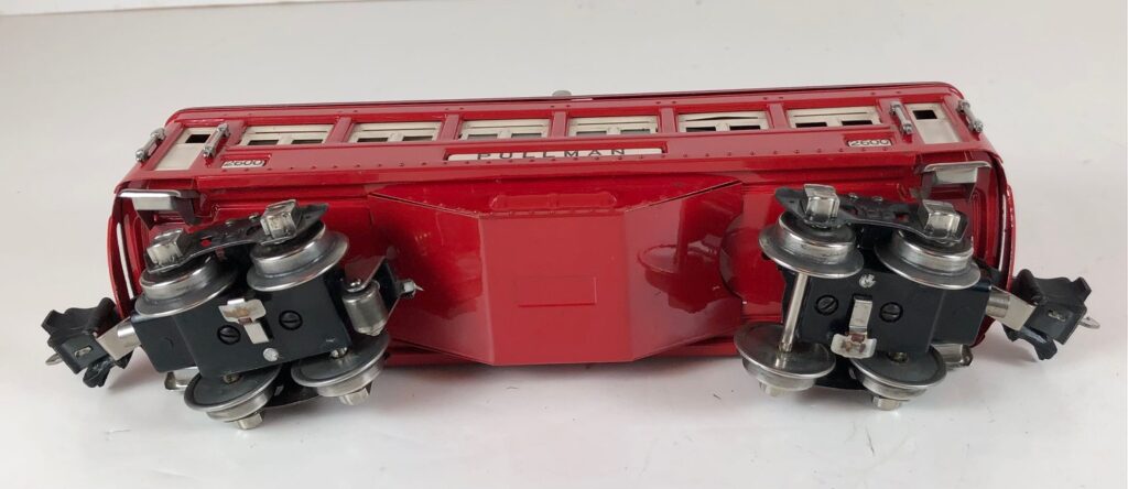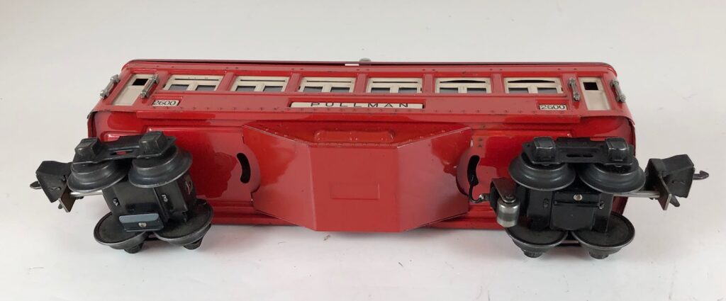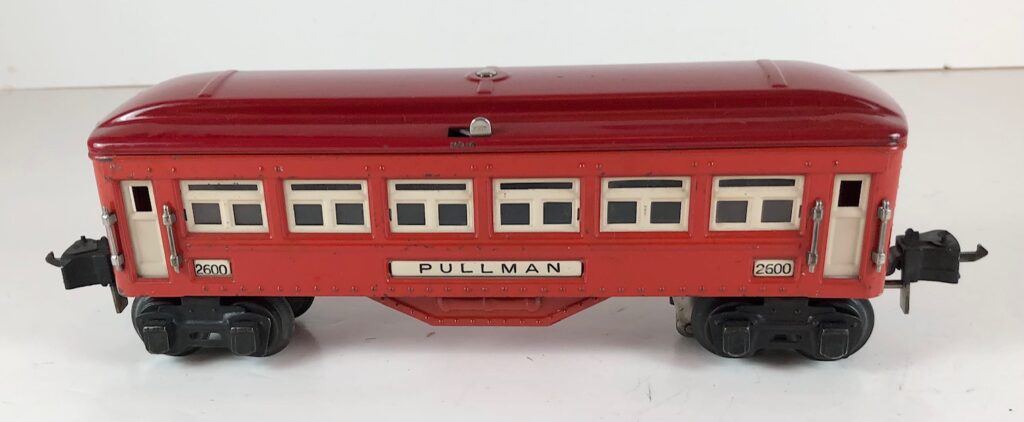 2. No. 2600, 2601, 2602 Passenger Cars in red (1940). The cars have a somewhat darker red roof, ivory inserts, nickel trim, black journals, and high mounted operating box couplers. The color of the red roofs may vary slightly within sets. These cars had a longer wheelbase and no steps.