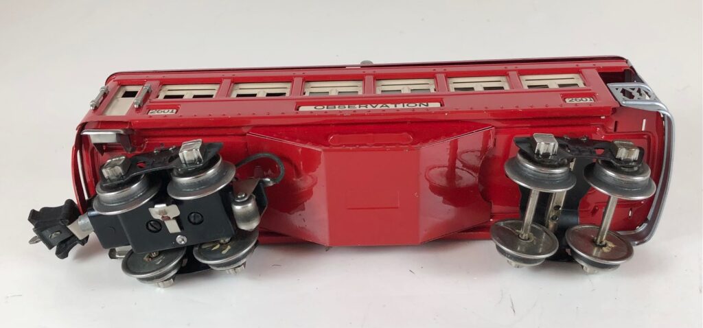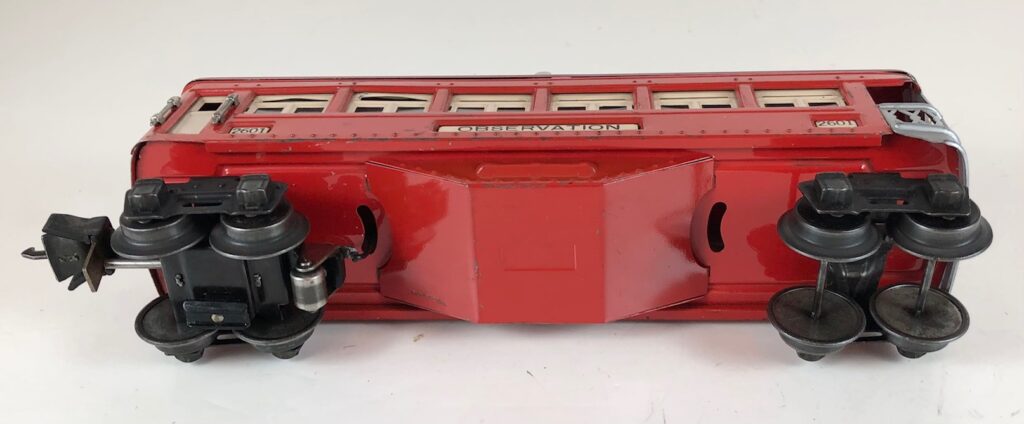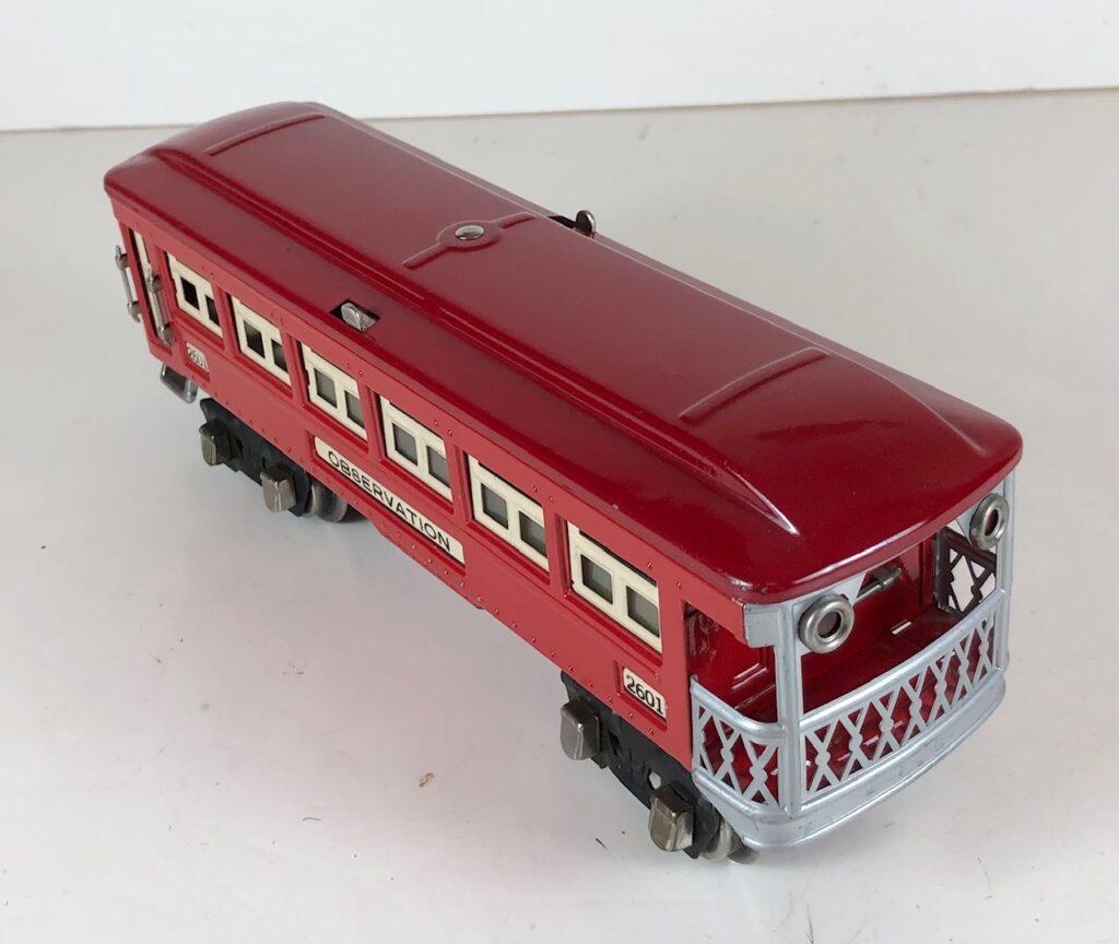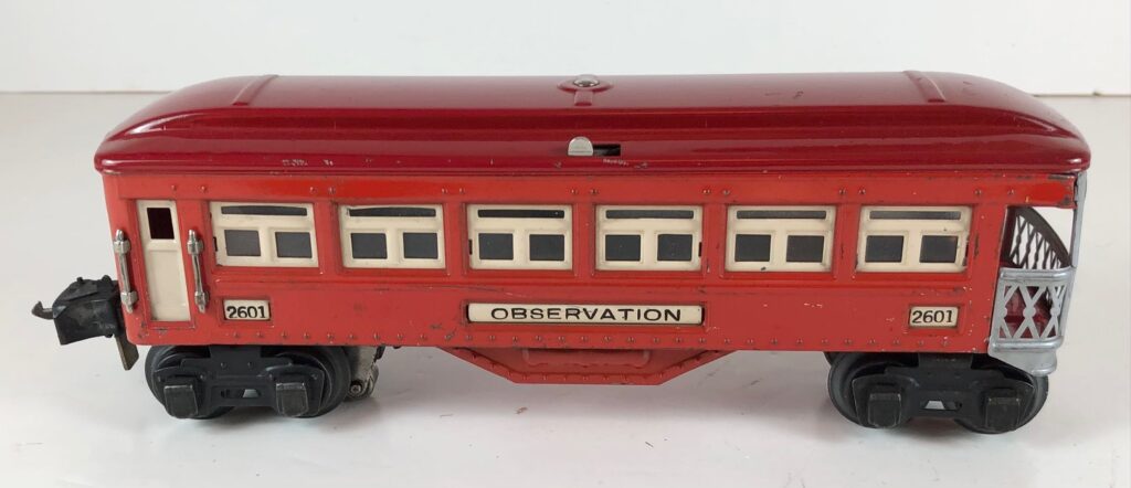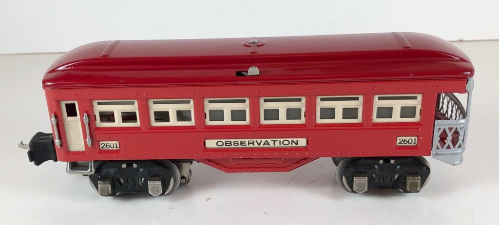 1. No. 2600, 2601, 2602 Passenger Cars in red (1938-1942). The cars have a somewhat darker red roof, ivory inserts, nickel trim, nickel journals, and operating box couplers. The color of the red roofs may vary slightly within sets. The No. 2602 Observation was issued with both silver and red rear railing.