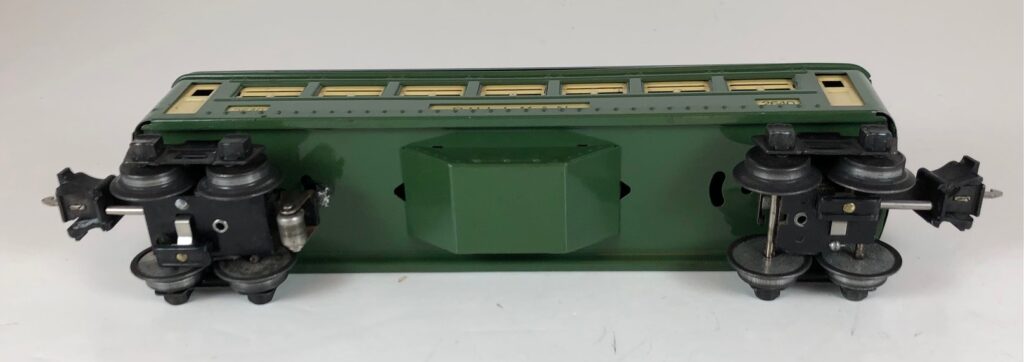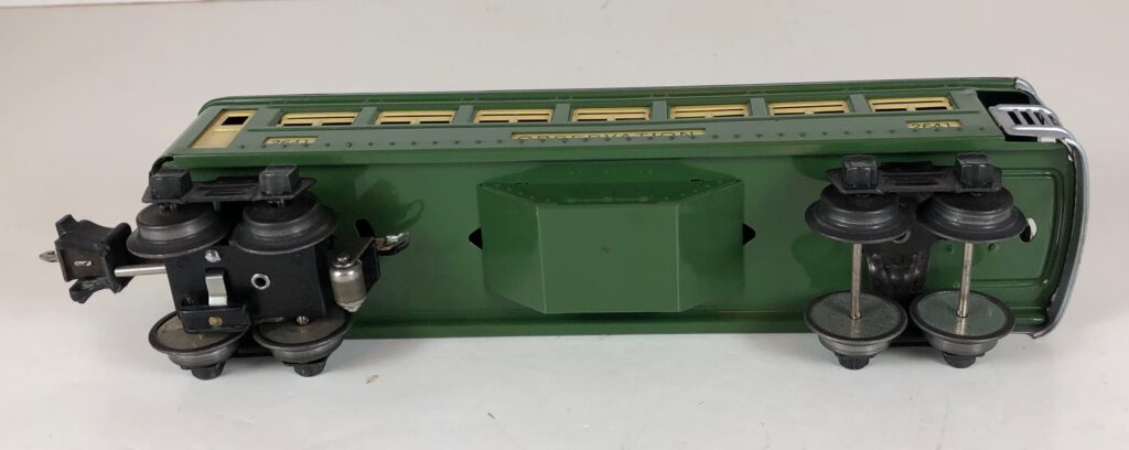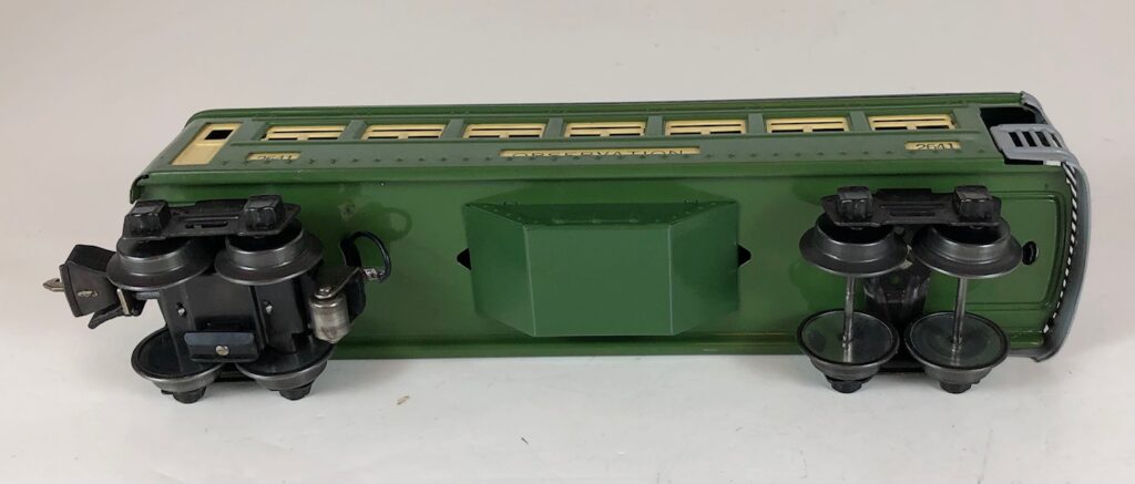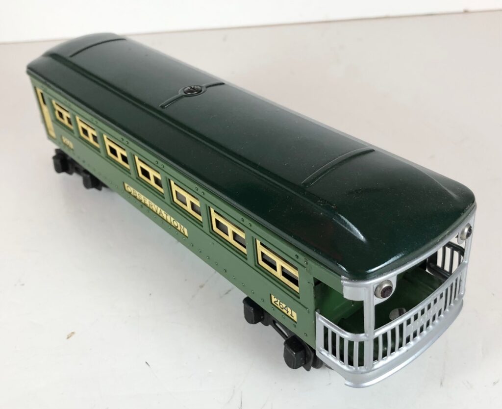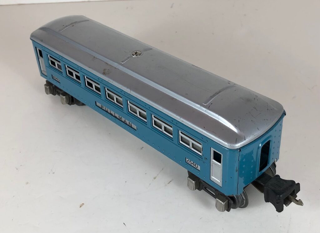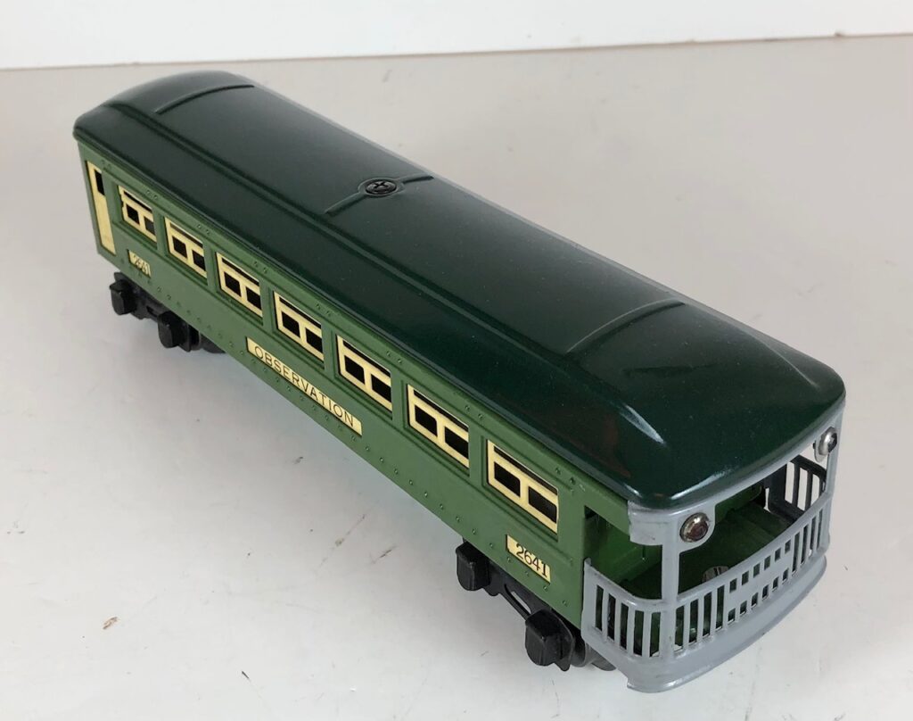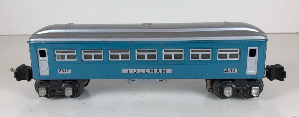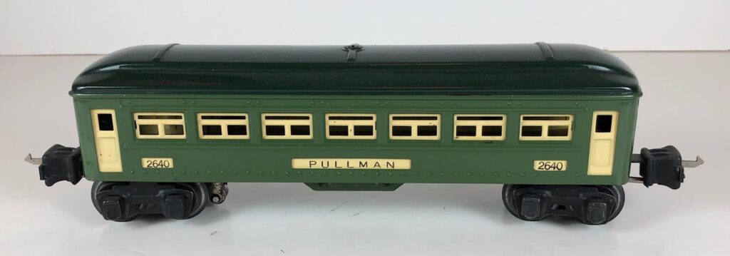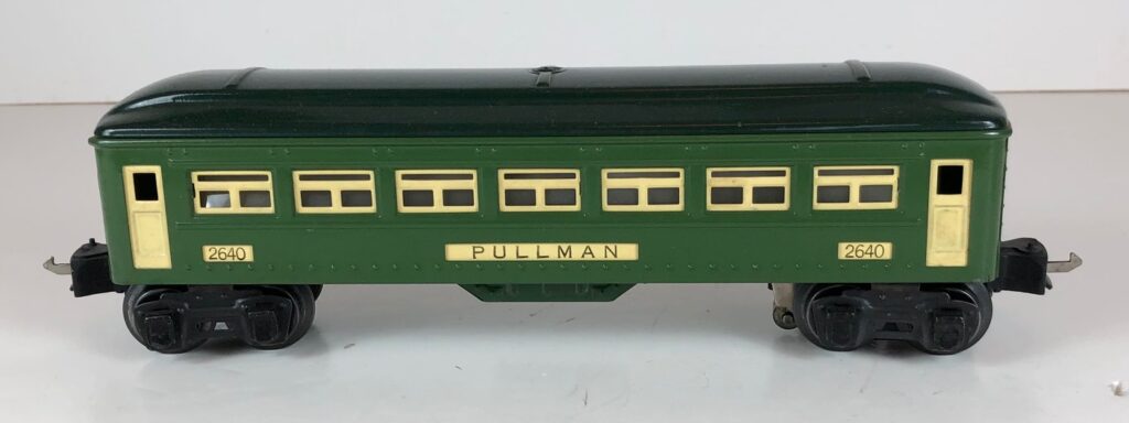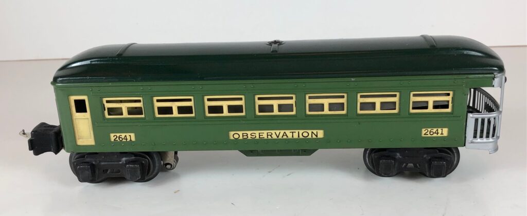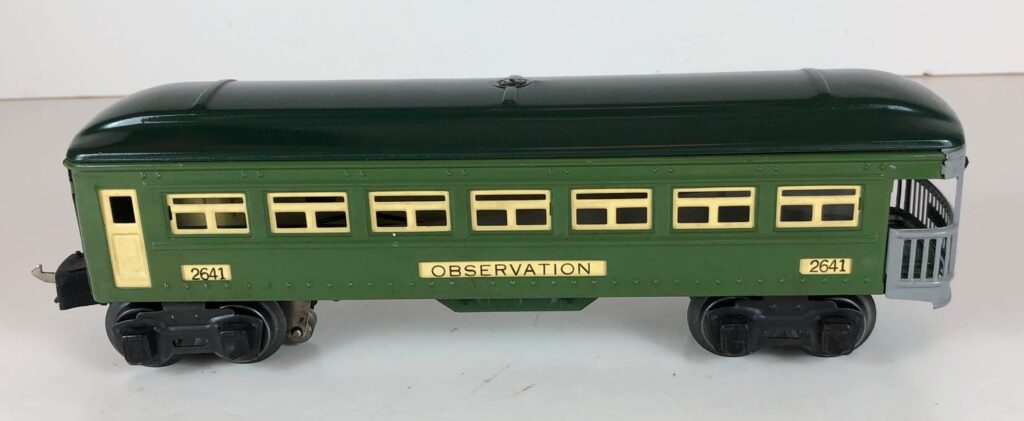 The Lionel No. 2640 Pullman and No. 2641 Observation Passenger Cars were introduced in 1938 and were issued through 1942. The No. 2640 and No. 2641 were mid-size tinplate passenger cars and shared the same body with the No. 1630, No. 2630, and No. 2642 Series Passenger Cars all issued by Lionel following the Classic Period. These passenger cars were included as components of a number of mid-level cataloged passenger sets. These cars were later carried over by Lionel to the postwar period, with modifications to the body and the change to postwar trucks.