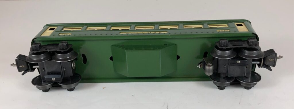 The No. 2640 and 2641 Passenger Cars measure 9 1/2-inches in length. The sides of the cars have a single metal insert, painted a contrasting color, to create the doors, window inserts, and identification of the car number and type. The cars have a clear or frosted celluloid strip in the windows. The cars were illuminated. The only difference between the 2630 and 2640 Series Passenger Cars is that the 2640 Series Cars were illuminated.