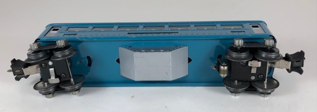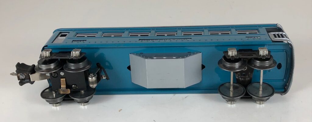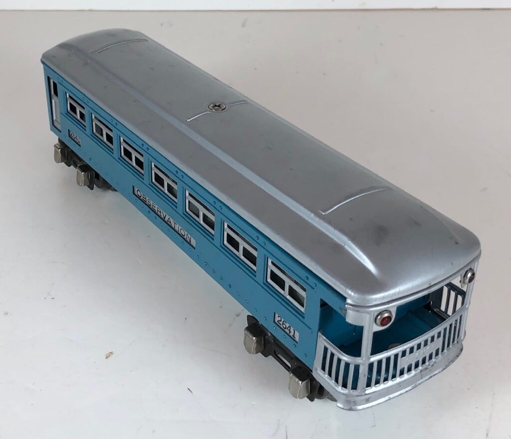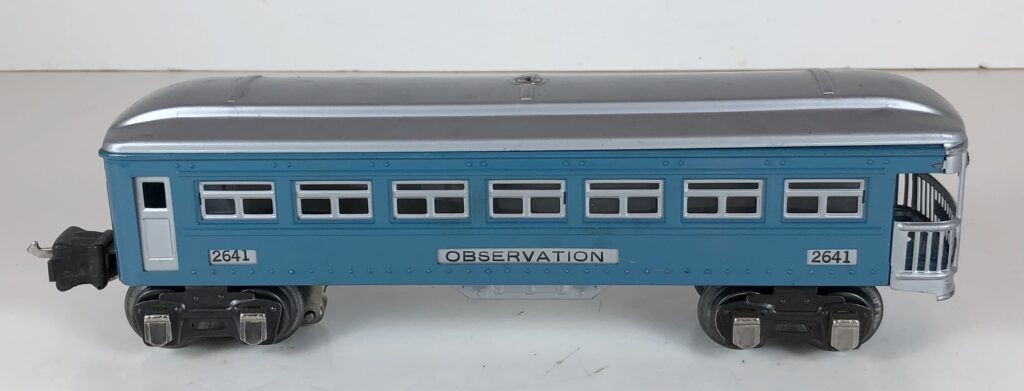 1. No. 2640, 2641 Passenger Cars in blue (1938-1941). The cars have a silver roof, silver “fish belly”, silver inserts, nickel journals, and early style operating box couplers. The No. 2641 Observation has a silver rear railing.