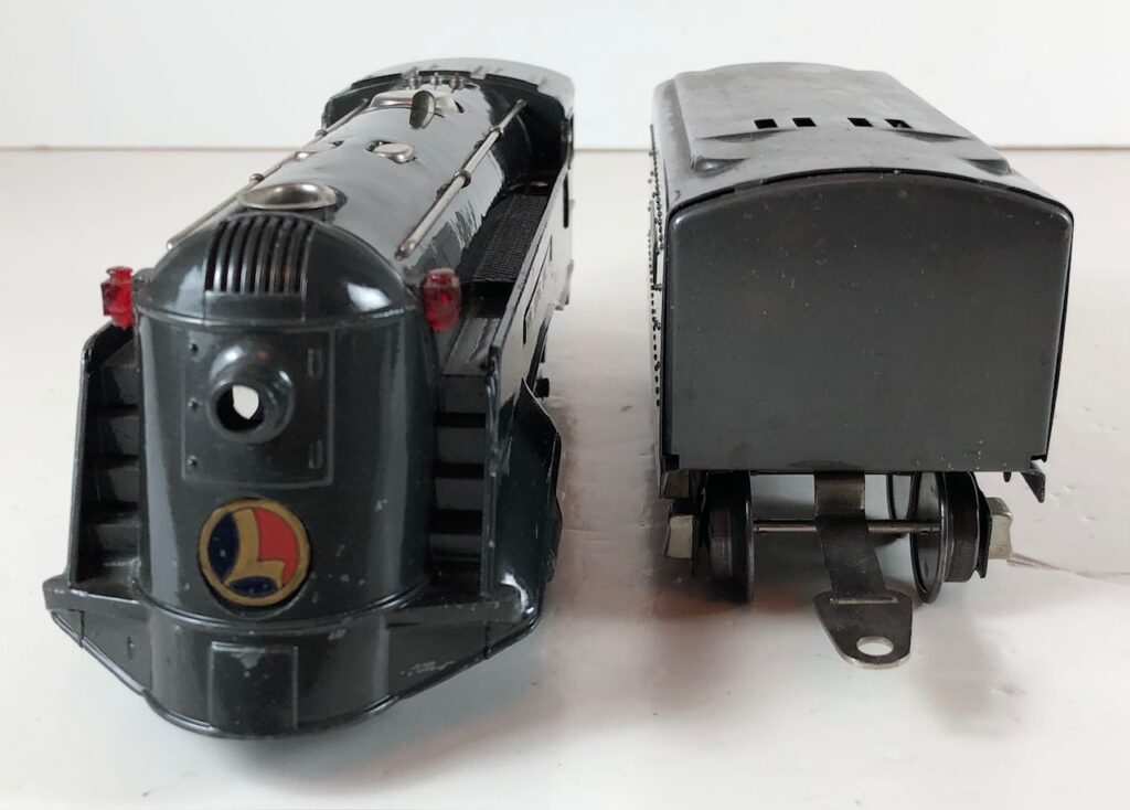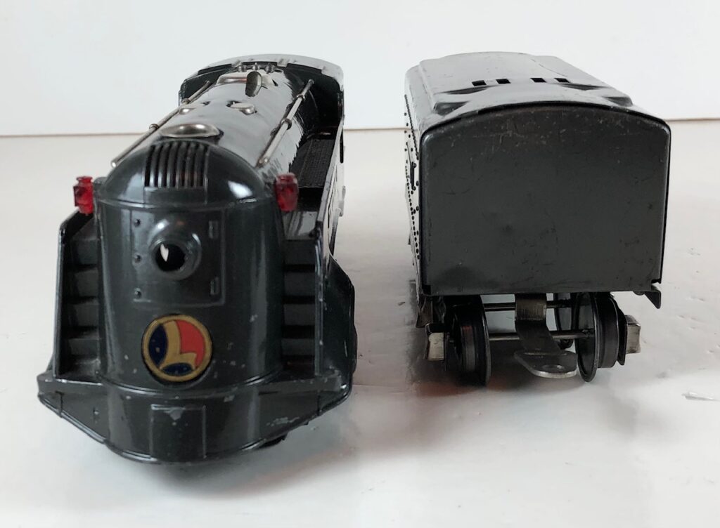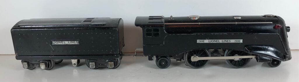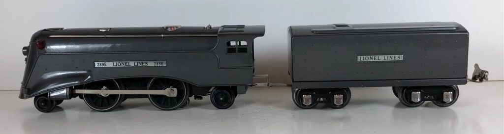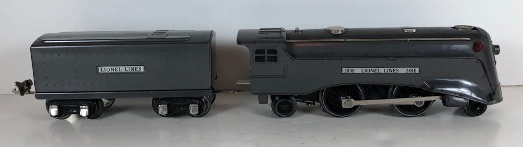 1. No. 289E / 1689T 2-4-2 Steam Locomotive in gunmetal gray with nickel trim, aluminum plates on the sides of the body and an aluminum circle “L” plate on the nose (1936). The No. 1689T Tender is gunmetal gray with nickel plates on the sides of the tender. The tender has nickel journals and a latch coupler.