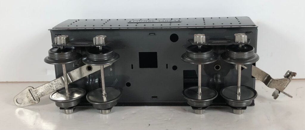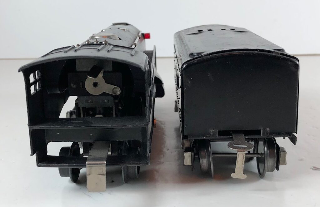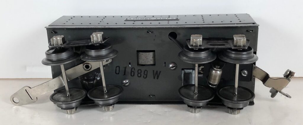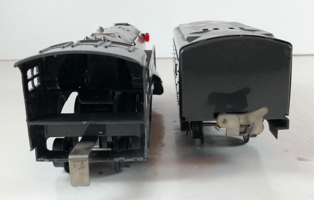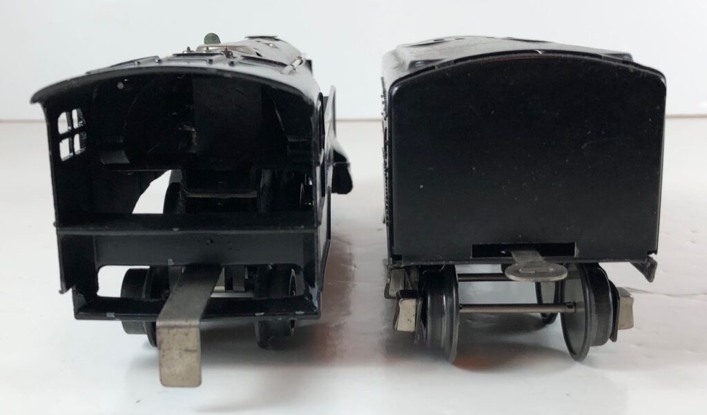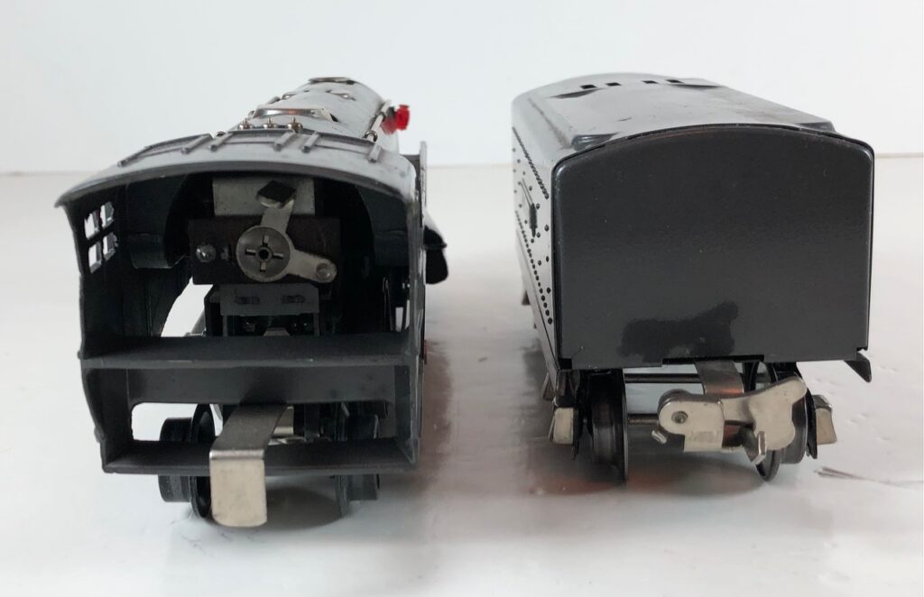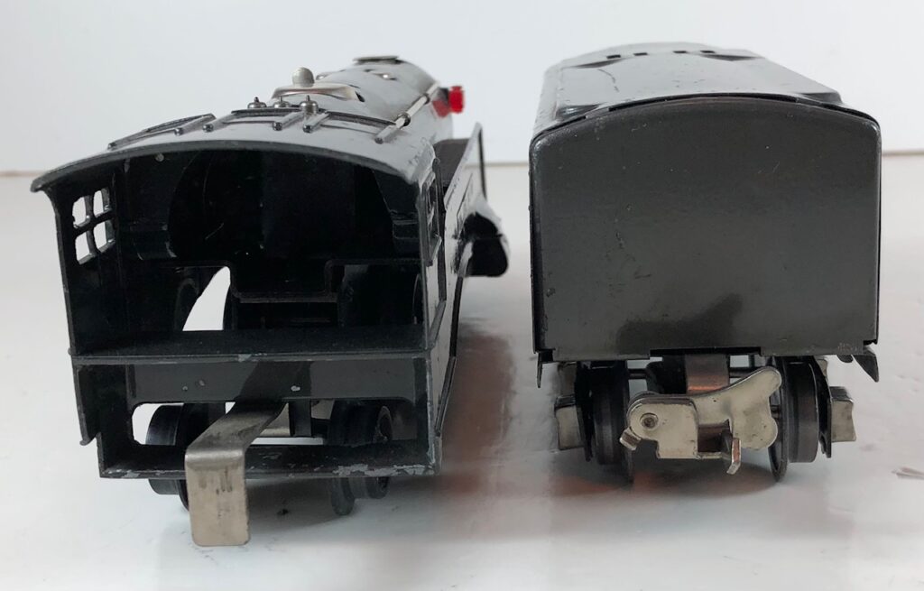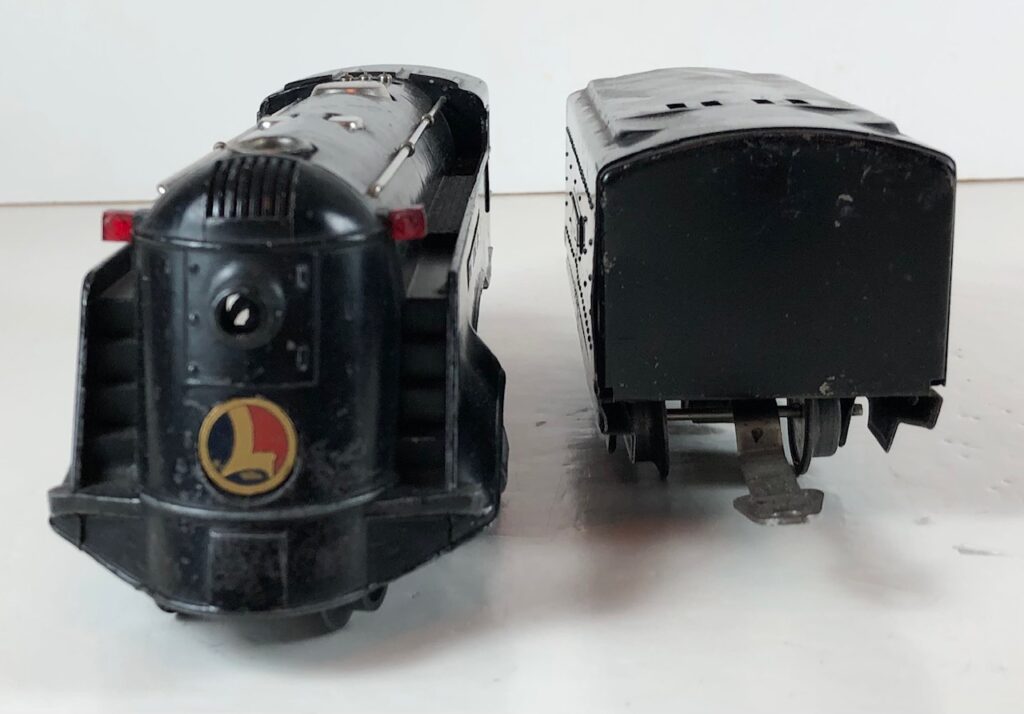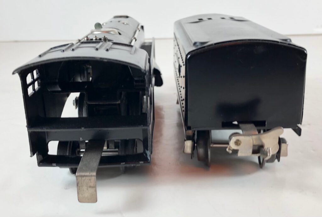 The No. 289E Steam Locomotive in gunmetal gray was paired with a No. 1689T Tender. The No. 289E Locomotive in black was either paired with a 1588W Tender or a No. 1689W Tender. The 1689T/W Tenders and the No. 1588W Tenders have a square sheet metal body and latch couplers. The tenders have an aluminum “Lionel Lines” plate on the sides and no other trim. The No. 1689T/W Tenders have two four-wheel trucks. The No. 1588W Tender has four wheels. The No. 289E / 1689T/W Steam engine and tender combined measure 16-inches in total length.