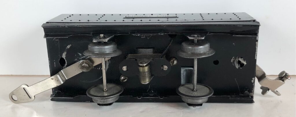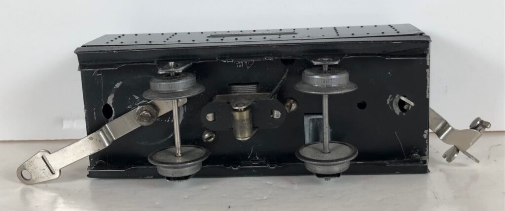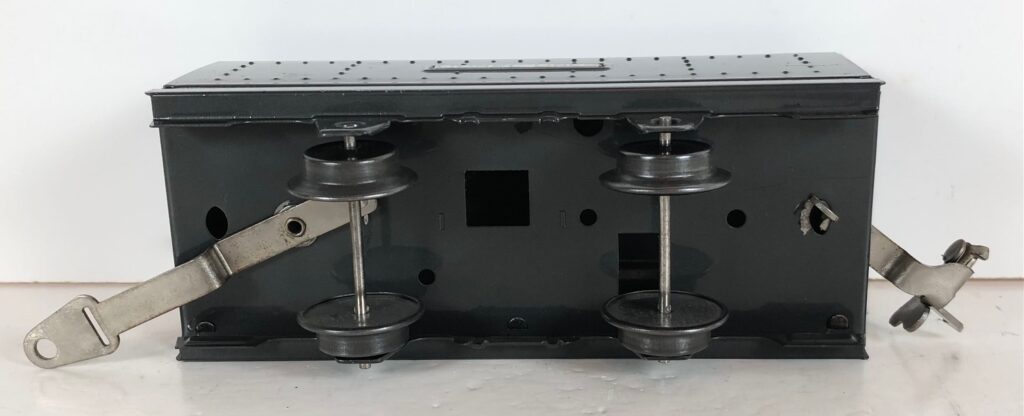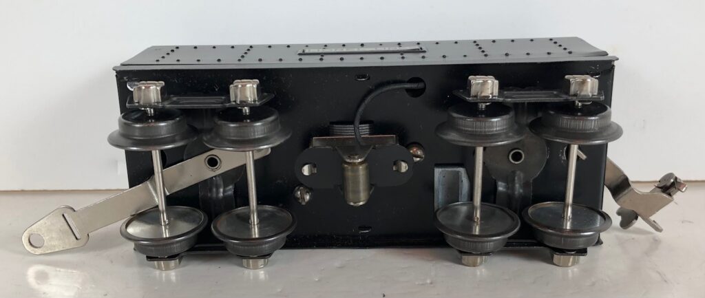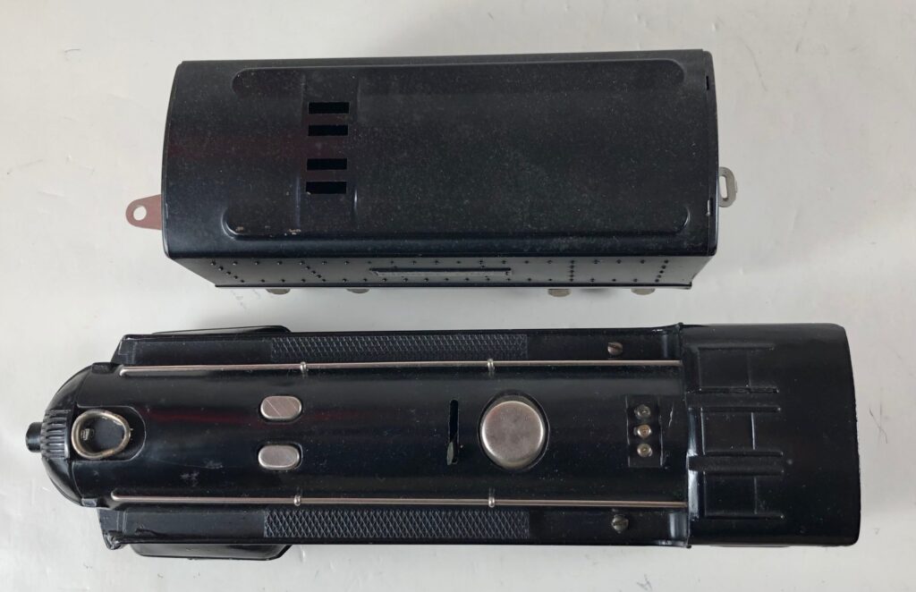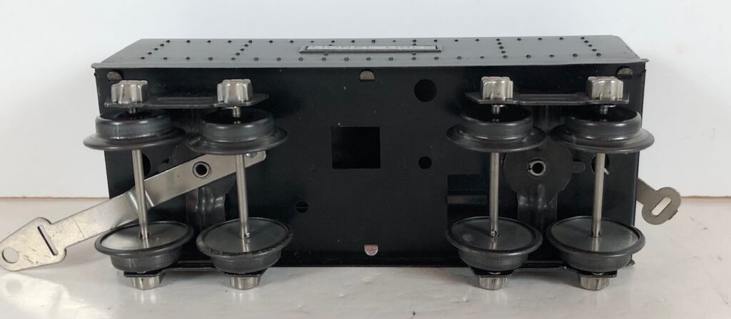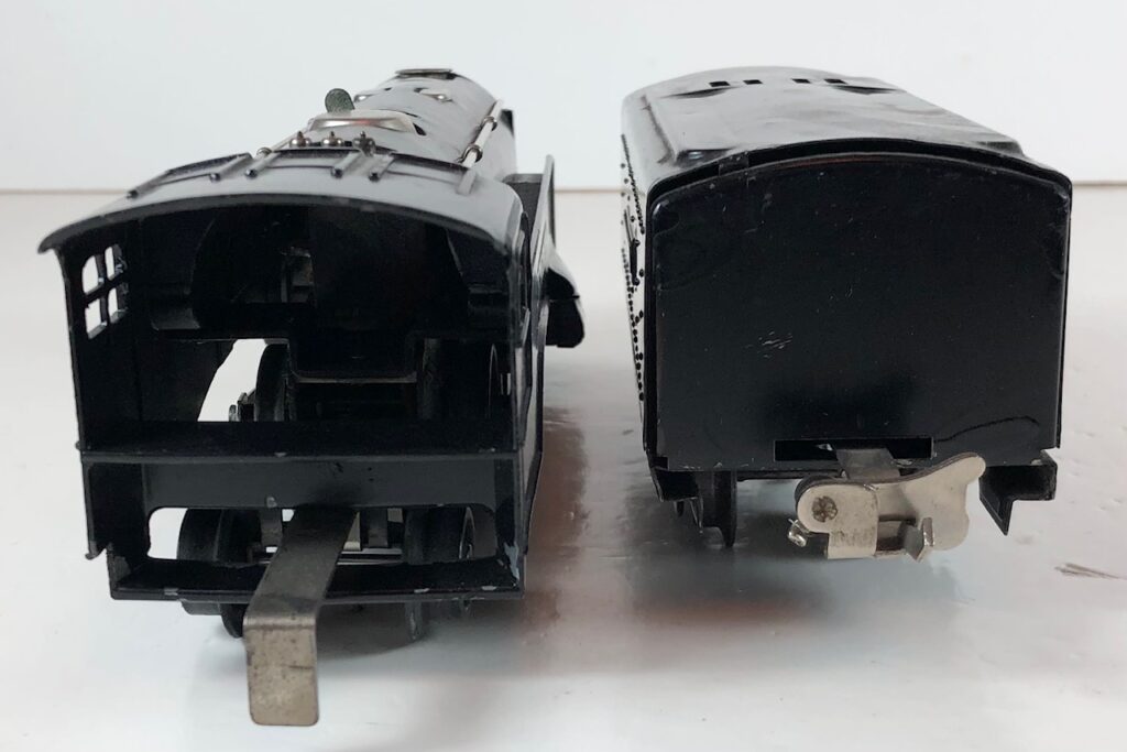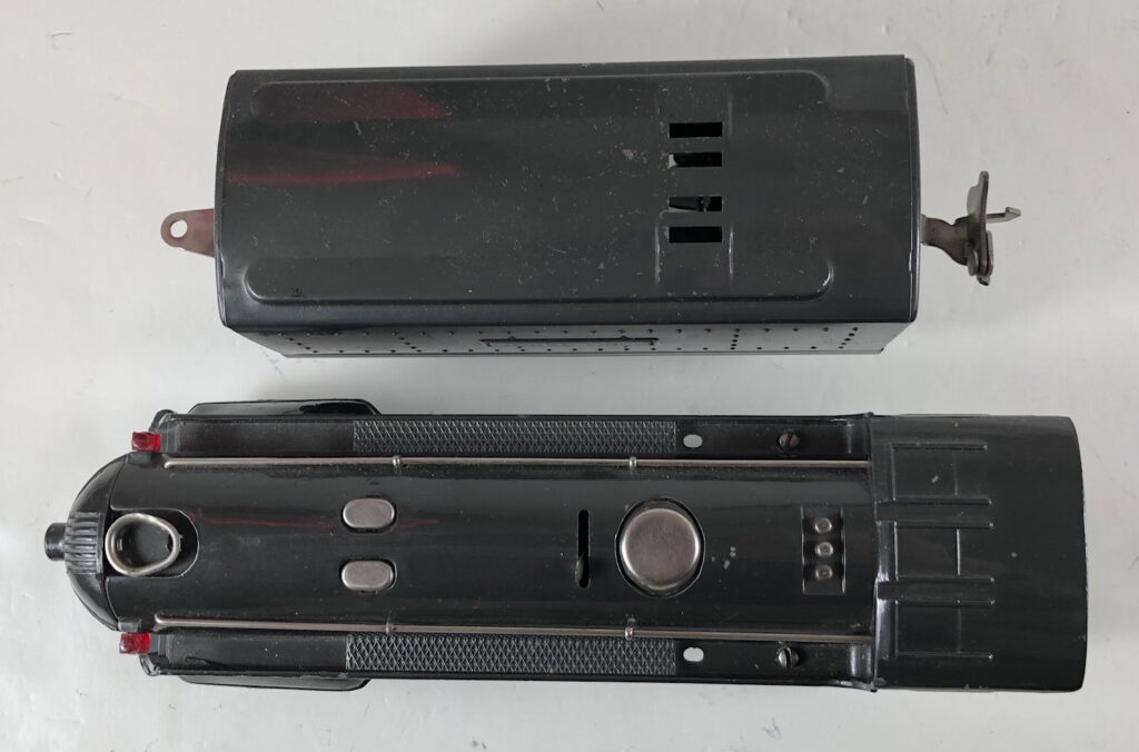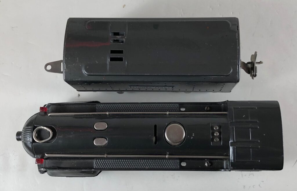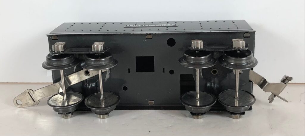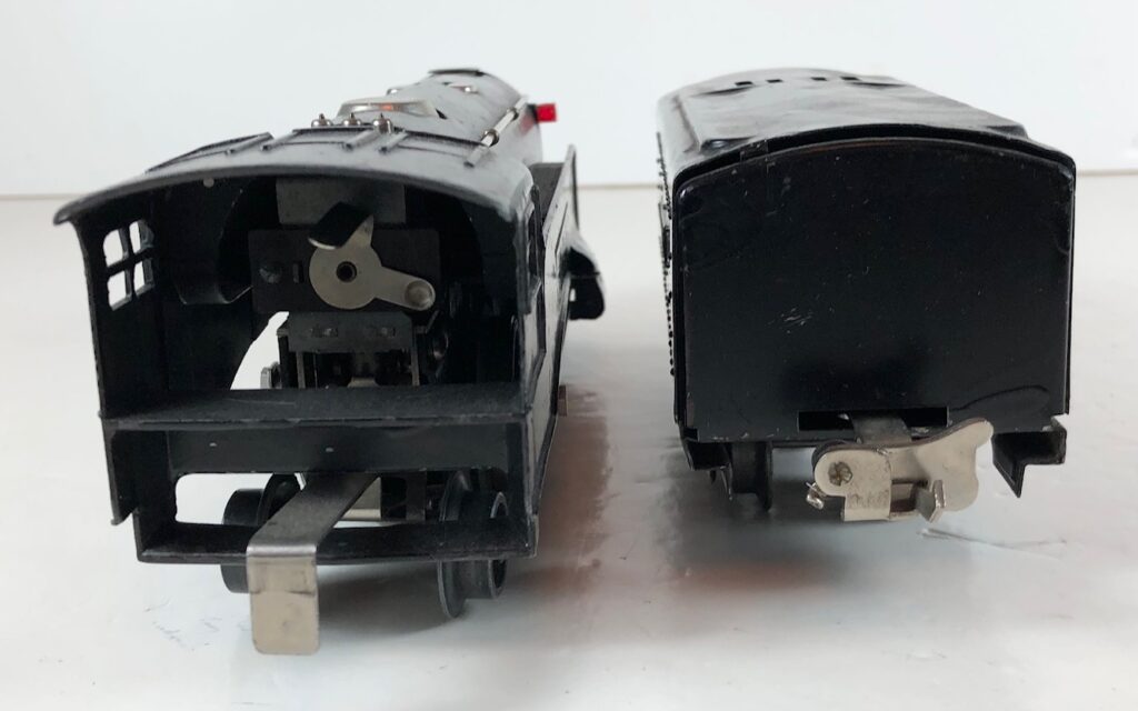 The No. 289E Steam Locomotive in gunmetal gray was paired with a No. 1689T Tender. The No. 289E Locomotive in black was either paired with a 1588W Tender or a No. 1689W Tender. The 1689T/W Tenders and the No. 1588W Tenders have a square sheet metal body and latch couplers. The tenders have an aluminum “Lionel Lines” plate on the sides and no other trim. The No. 1689T/W Tenders have two four-wheel trucks. The No. 1588W Tender has four wheels. The No. 289E / 1689T/W Steam engine and tender combined measure 16-inches in total length.