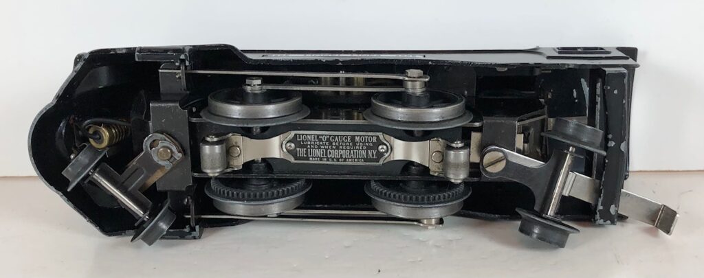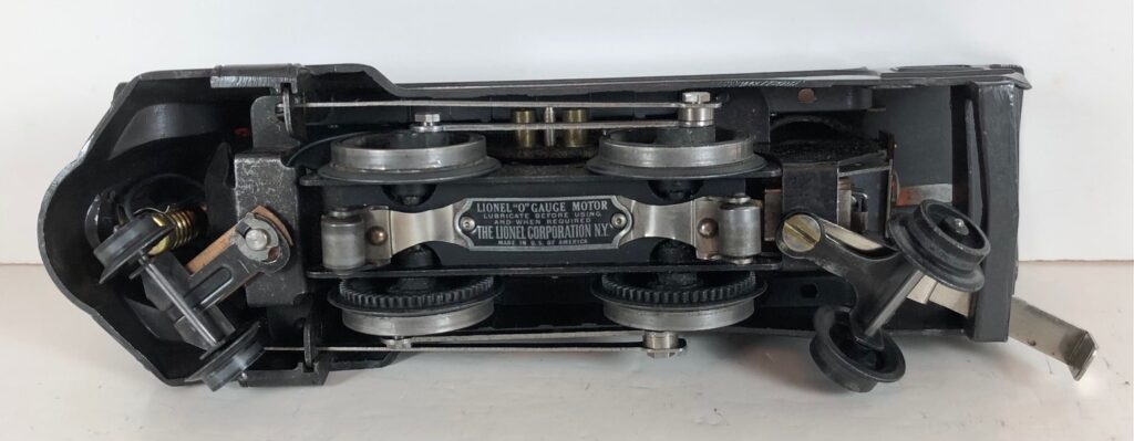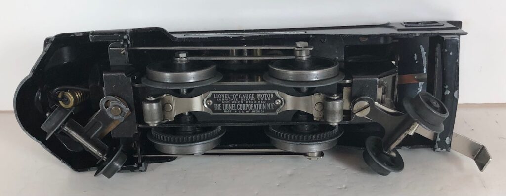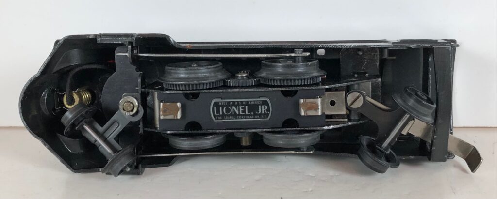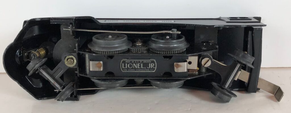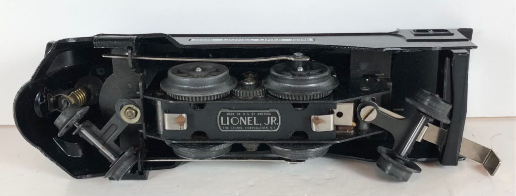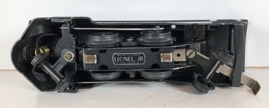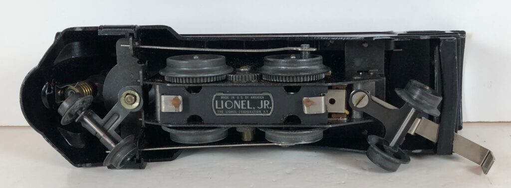 The locomotive has nickel trim, aluminum plates with the number and “Lionel Lines” on the sides of the engine and a brass circle “L” plate on the nose of the engine. The No. 1689E Steam Locomotive has an operating headlight, two red plastic marker lights (gray locomotives) and a remotely operated reverse with a lever on the top of the boiler that engages or disengages the reversing unit.
