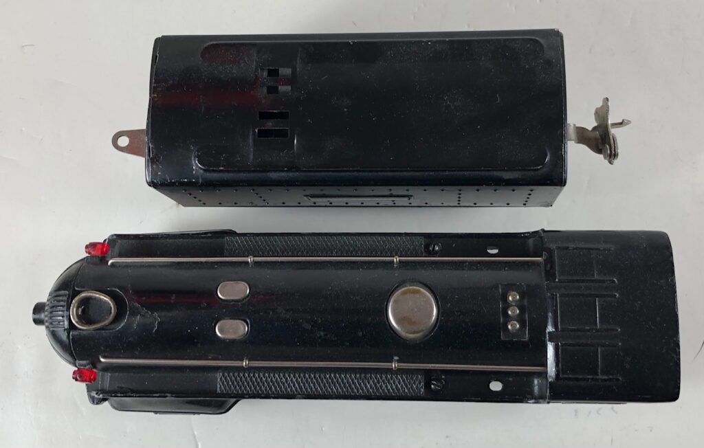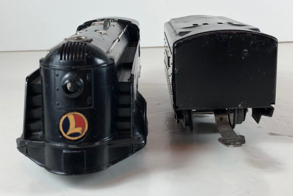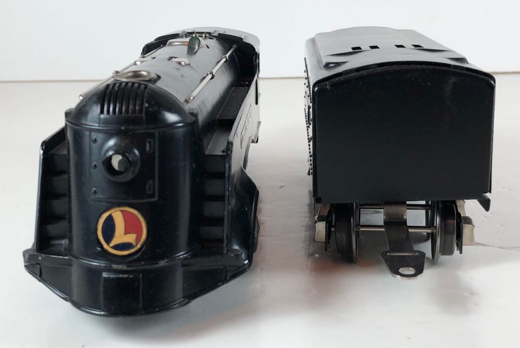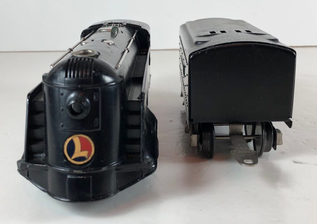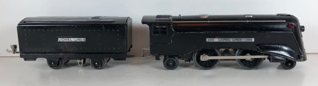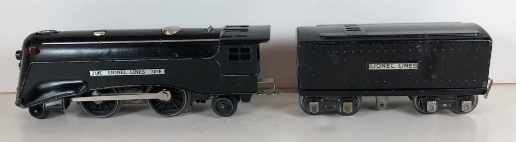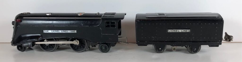 3. No. 289E / 1689W 2-4-2 Steam Locomotive in black with nickel trim, aluminum plates on the sides of the body and a brass circle “L” plate on the nose (1936-1937). The No. 1689W Tender is black with nickel plates on the sides of the tender. The tender has nickel journals and a hook and slot coupler.