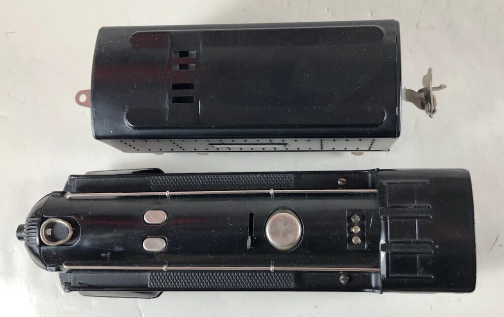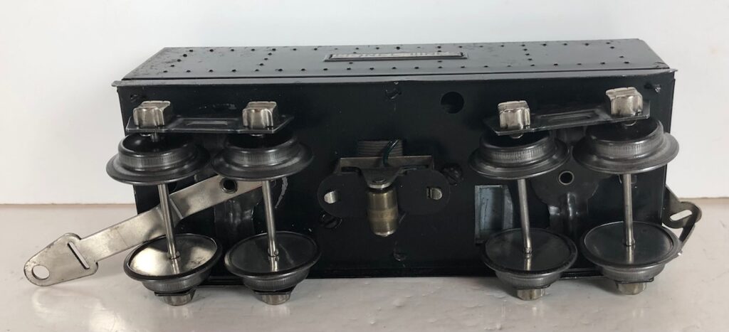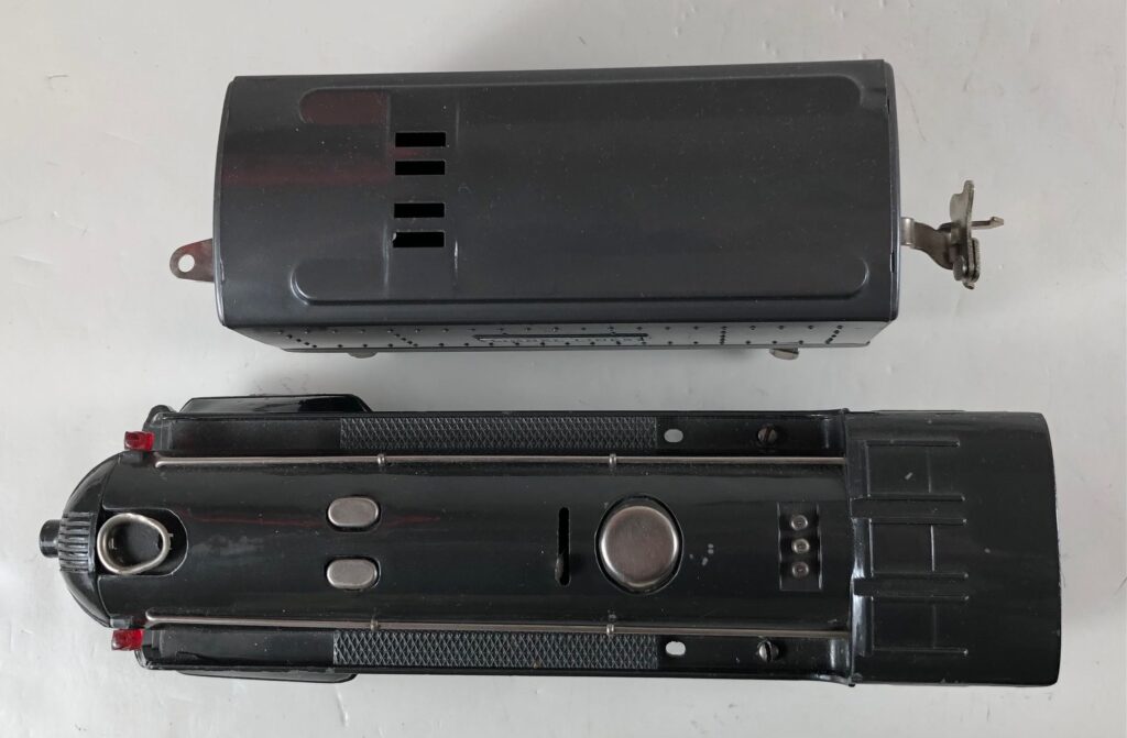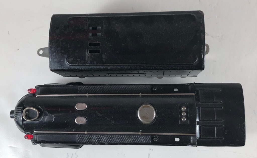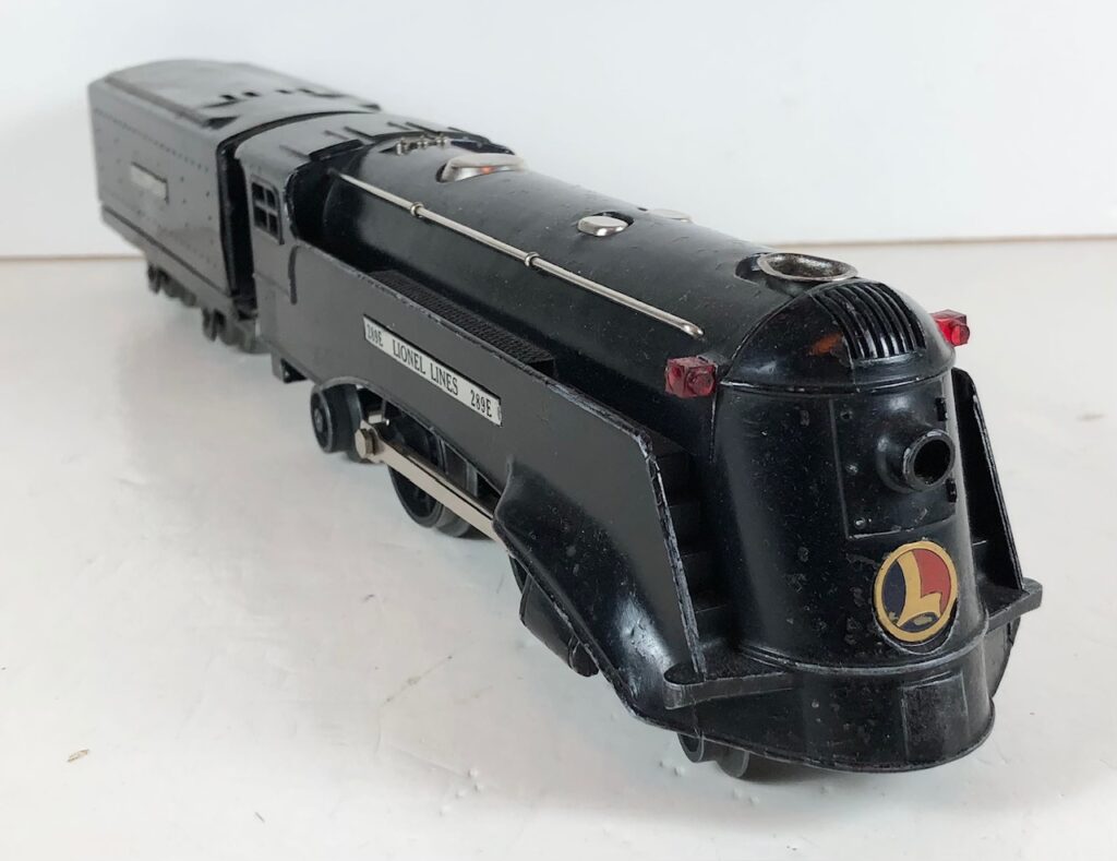 The locomotive has nickel trim, aluminum plates with the number and “Lionel Lines” on the sides of the engine and a brass or aluminum circle “L” plate on the nose of the engine. The No. 289E Steam Locomotive has an operating headlight, two red plastic marker lights and a remotely operated reverse with a lever on the top of the boiler that engages or disengages the reversing unit.