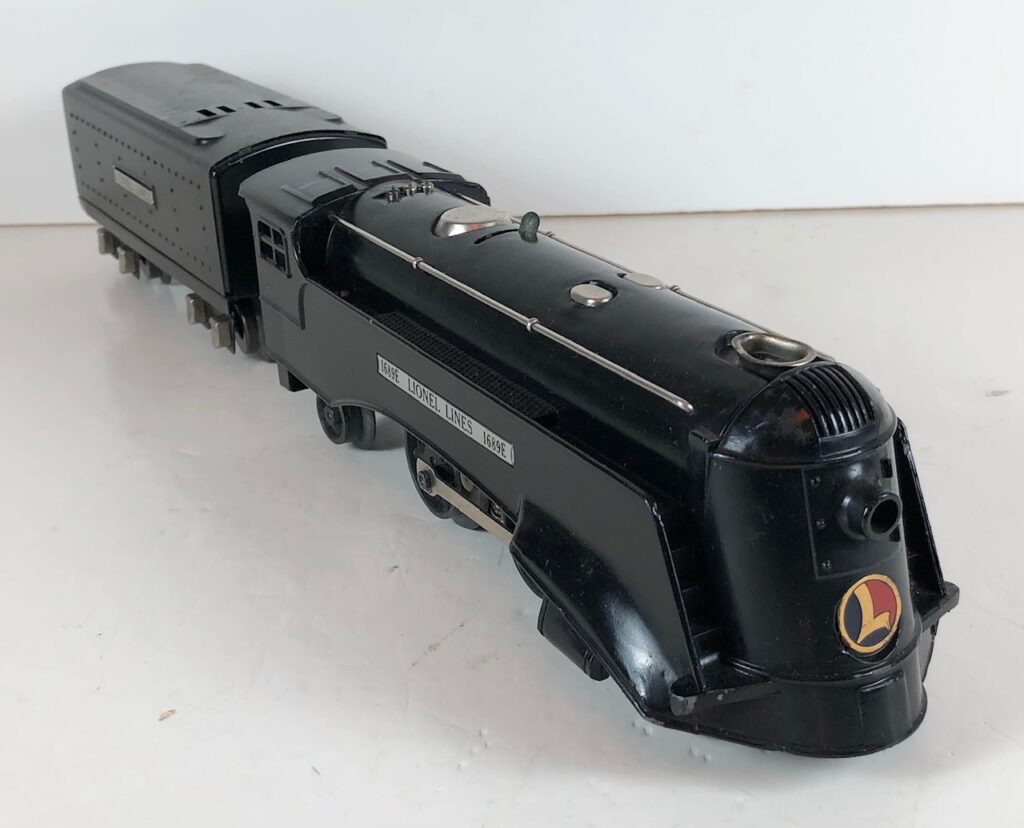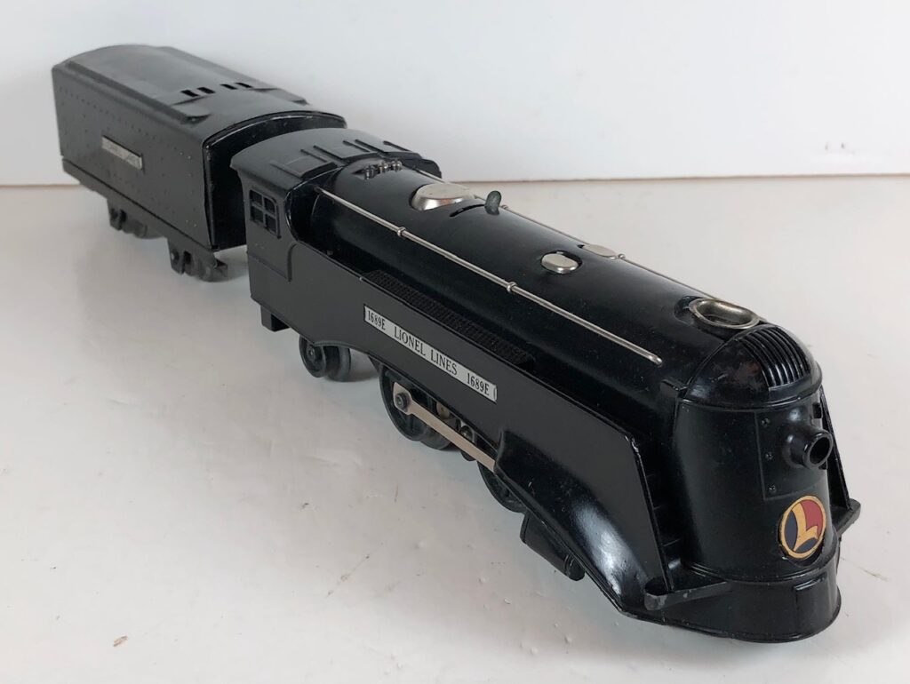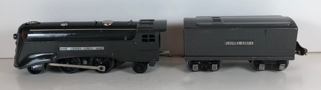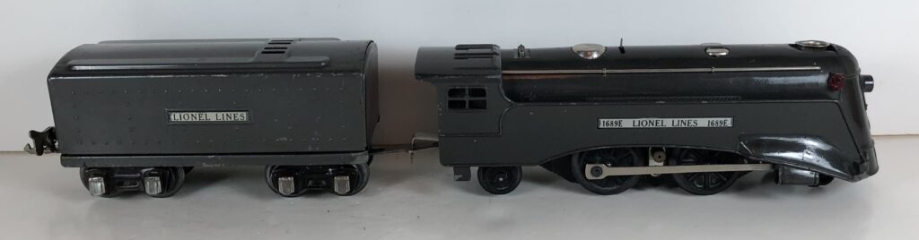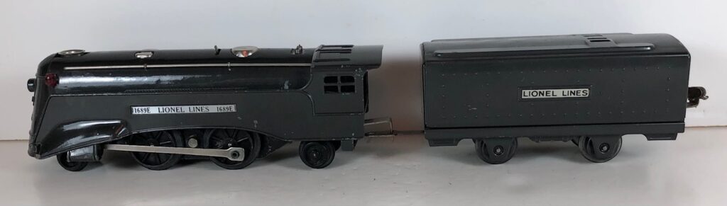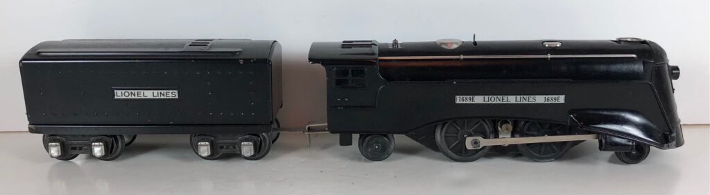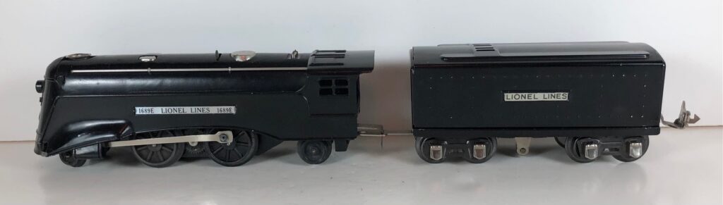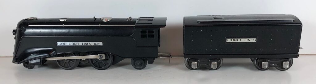 The No. 1689E Steam Locomotive was typically paired with a No. 1689T/W Tender. However, the locomotive was also paired with a No. 1588T/W Tender in a very few uncataloged sets. The 1689T/W Tenders and the No. 1588T/W Tenders have a square sheet metal body and latch couplers. The tenders have an aluminum “Lionel Lines” plate on the sides and no other trim. The No. 1689T/W Tenders have two four-wheel trucks. The No. 1588T/W Tenders have four wheels. The No. 1689E / 1689T/W Steam engine and tender combined measure 16-inches in total length.