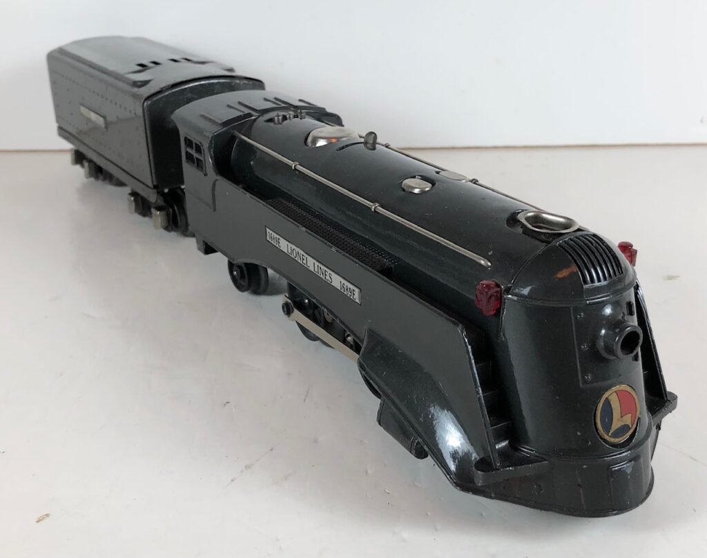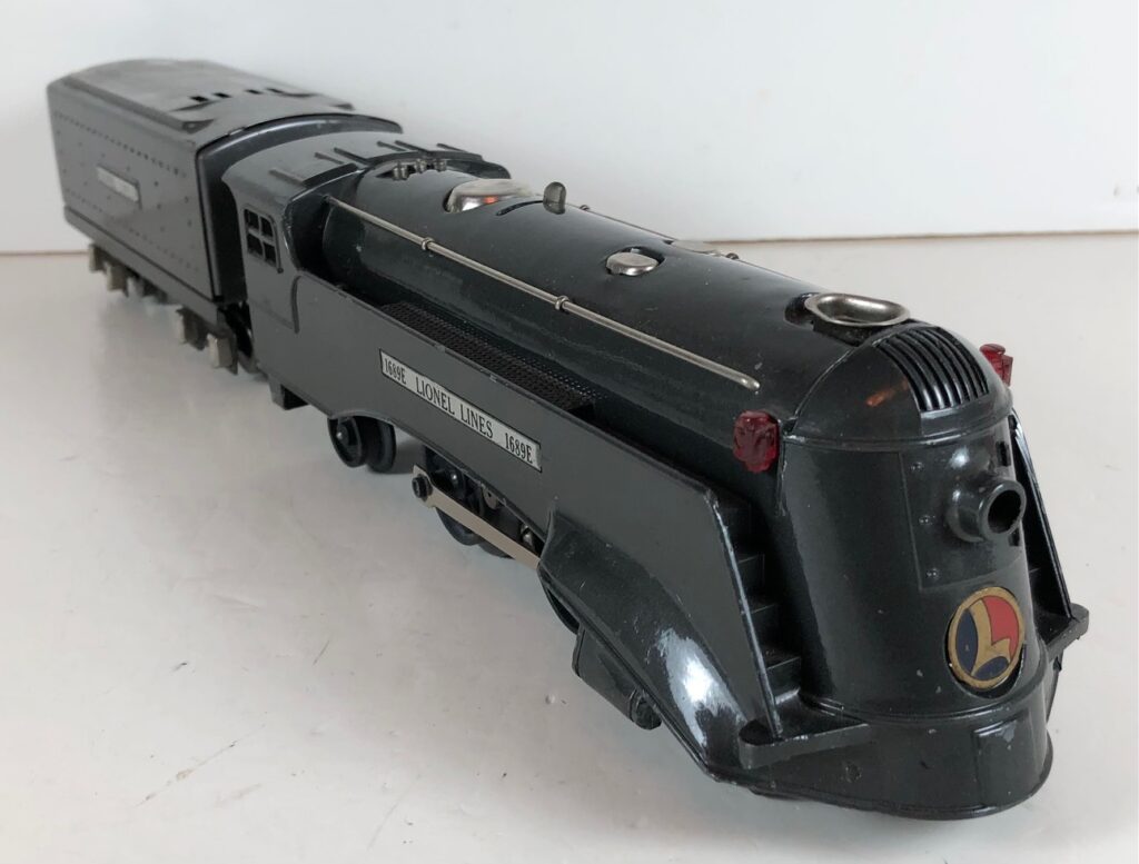 The Lionel No. 1689E 2-4-2 “Commodore Vanderbilt” Steam Locomotive was introduced in 1936 and was issued through 1937. The No. 1689E Locomotive was only included in one cataloged passenger set and one cataloged freight set. However, it was included as a component of many uncataloged sets during this period. The locomotive was loosely based on the New York Central “Commodore Vanderbilt” streamlined steam locomotive used for the Twentieth Century Limited. The No. 1689E Steam Locomotive was very similar to the No. 289E Steam Locomotive and utilized a one piece diecast body. The only difference between the two locomotives is that the No. 289E Locomotive was powered by an “O” Gauge motor, whereas the No. 1689E Locomotive utilized a “Lionel Junior” or “027” motor.