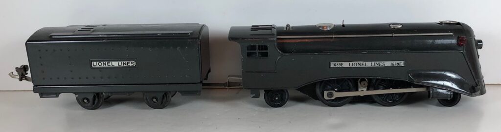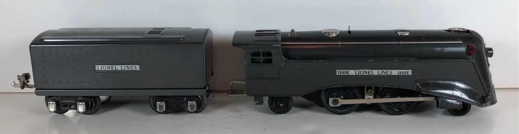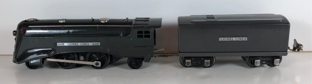 2. No. 1689E / 1689T 2-4-2 Steam Locomotive in gunmetal gray with nickel trim, aluminum plates on the sides of the body and a brass circle “L” plate on the nose (1936). The No. 1689T Tender is gunmetal gray with nickel plates on the sides of the tender. The tender has nickel journals and a latch coupler.