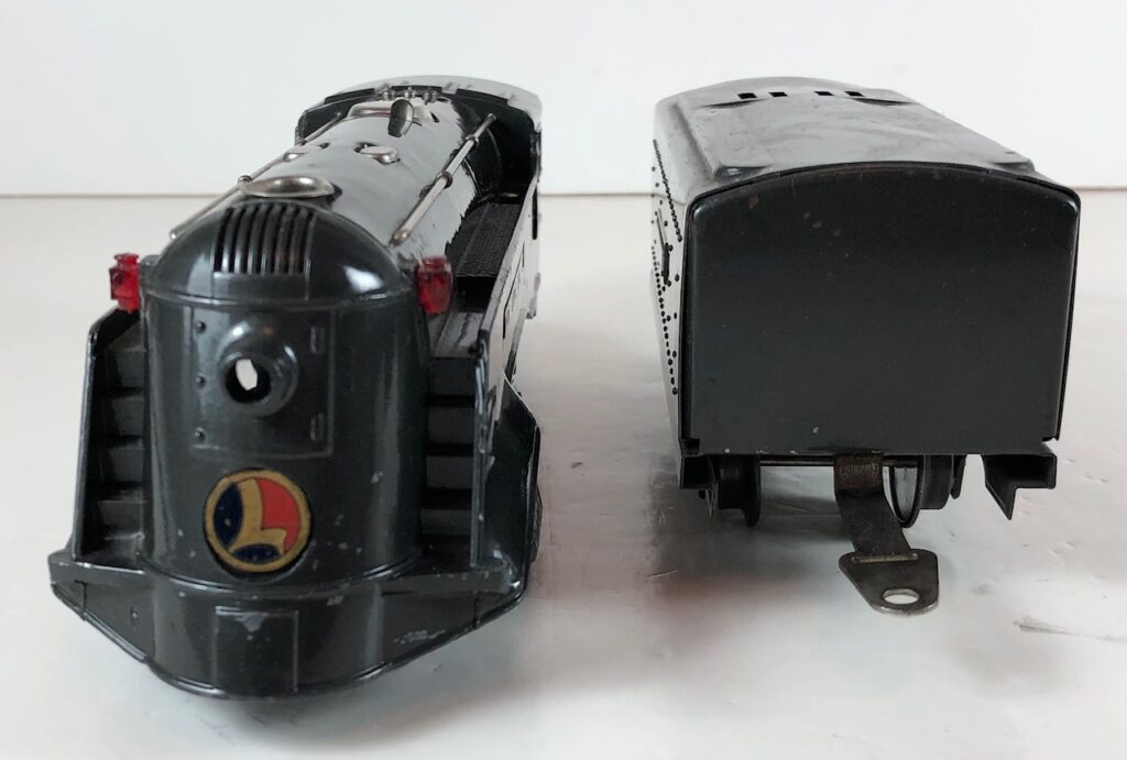 3. No. 1689E / 1588T 2-4-2 Steam Locomotive in gunmetal gray with nickel trim, aluminum plates on the sides of the body and a brass circle “L” plate on the nose (1936). The No. 1588T Tender is gunmetal gray with nickel plates on the sides of the tender. The tender has no journals and a latch coupler.