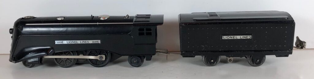 5. No. 1689E / 1689T 2-4-2 Steam Locomotive in black with nickel trim, aluminum plates on the sides of the body and a brass circle “L” plate on the nose (1937). The No. 1689T Tender is black with nickel plates on the sides of the tender. The tender has nickel journals and a latch coupler.