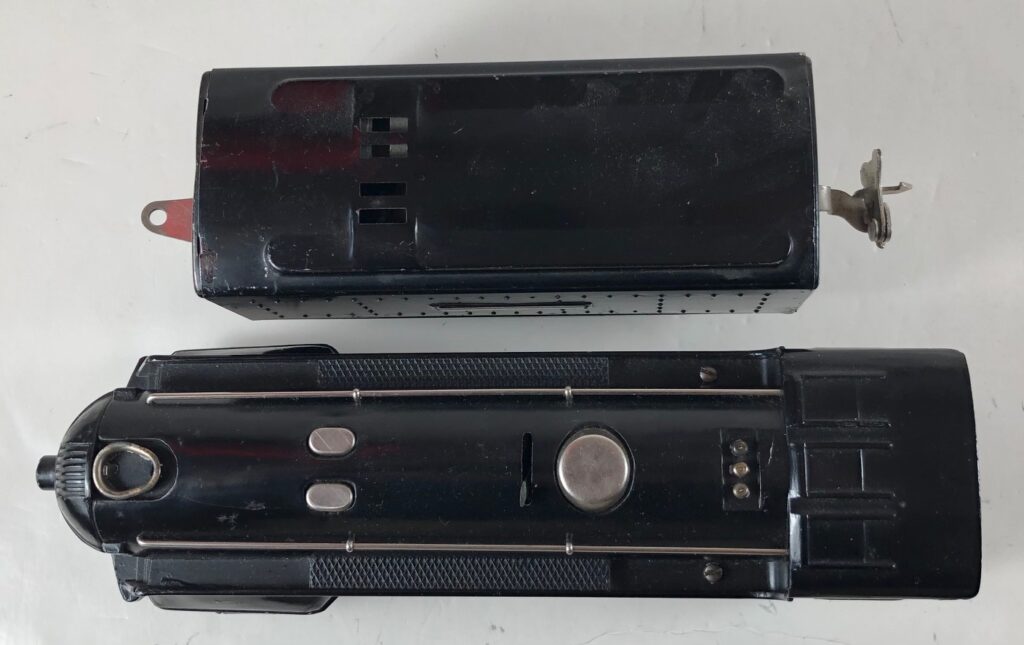 2. No. 289E / 1588W 2-4-2 Steam Locomotive in black with nickel trim, aluminum plates on the sides of the body and a brass circle “L” plate on the nose (1936-1937). The No. 1588W 4-Wheel Tender is black with nickel plates on the sides of the tender. The tender has no journals and a latch coupler.