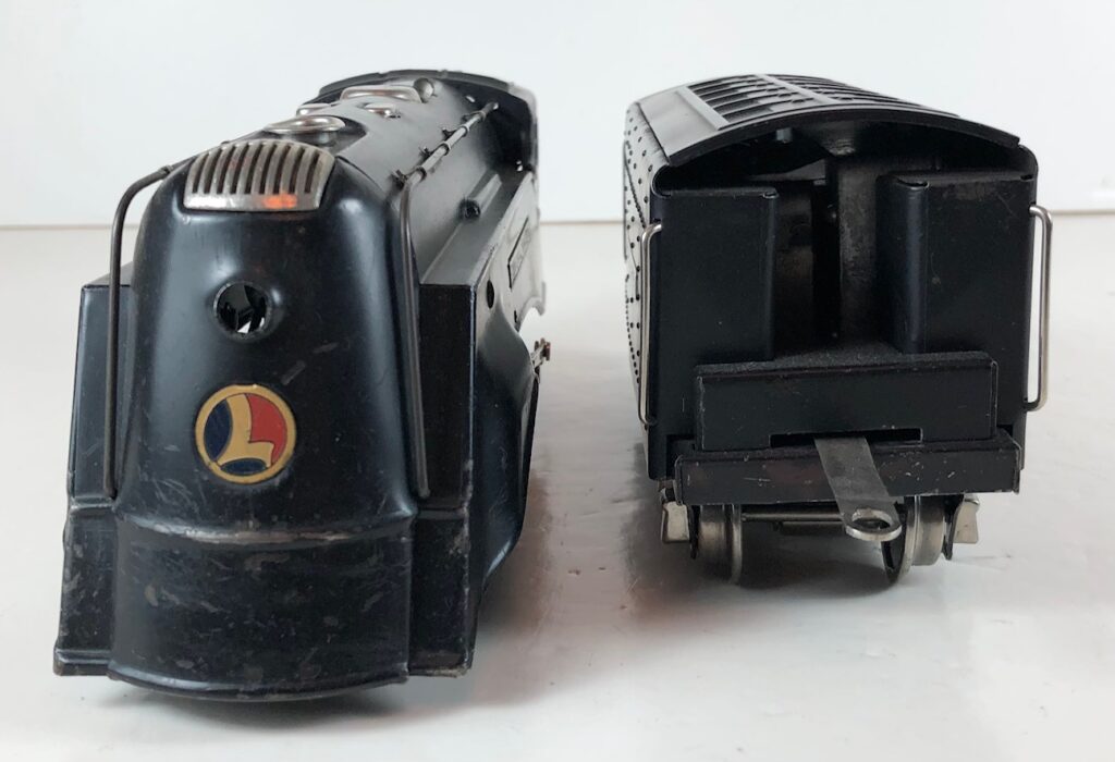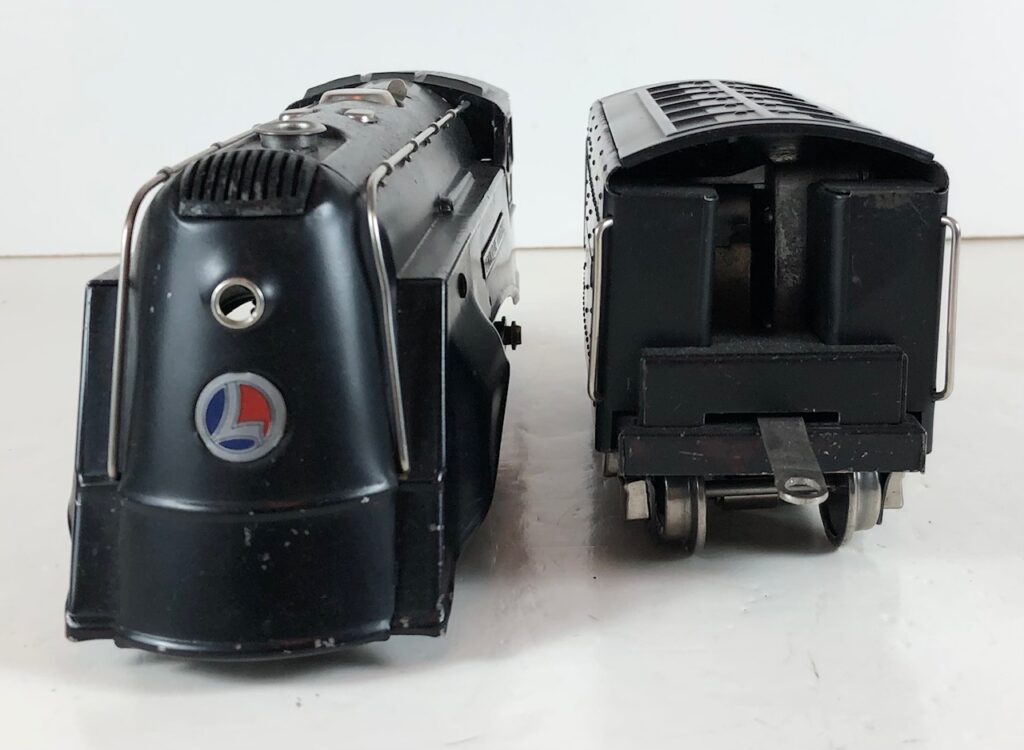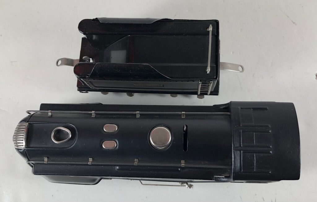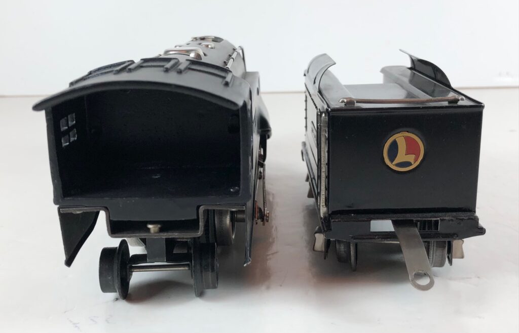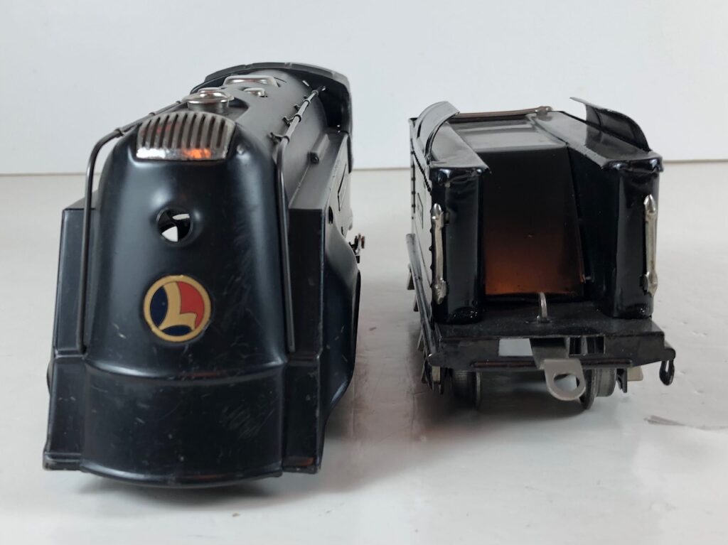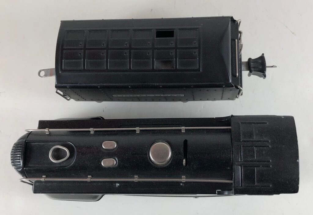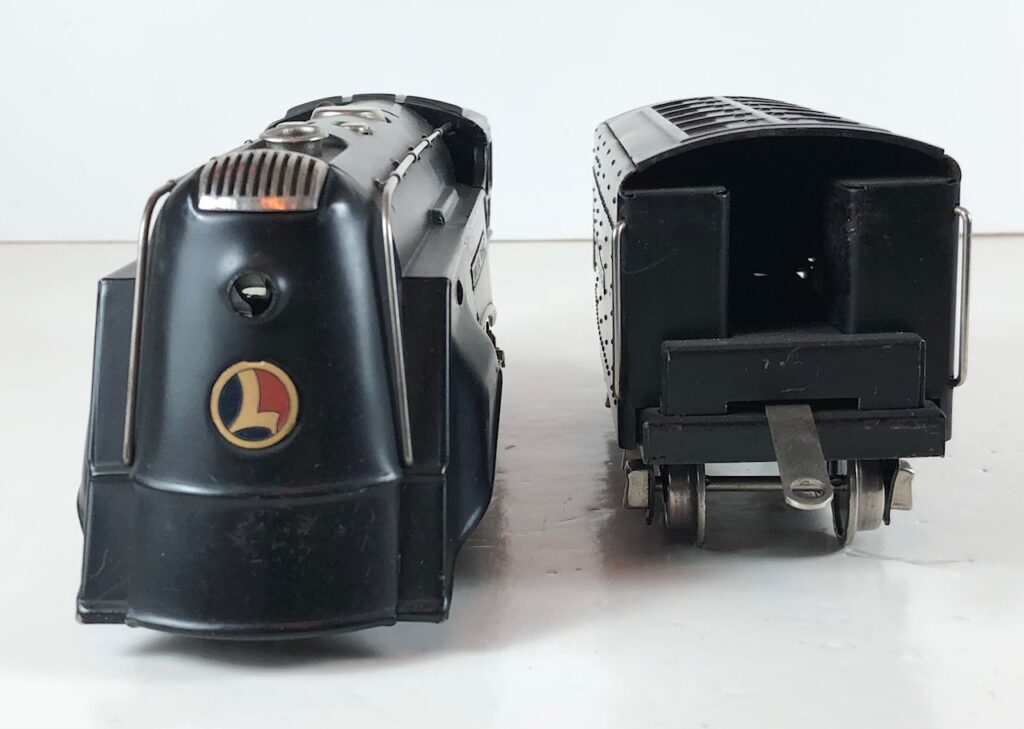 1. No. 265E / 261TX 2-4-2 Steam Locomotive in black with nickel trim, aluminum number plates with black border on the sides of the cab and a brass circle “L” plate on the nose (1935). The engine has black wheels with nickel rims. The No. 261TX Tender is black with nickel trim, brass plates on the sides of the tender and a brass circle “L” plate on the rear. The tender has nickel journals and a drawbar for connection to the streamlined passenger coaches. This locomotive came with the Silver Streak streamlined passenger set.