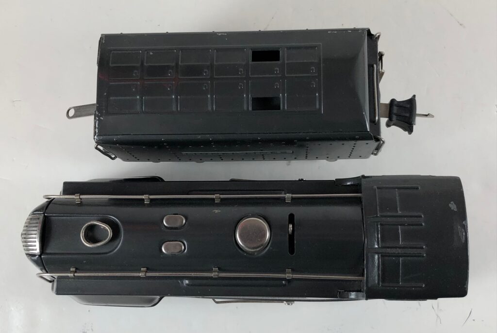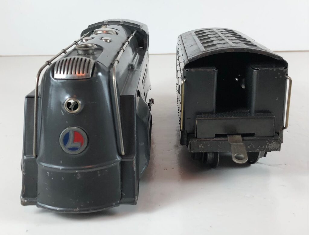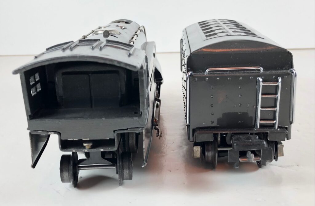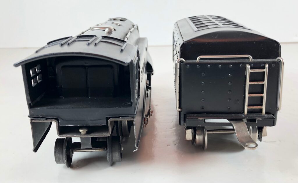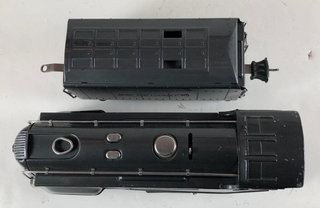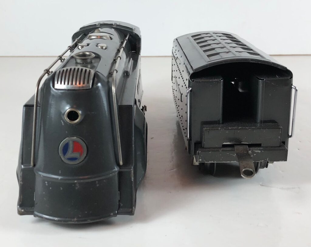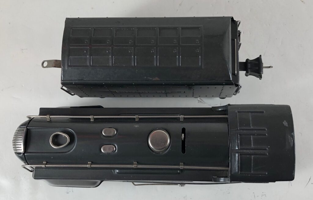 1. No. 265E / 261TX 2-4-2 Steam Locomotive in black with nickel trim, aluminum number plates with black border on the sides of the cab and a brass circle “L” plate on the nose (1935). The engine has black wheels with nickel rims. The No. 261TX Tender is black with nickel trim, brass plates on the sides of the tender and a brass circle “L” plate on the rear. The tender has nickel journals and a drawbar for connection to the streamlined passenger coaches. This locomotive came with the Silver Streak streamlined passenger set.