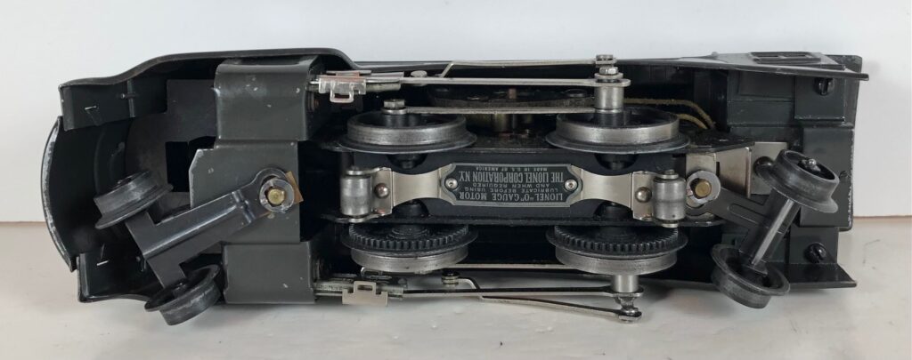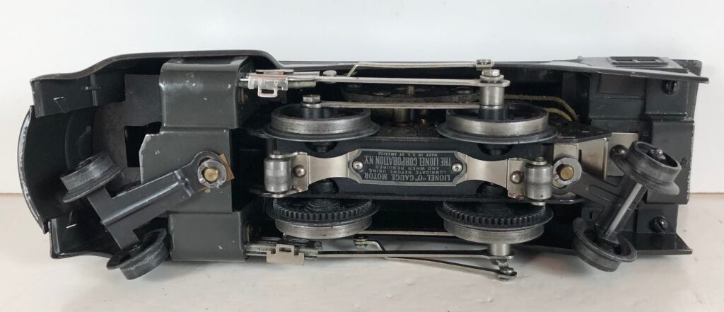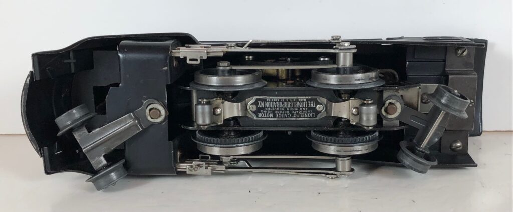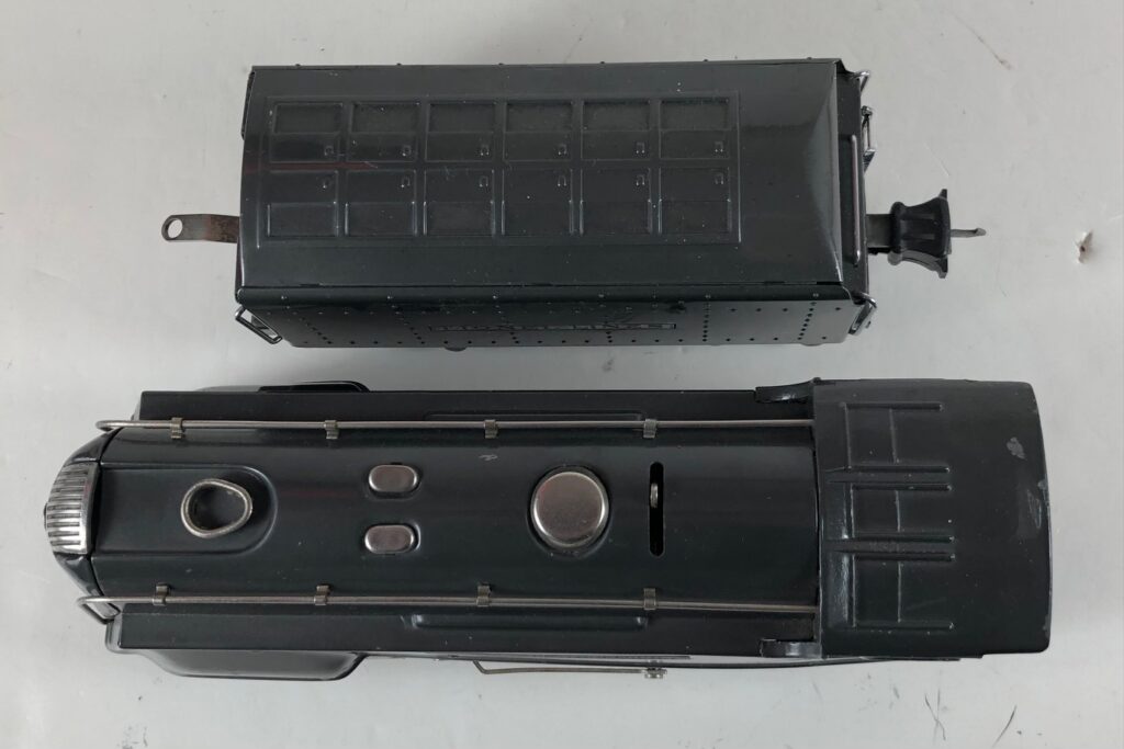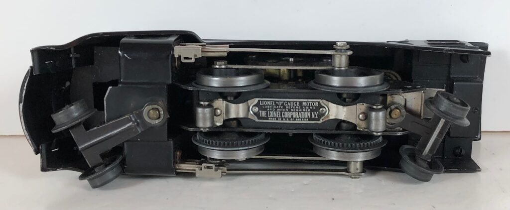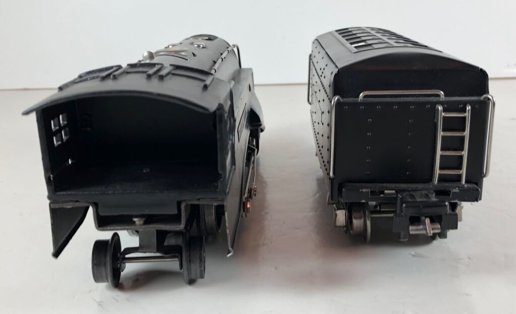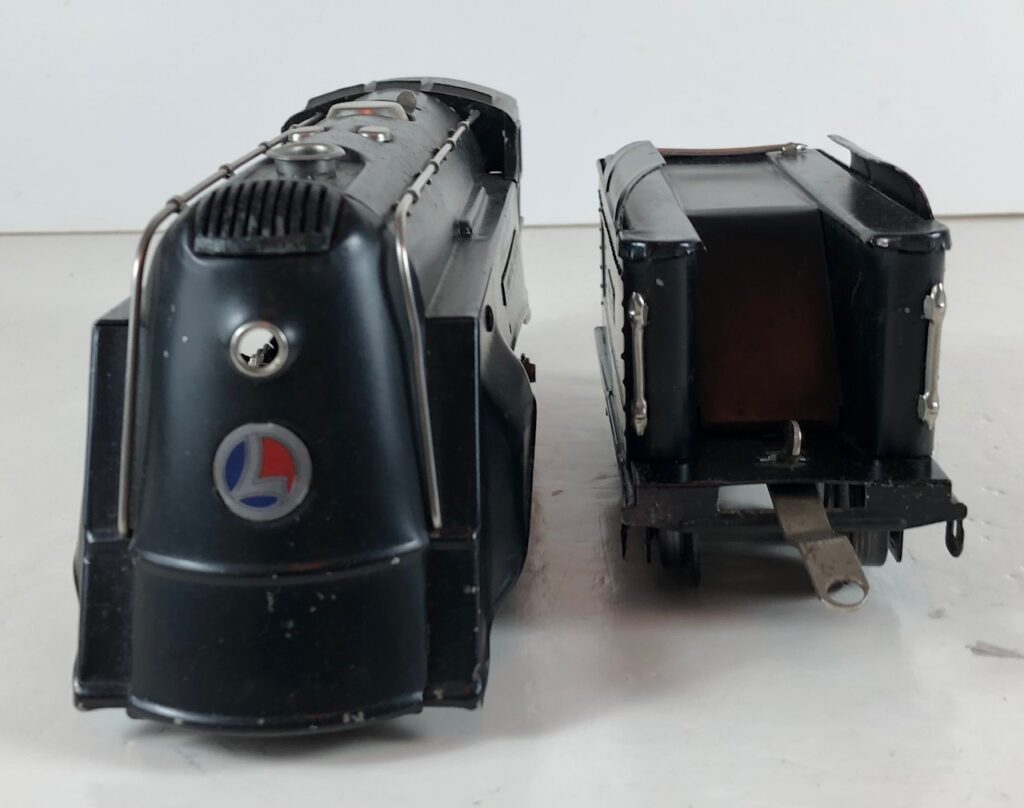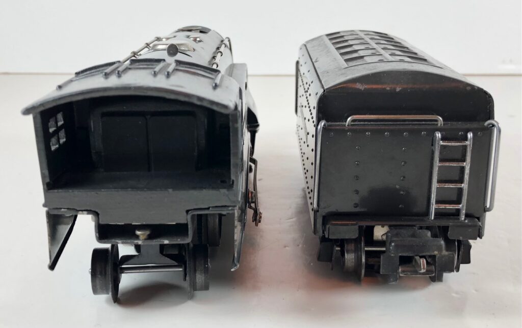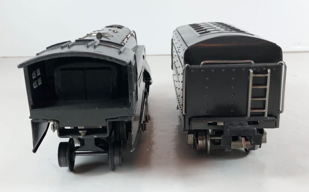 1. No. 265E / 261TX 2-4-2 Steam Locomotive in black with nickel trim, aluminum number plates with black border on the sides of the cab and a brass circle “L” plate on the nose (1935). The engine has black wheels with nickel rims. The No. 261TX Tender is black with nickel trim, brass plates on the sides of the tender and a brass circle “L” plate on the rear. The tender has nickel journals and a drawbar for connection to the streamlined passenger coaches. This locomotive came with the Silver Streak streamlined passenger set.