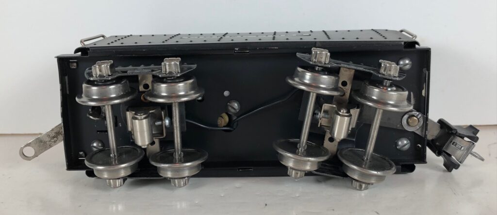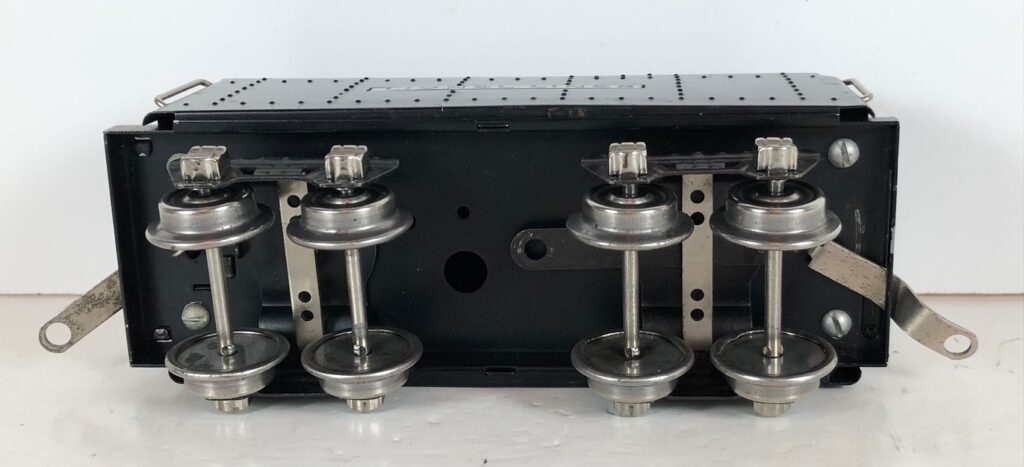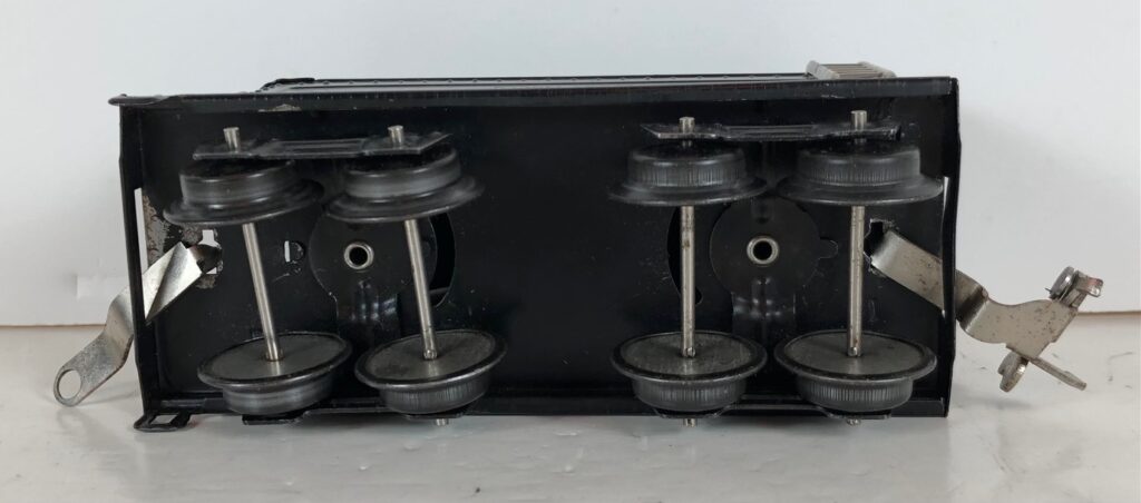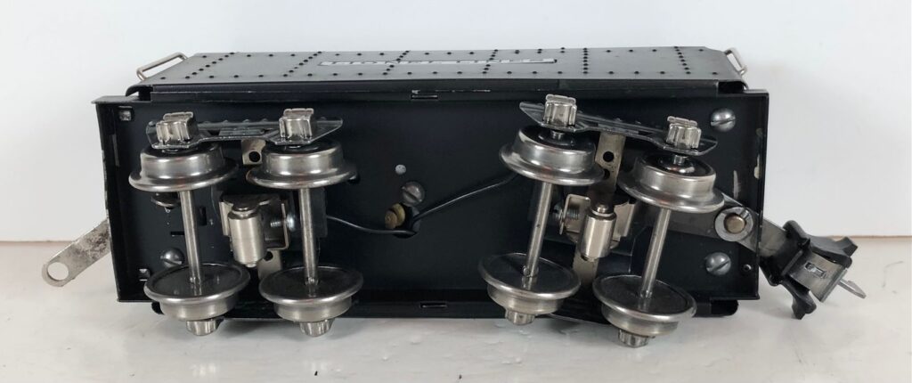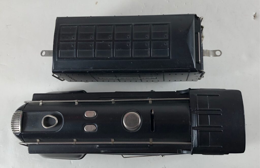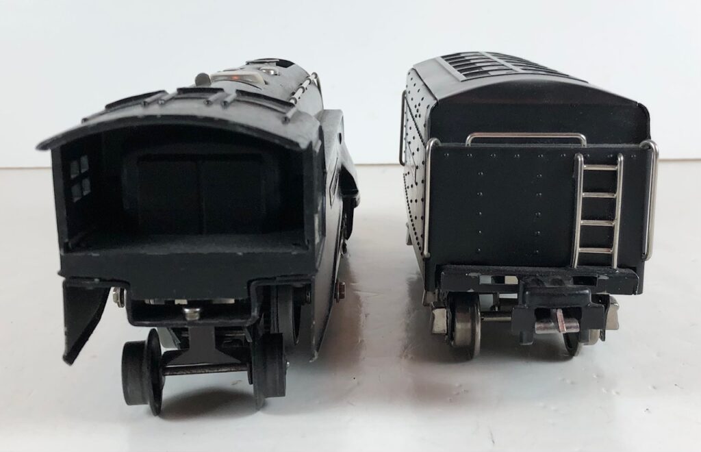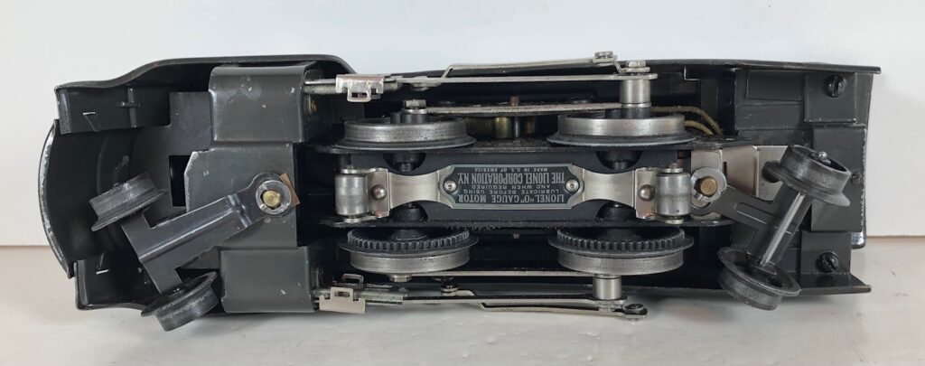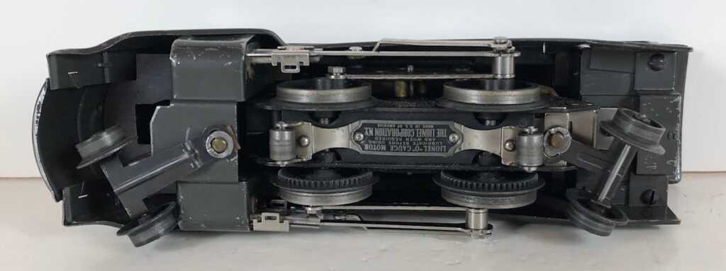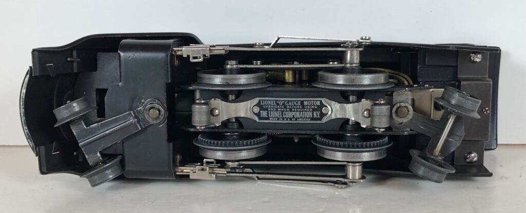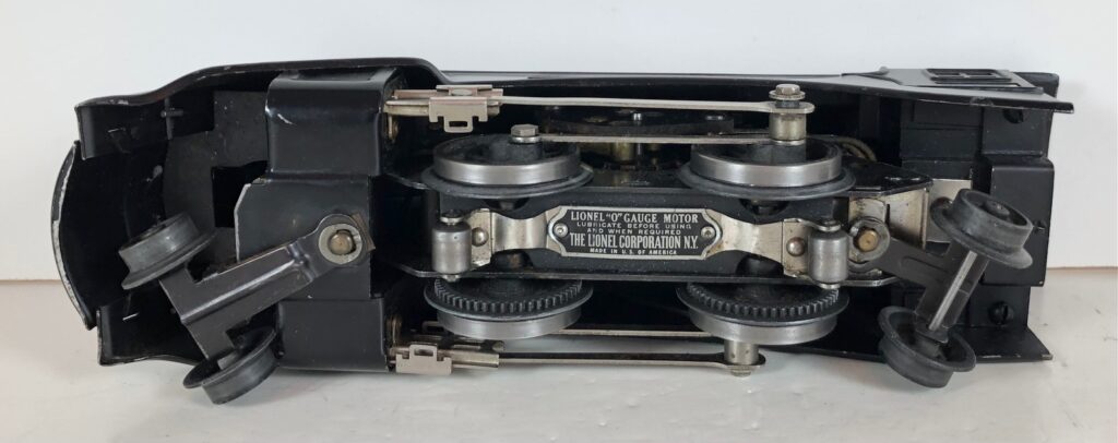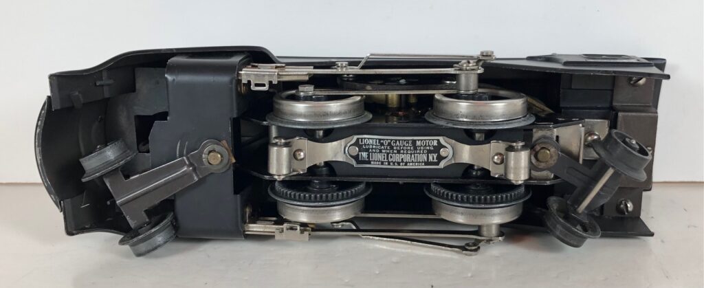 1. No. 265E / 261TX 2-4-2 Steam Locomotive in black with nickel trim, aluminum number plates with black border on the sides of the cab and a brass circle “L” plate on the nose (1935). The engine has black wheels with nickel rims. The No. 261TX Tender is black with nickel trim, brass plates on the sides of the tender and a brass circle “L” plate on the rear. The tender has nickel journals and a drawbar for connection to the streamlined passenger coaches. This locomotive came with the Silver Streak streamlined passenger set.
