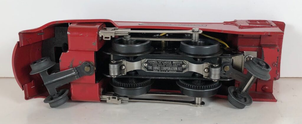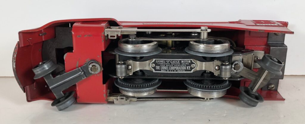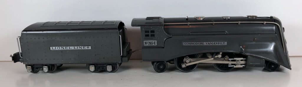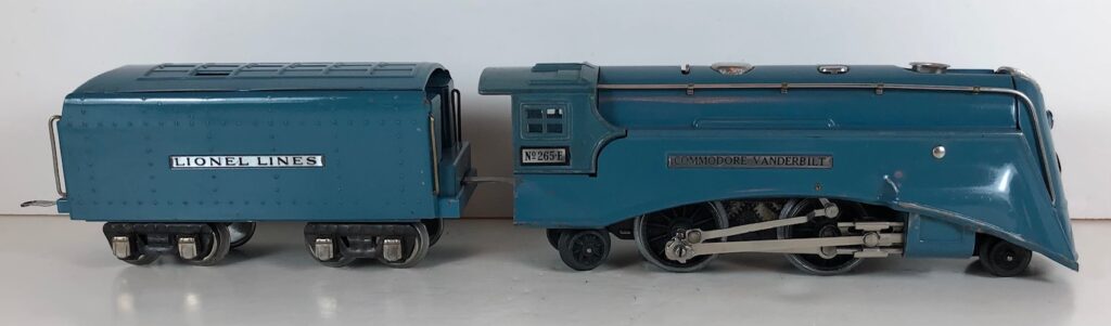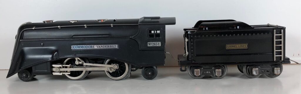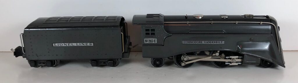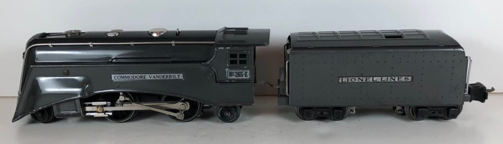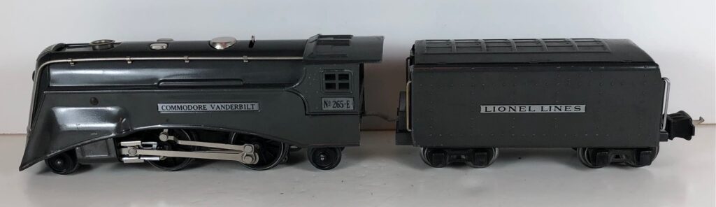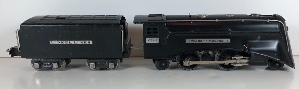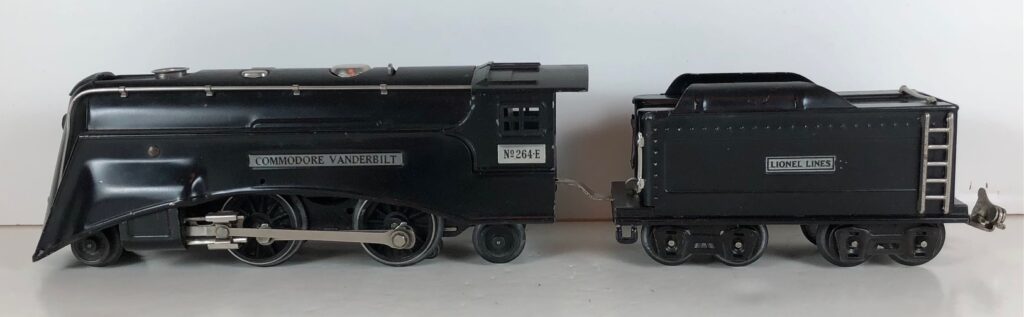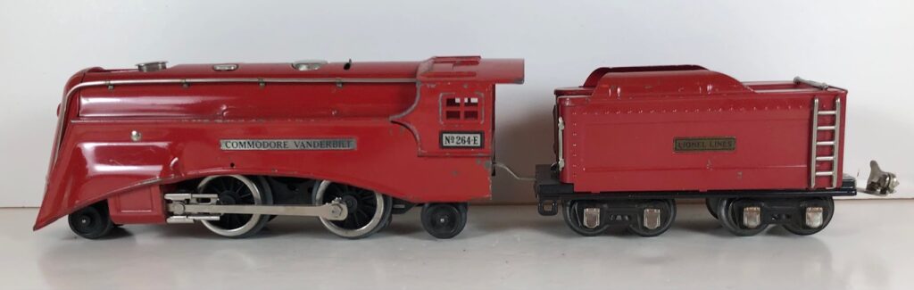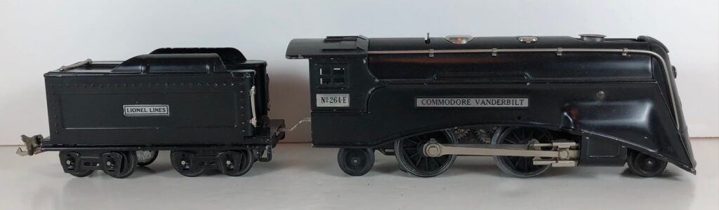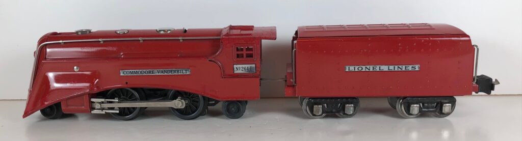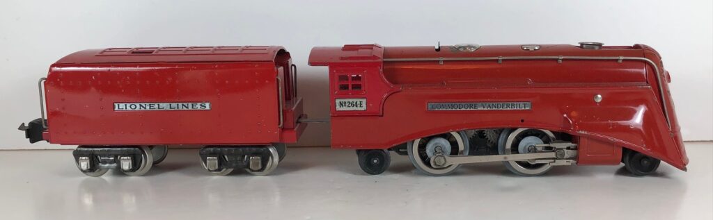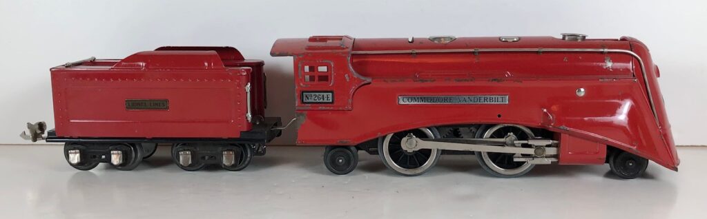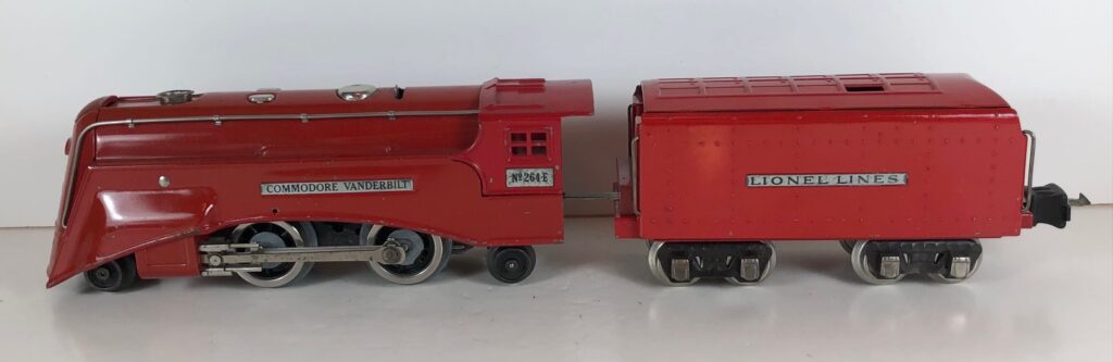 The Lionel No. 264E 2-4-2 “Commodore Vanderbilt” Steam Locomotive was introduced in 1935 and was cataloged in 1935 and in 1936. The locomotive was included as a component of the cataloged “Red Comet” Passenger Set and one cataloged freight set. The locomotive was also included as a component of several uncataloged passenger sets from 1935 through 1940. The locomotive was based on the New York Central “Commodore Vanderbilt” streamlined steam locomotive used for the Twentieth Century Limited. The No. 264E Steam Locomotive utilized a sheet metal boiler and a diecast cab and steam chest.