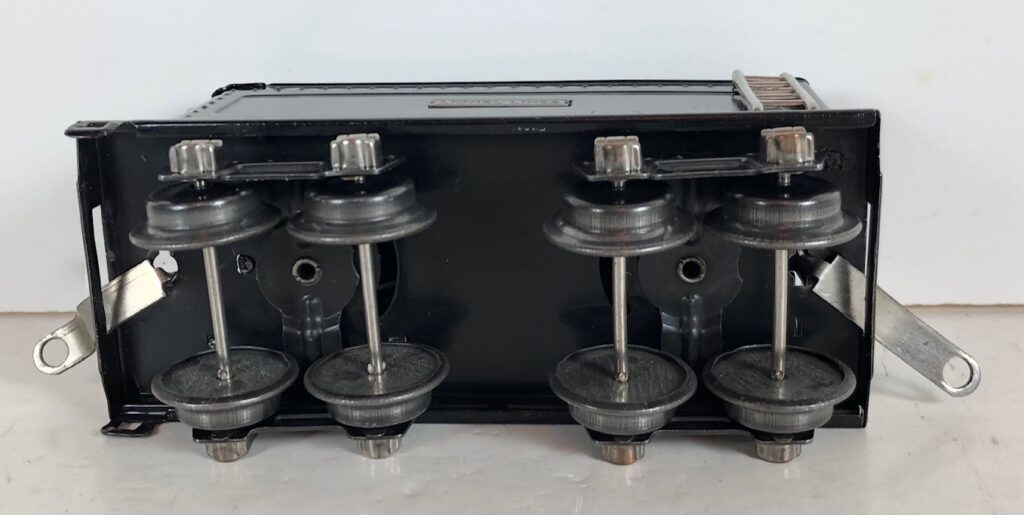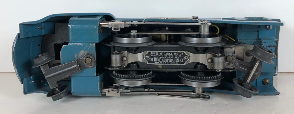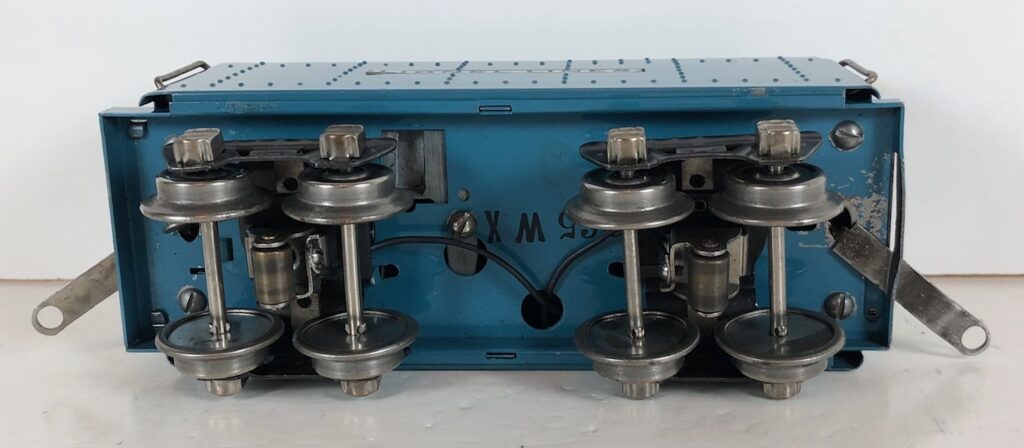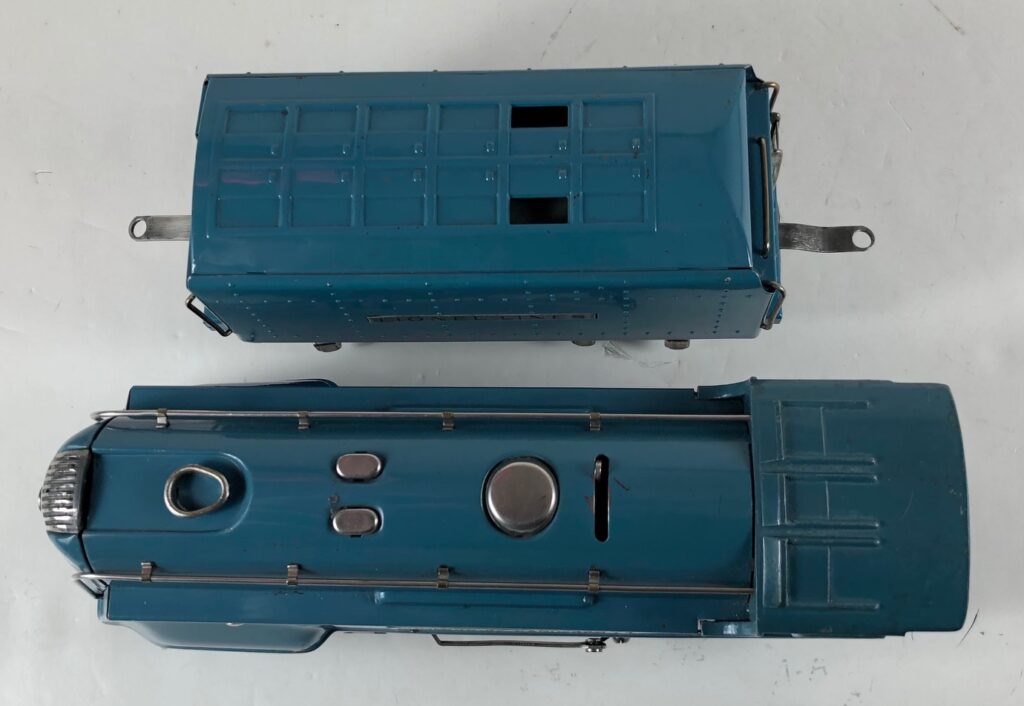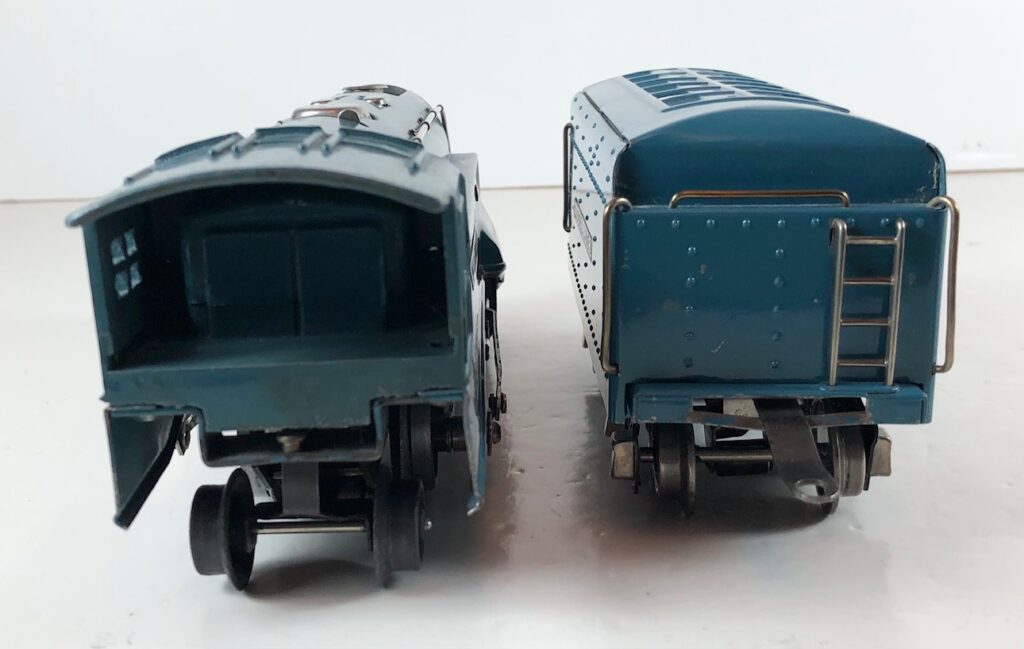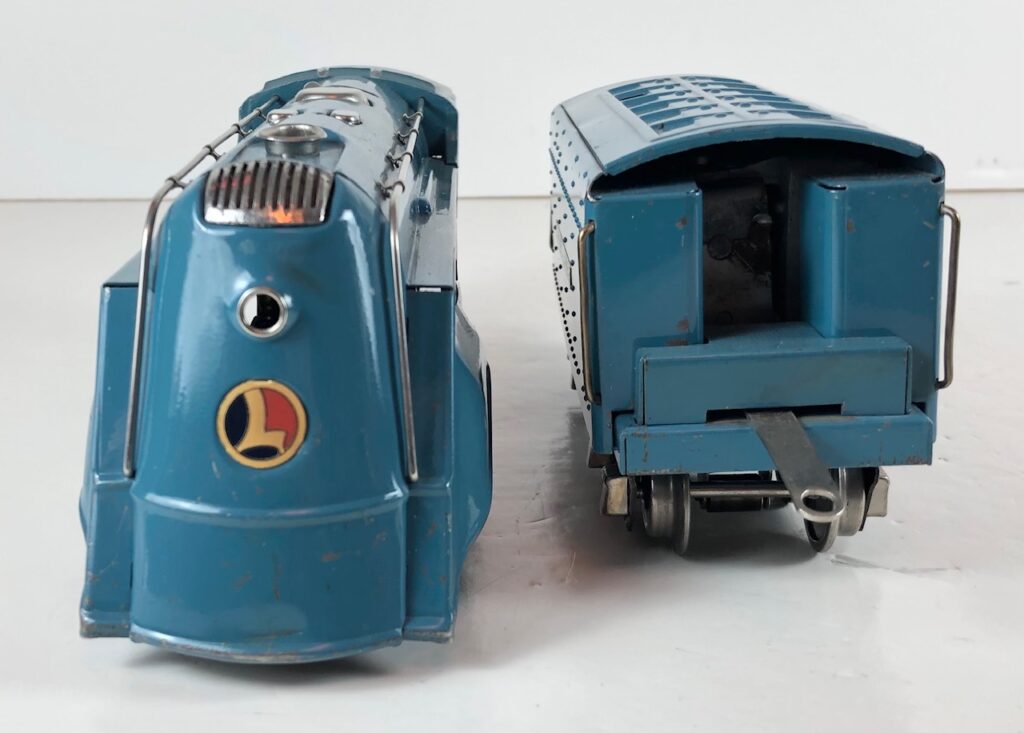 3. No. 265E / 265WX 2-4-2 Steam Locomotive in light blue with nickel trim, aluminum number plates with black border on the sides of the cab and a brass circle “L” plate on the nose (1936-1938). The engine has black wheels with steel rims. The No. 265WX Tender is light blue with nickel trim and aluminum plates on the sides of the tender. The tender has nickel journals and a drawbar for connection to the streamlined passenger coach. This locomotive came with the Blue Streak streamlined passenger set.