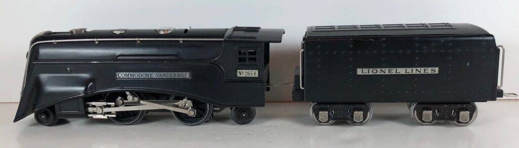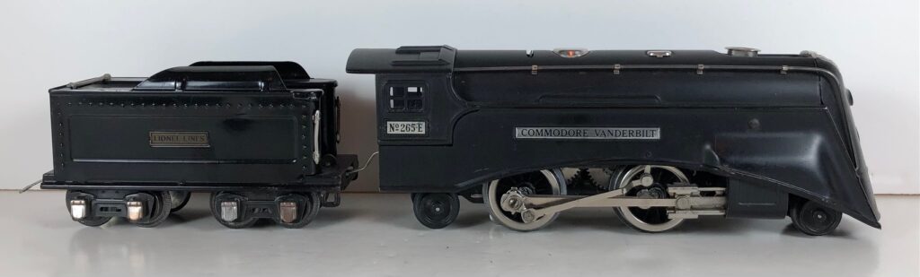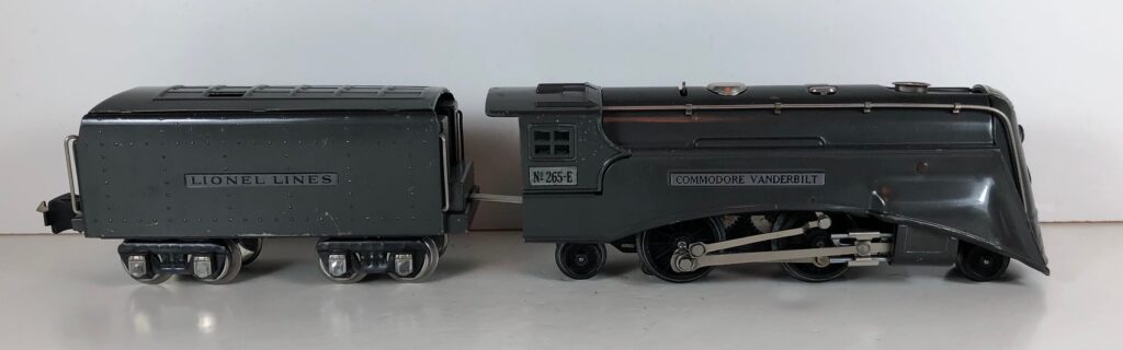 The No. 265E Steam Locomotive has nickel trim, aluminum plates with the number on the sides of the cab, “Commodore Vanderbilt” on the sides of the boiler and a circle “L” plate on the nose of the engine. Some of the number plates had a unique black border around the number. The locomotive has an operating headlight and a remotely operated reverse with a lever on the top of the boiler that engages or disengages the reversing unit.