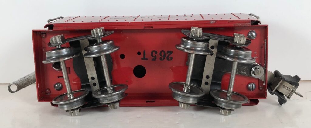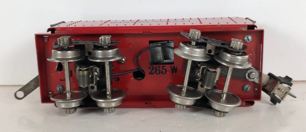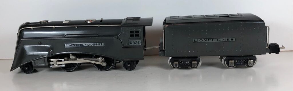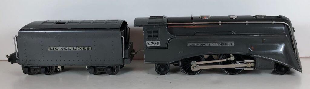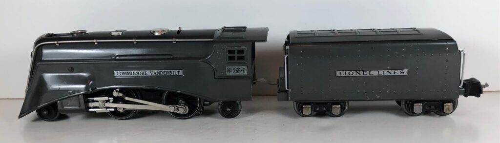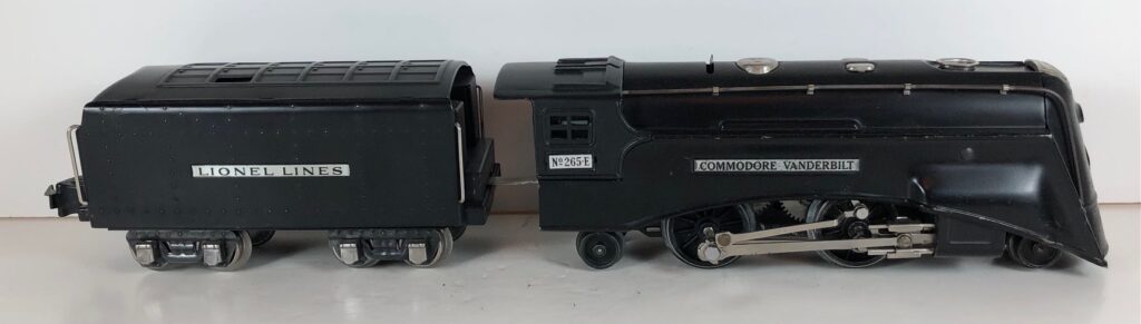 The No. 265E Steam Locomotive was paired with a No. 261TX Tender in the 1935 Silver Streak Set. Most other cataloged and uncataloged sets utilized a No. 265T/W Tender. The last No. 265E Locomotives