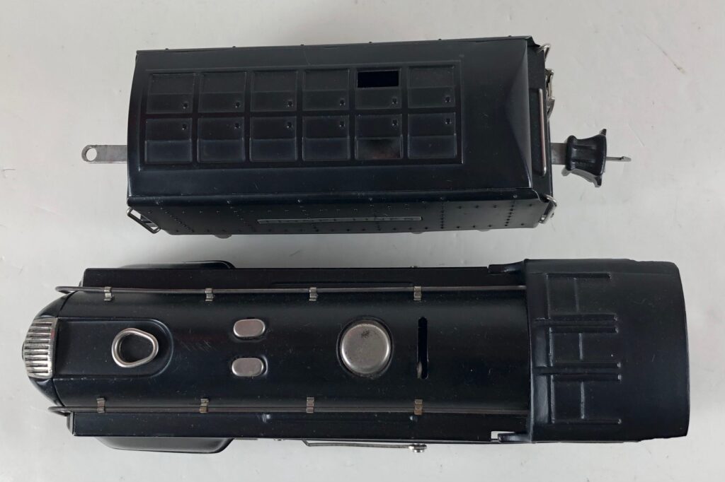 4. No. 265E / 265TX 2-4-2 Steam Locomotive in black with nickel trim, aluminum number plates with black border on the sides of the cab and a brass circle “L” plate on the nose (1936-1938). The engine has black wheels with steel rims. The No. 265TX Tender is black with nickel trim and aluminum plates on the sides of the tender. The tender has nickel journals and a drawbar for connection to the streamlined passenger coach. This locomotive came with the uncataloged China Blue streamlined passenger set.