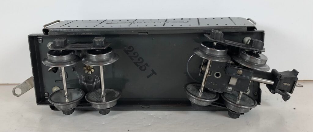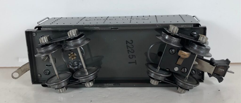 often utilized No. 2225T/W Tenders with an operating coupler. The No. 261TX Tender has a sheet metal body. The tender has nickel trim, brass plates on the sides which reads “Lionel Lines” and a brass circle “L” plate on the rear. The tender has a latch coupler and nickel journals. The No. 265E / 261TX Steam engine and tender combined measure 16-inches in total length. The No. 265T/W and No. 2225T/W Tenders have a sheet metal “waffle top” body with nickel trim and aluminum “Lionel Lines” plates on the sides of the tender. The tenders have an early style manual or operating box coupler and nickel or black journals. The No. 265E / 265T/W Steam engine and tender combined measure 17-inches in total length