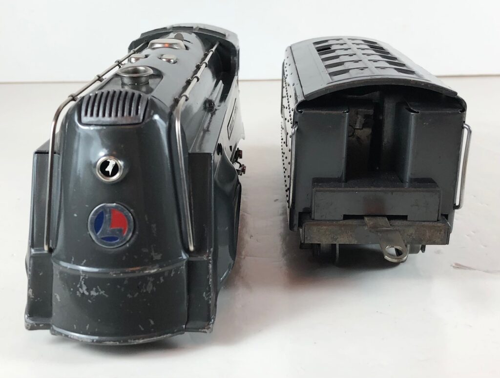 8. No. 265E / 2225T 2-4-2 Steam Locomotive in gunmetal gray with nickel trim, aluminum number plates on the sides of the cab and an aluminum circle “L” plate on the nose (1939-1940). The engine has black wheels with steel rims. The No. 2225T Tender is gunmetal gray with nickel trim and aluminum plates on the sides of the tender. The tender has black journals and an early style operating box coupler.