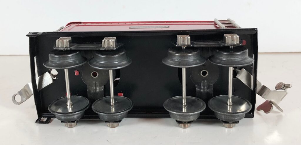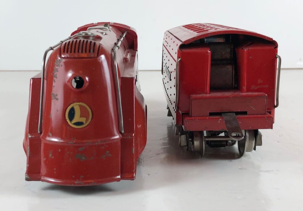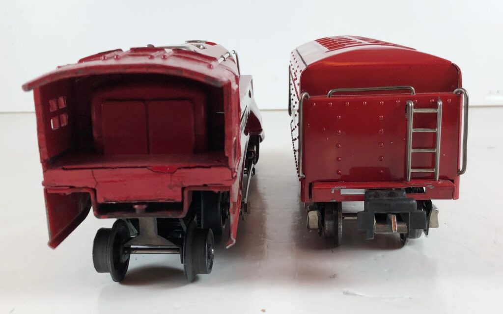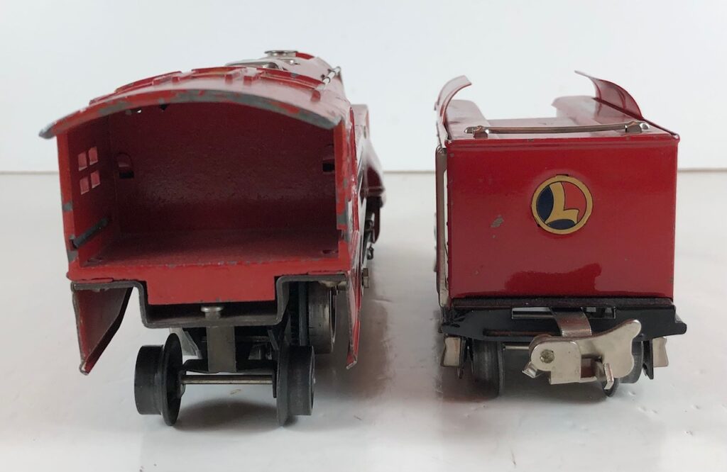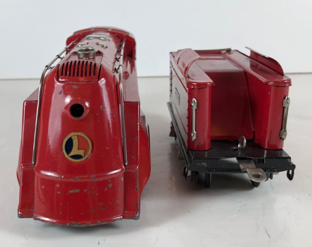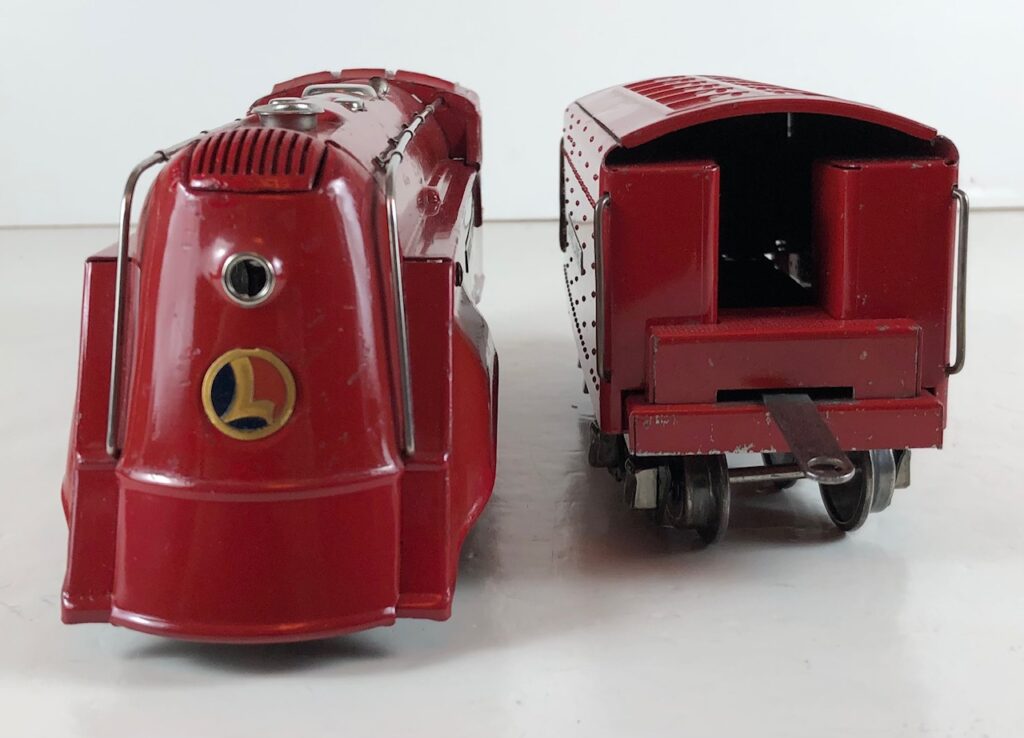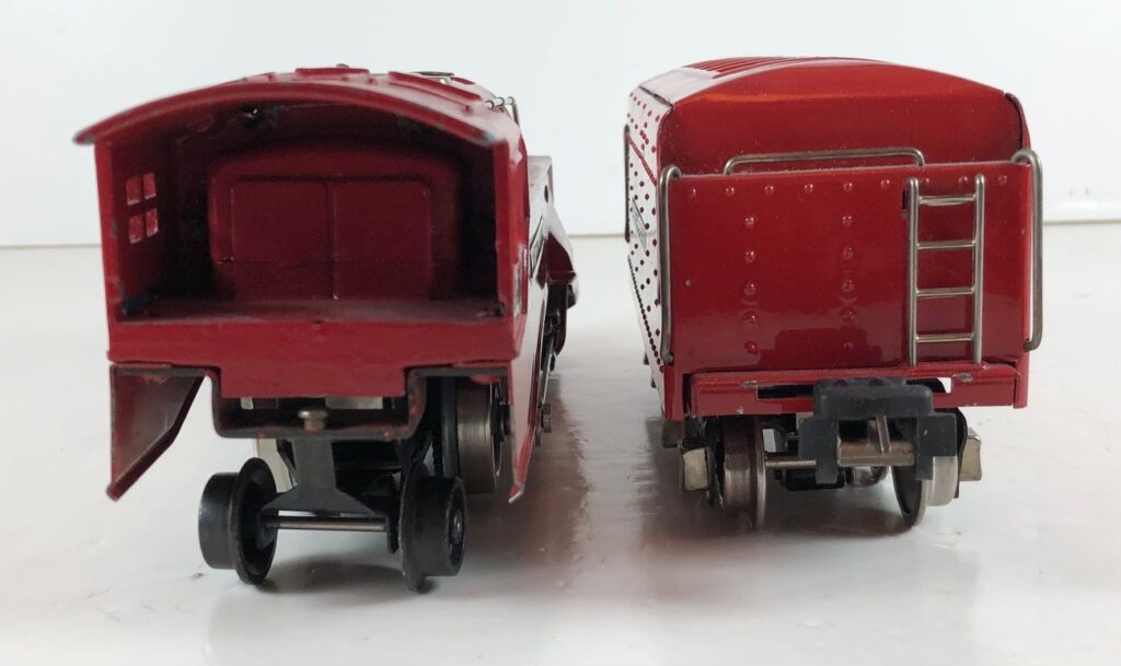 2. No. 264E / 265W 2-4-2 Steam Locomotive in red with nickel trim, aluminum number plates on the sides of the cab and a brass circle “L” plate on the nose (1936). The engine has black wheels with nickel rims. The No. 265W Tender is red with nickel trim and aluminum plates on the sides of the tender. The tender has nickel journals and an early style manual box coupler.
