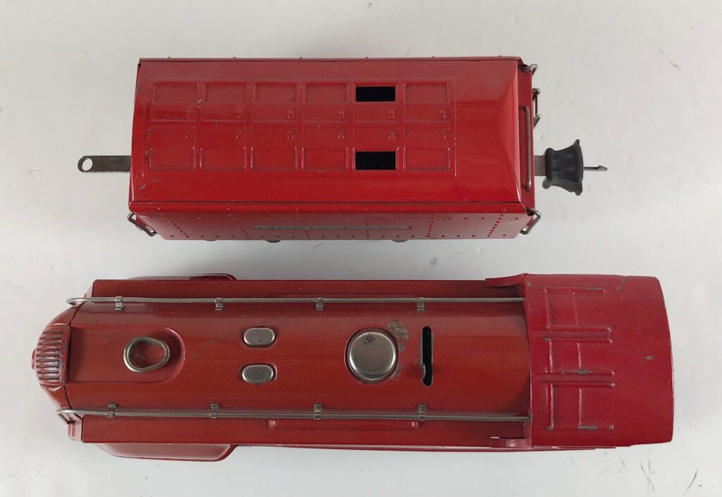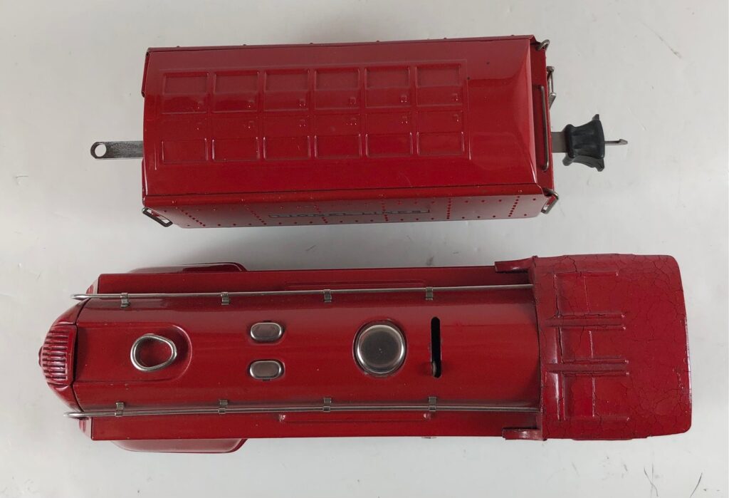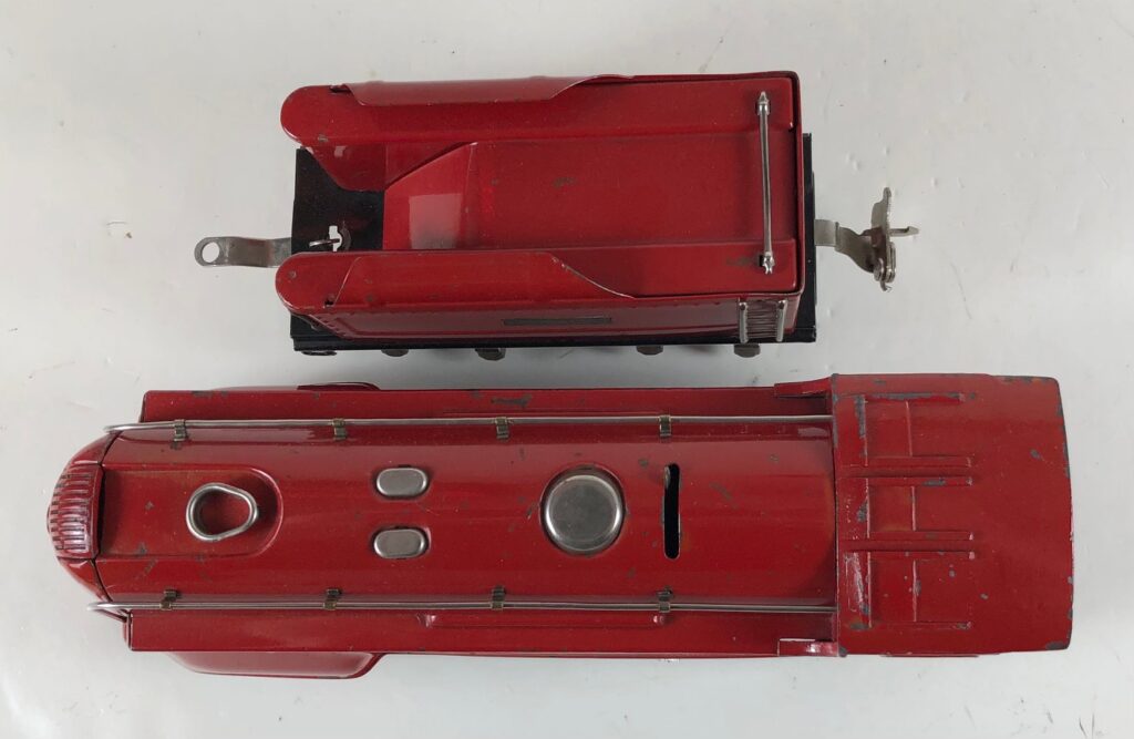 The No. 264E Steam Locomotive was paired with a No. 261T Tender in the 1935 version of the Red Comet Set or with a No. 265T/W Tender in the 1936 version of the Red Comet Set. The locomotive was also paired with either the No. 261T or No. 265T/W Tenders in uncataloged sets. The No. 261T Tender has a sheet metal body. The tender has nickel trim, brass or aluminum plates on the sides which reads “Lionel Lines” and a brass or aluminum circle “L” plate on the rear. The tender has a latch coupler and nickel journals. The No. 264E / 261T Steam engine and tender combined measure 16-inches in total length. The No. 265T/W Tenders have a sheet metal “waffle top” body with nickel trim and aluminum “Lionel Lines” plates on the sides of the tender. The tenders have an early style manual box coupler and nickel journals. The No. 264E / 265T/W Steam engine and tender combined measure 17-inches in total length.