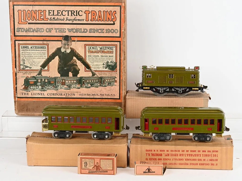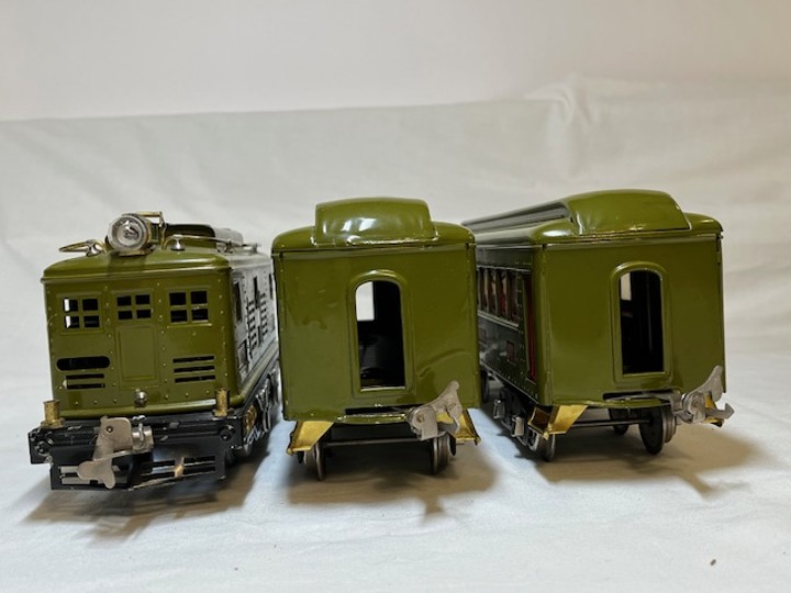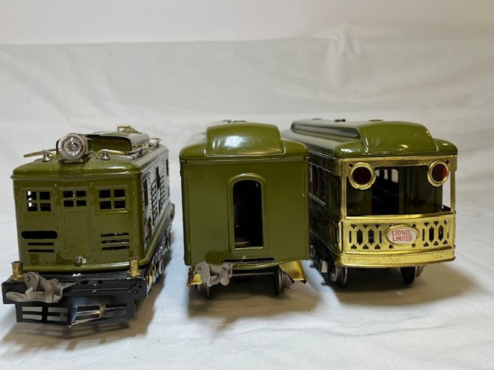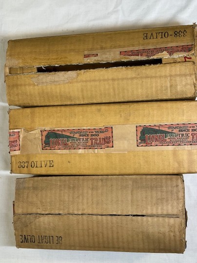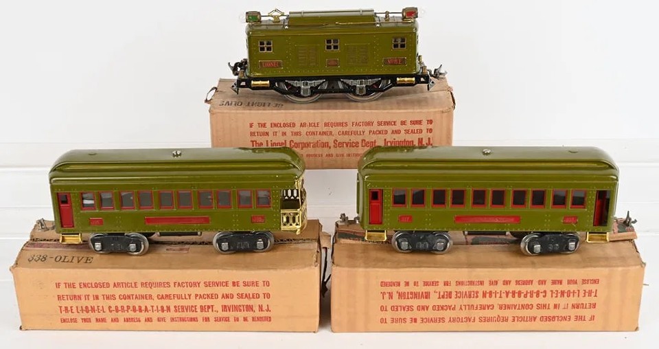 Lionel Prewar Standard Gauge 347E Passenger Set circa 1929-1930. Includes 8E Locomotive, with 337 Passenger car, 338 Observation Car. Individual boxes correctly marked “OLIVE”.