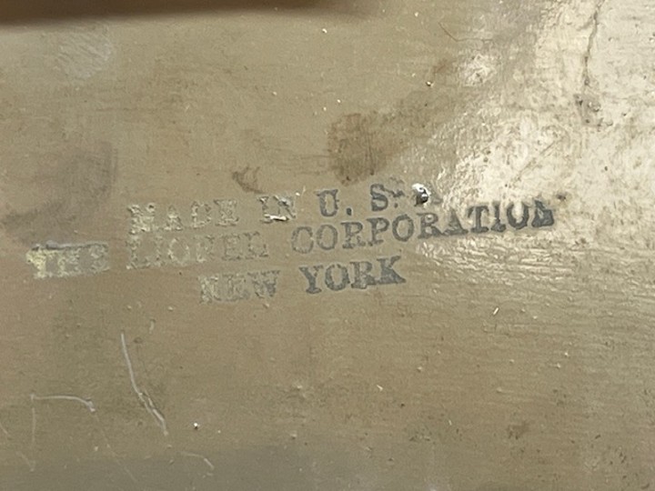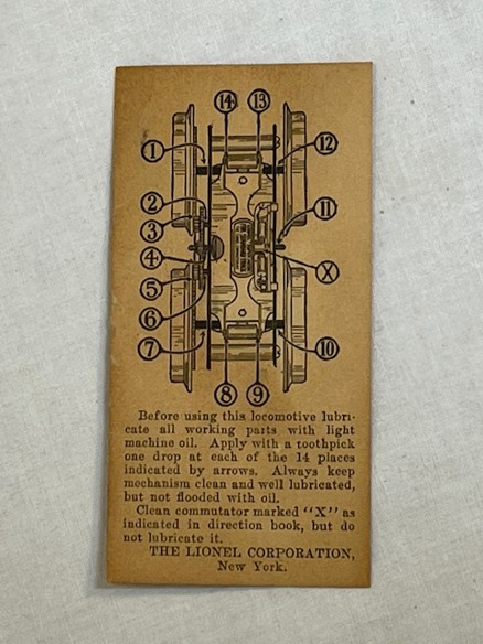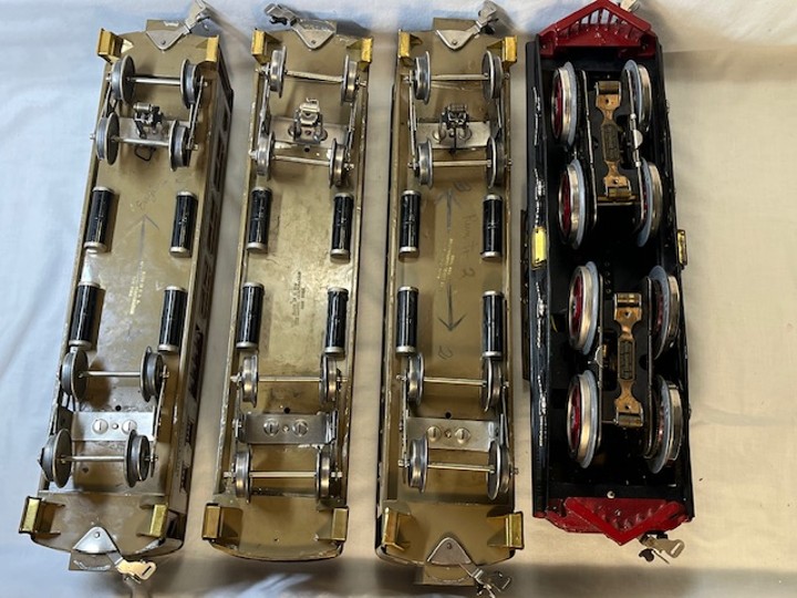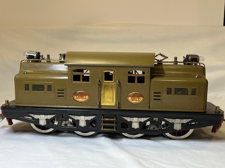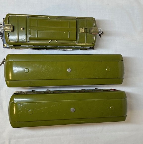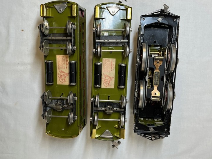 Lionel standard gauge No. 420 passenger outfit was produced from 1921-23. The outfit contents include a gray, double motor No. 42 locomotive, No. 18 Pullman car, No. 19 Pullman/Baggage car and No. 190 Observation. The locomotive and cars have gold rubber stamped lettering and numbers. The cars are painted dark olive green with maroon doors and window sills and are rubber stamped THE LIONEL CORPORATION on the bottoms. The Pullman/Baggage car has a lithographed wood grain door which is carry over from earlier production. The cars have combination hook/latch couplers. The locomotive has manual reverse, hook couplers, a terminal post for car lighting even though the cars have pickup rollers for interior lights and is missing one headlight. The locomotive is a rare factory overpaint. The inside of the locomotive shows the original olive green (see photo below) which was overpainted and re-lettered by the Lionel factory. This was done occasionally when a locomotive was sent back to Lionel for service.