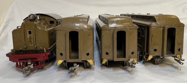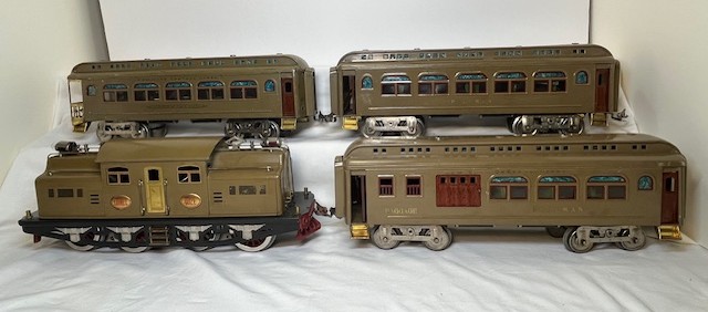 Lionel standard gauge No. 420 passenger outfit was produced from 1915-16. The outfit contents include a black, single motor No. 42 locomotive, No. 18 Pullman car, No. 19 Pullman/Baggage car and No. 190 Observation and all are marked LIONEL MANUFACTURING CO. The cars are painted dark olive green with maroon doors and window sills and are embossed LIONEL MFG CO NY on the bottoms. The locomotive and cars have gold rubber stamped lettering and numbers. The Observation has a long platform and unfortunately is the only car in this outfit that has an original box. The locomotive and cars have hook couplers. The locomotive has manual reverse, a terminal post for interior car lighting and is missing a pedestal headlight.
