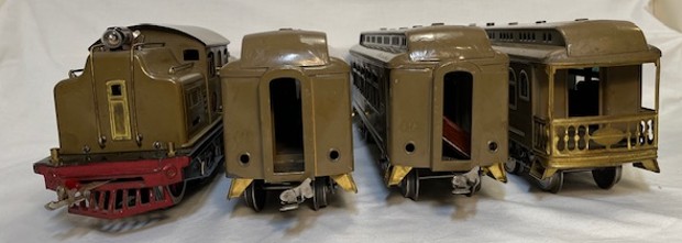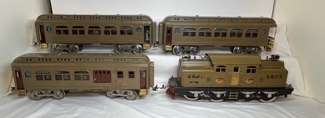 Lionel Standard Gauge Outfit No. 352, 352 – 10 electric locomotive, two 337Pullman passenger cars, 338 Observation car. This outfit dates to 1925 which is the first year the outfit was offered. The outfit is Mojave in color. The engine had strap headlights and nickel trim. The passenger cars had maroon trim and were stamped with “New York Central Lines”. The outfit was offered from 1925 to 1928. Later outfits were offered in grey and peacock colors.