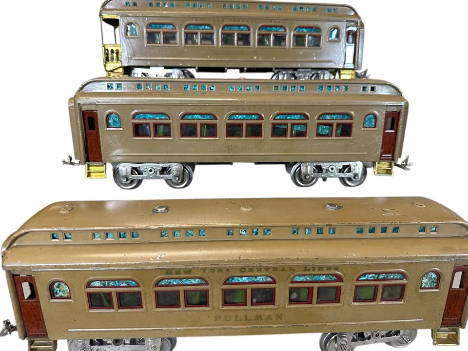 Lionel Standard Gauge Set 34(b) circa 1920 – 1923. This version has a black 33 electric engine, 35 olive Pullman, extra 35 olive Pullman, and 36 olive Observation. Engine has a hand reverse, nickel bell, strap headlight, gold vents, and lettered “NEW YORK CENTRAL LINES”. Pullman and Observation cars are lettered “NEW YORK CENTRAL LINES” above the windows and “PULLMAN” or “OBSERVATION” below the windows. The ends of the cars have the car number along with the wording “Lionel Lines N.Y. Made in the USA”