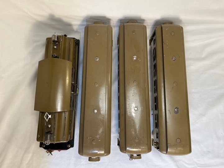 Outfit No. 378W noted as “The Pennsylvania Limited” was made from 1935-1939 and consisted of the 392E locomotive in gun metal grey along with the 392W tender, the 424 Pullman Car, the 425 Pullman Car, and 425 Observation Car. The passenger cars have brass trim, with brass journals and are two tone Steven Gerard green.