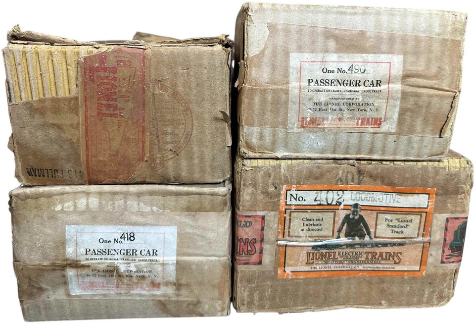 Lionel Prewar Standard Gauge Outfit No. 362 with 384E Loco with green windows, 384T, 309 and 312 Passenger Cars. Very tough set to find. Outfit no. 362 is noteworthy because it came with non-matching lettering on the passenger cars. The 309 has New York Central Lines and nickel journals and wood grain doors while the 312 has Lionel Lines with cream doors and cooper journals. Both passenger car boxes have the correct “IVORY WINE” stamping. This particular set dates to 1931.