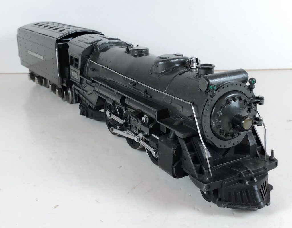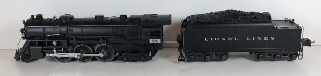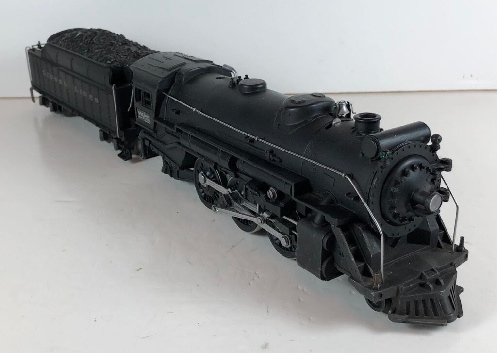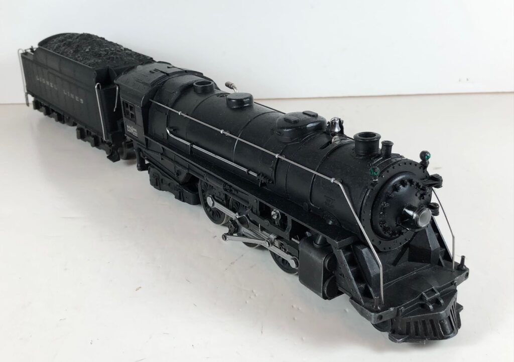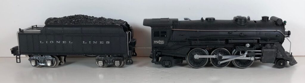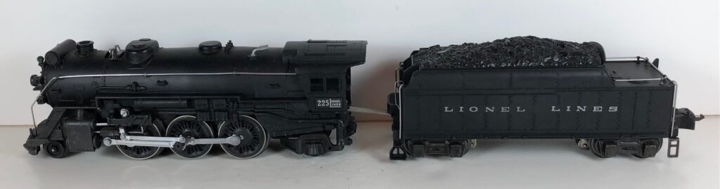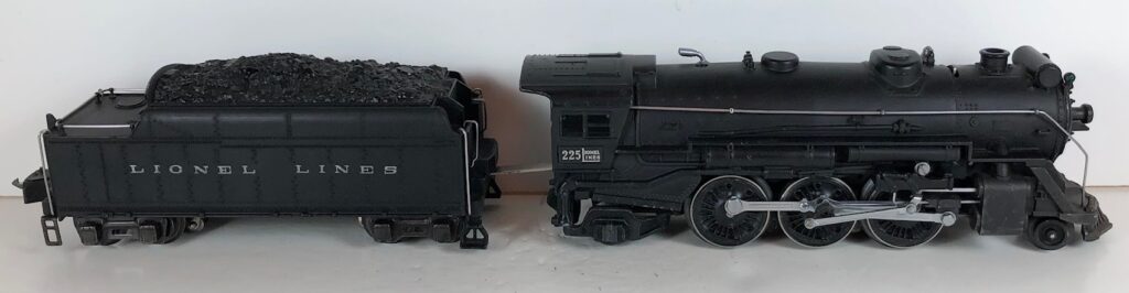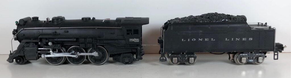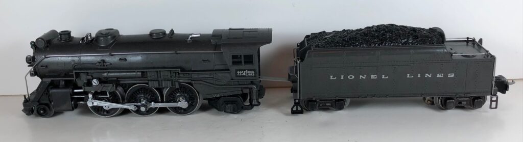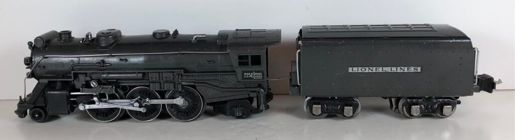 4. No. 225E / 2245W 2-6-2 Steam Locomotive in black with nickel trim and aluminum “225E” number plates on the sides of the cab (1939-1940). The No. 2245W Tender is black with “Lionel Lines” stamped on the sides of the tender. The tender has nickel journals and an early style operating box coupler.