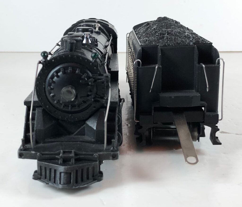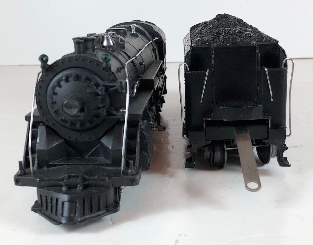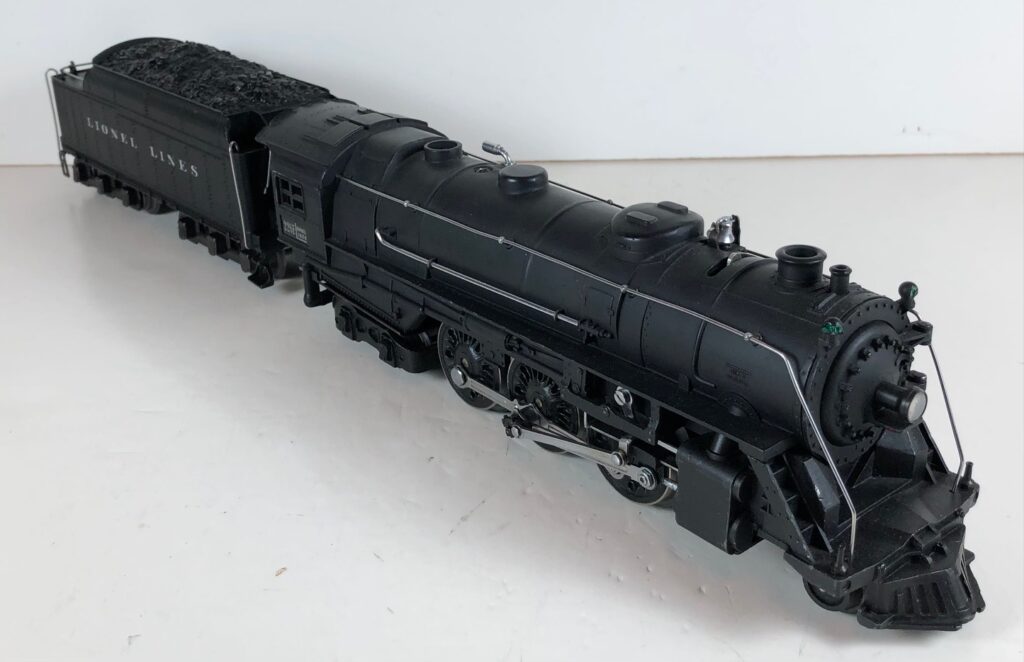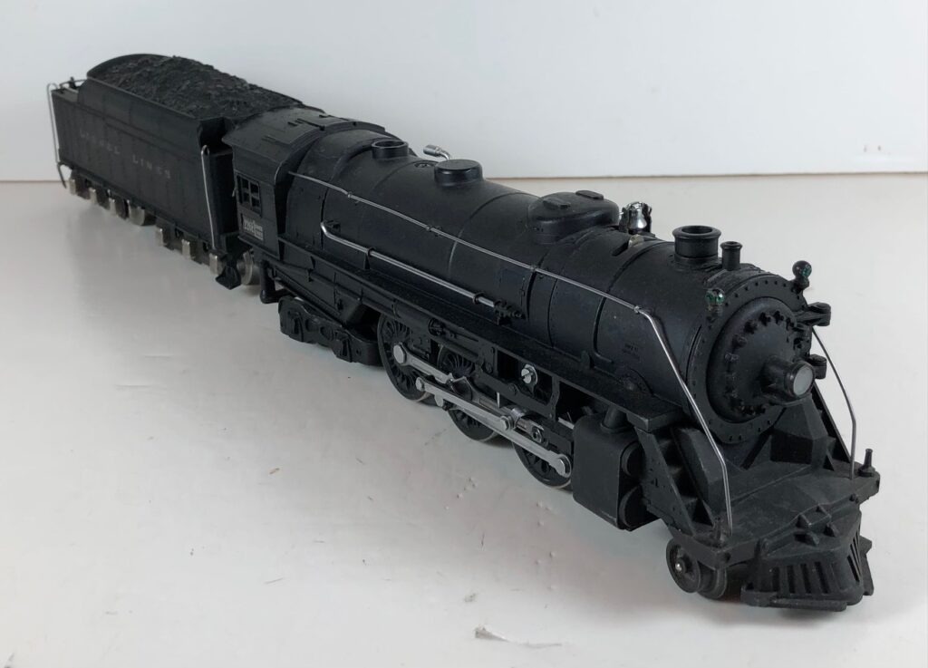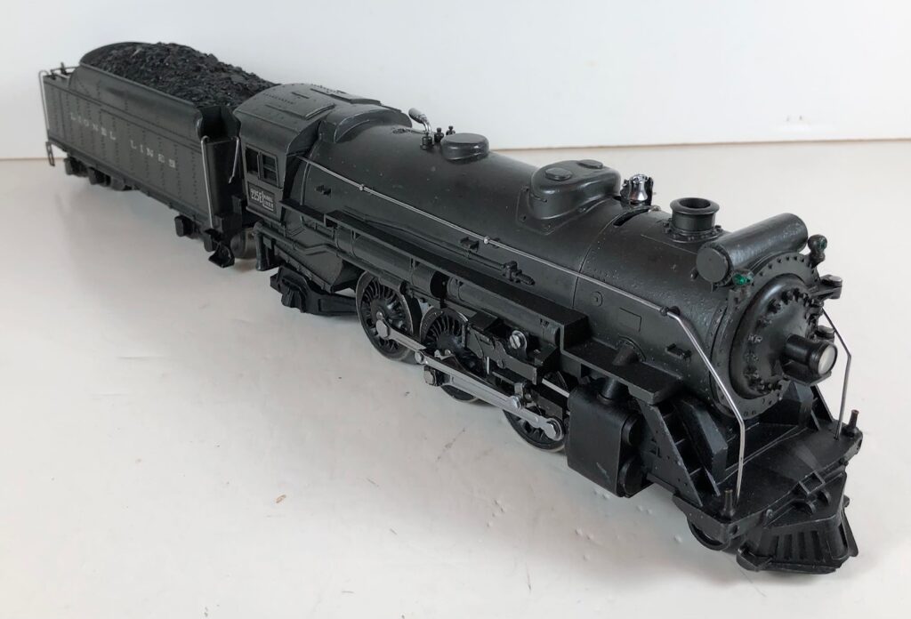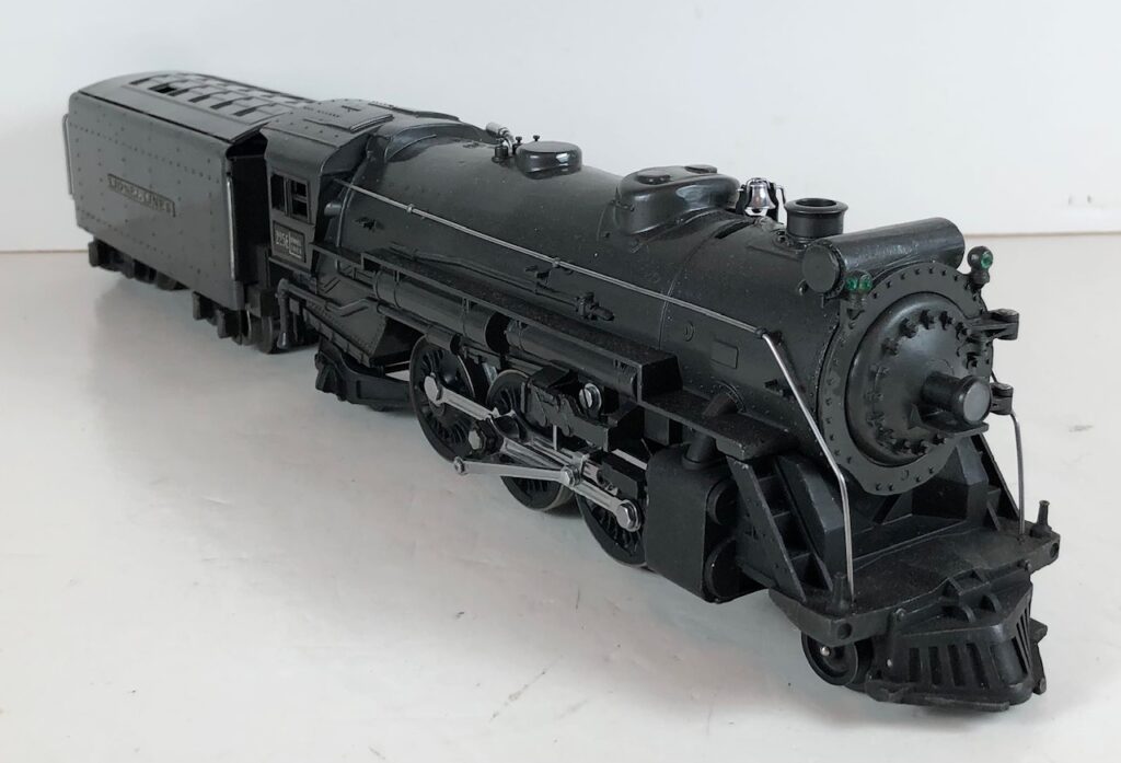 4. No. 225E / 2245W 2-6-2 Steam Locomotive in black with nickel trim and aluminum “225E” number plates on the sides of the cab (1939-1940). The No. 2245W Tender is black with “Lionel Lines” stamped on the sides of the tender. The tender has nickel journals and an early style operating box coupler.