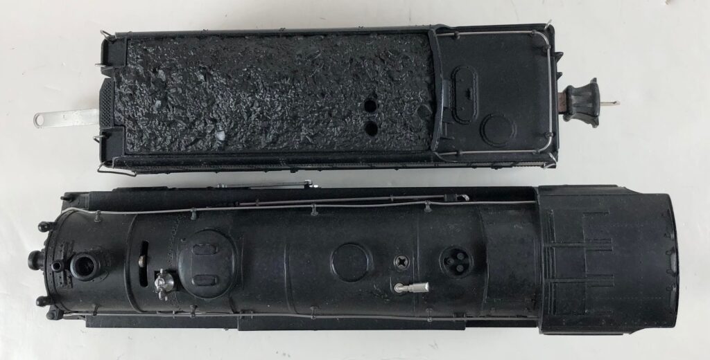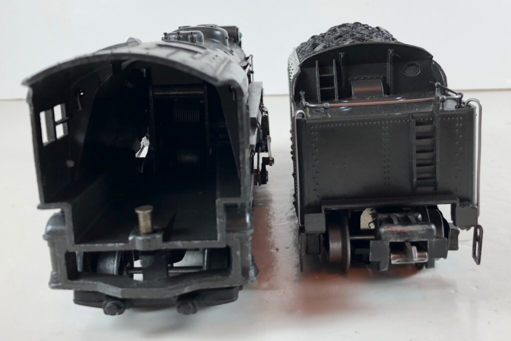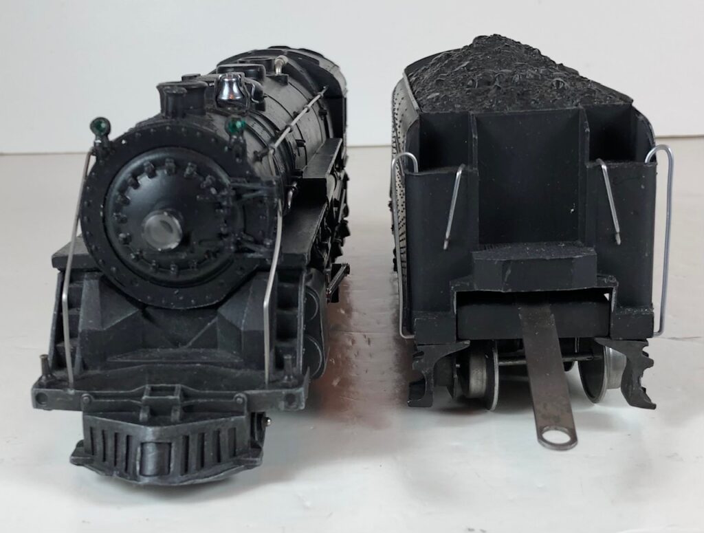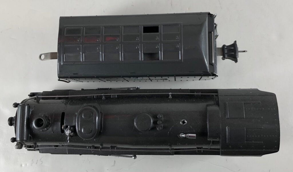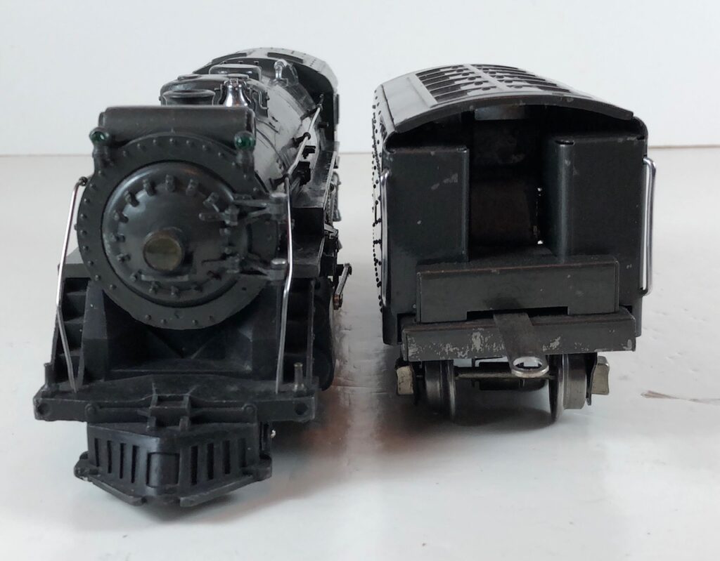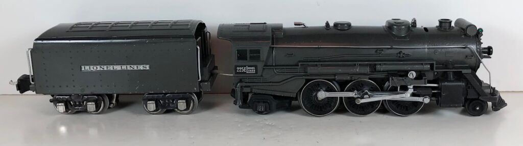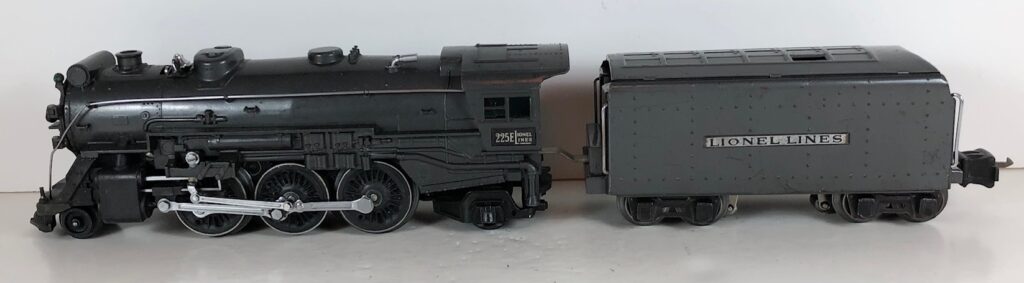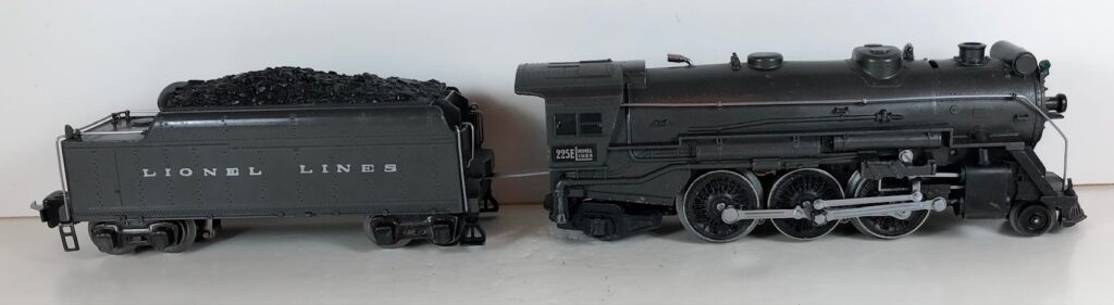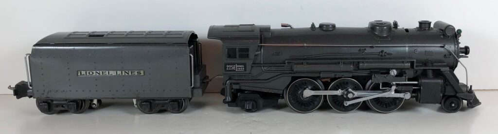 3. No. 225E / 2235W 2-6-2 Steam Locomotive in gunmetal gray with nickel trim and aluminum “225E” number plates on the sides of the cab (1939). The No. 2235W Tender is gunmetal gray with “Lionel Lines” stamped on the sides of the tender. The tender has black journals and an early style operating box coupler.