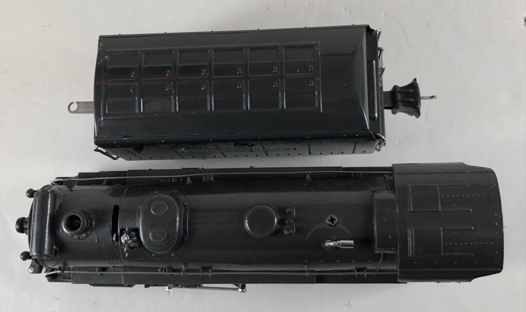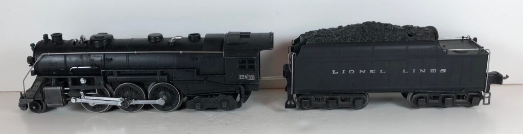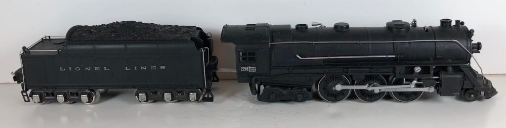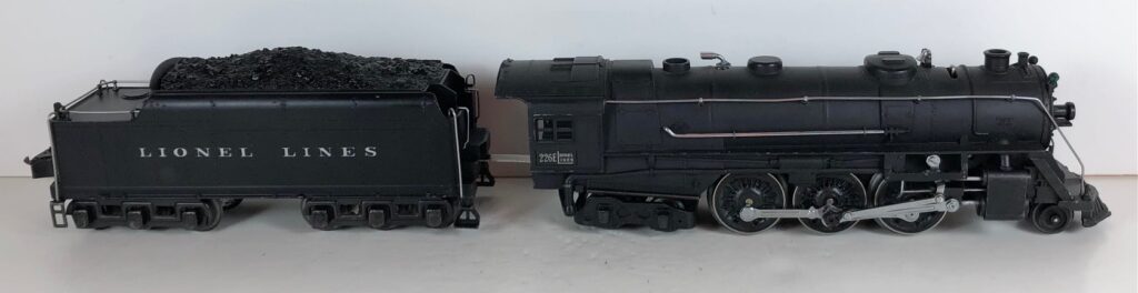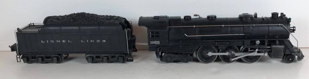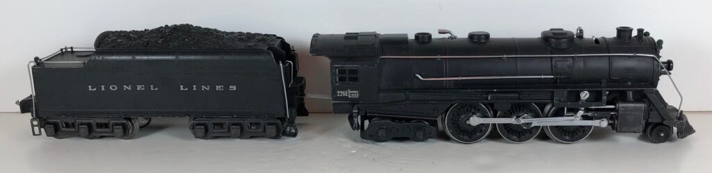 1. No. 226E / 2226W 2-6-4 Steam Locomotive in black with nickel trim and aluminum “226E” number plates on the sides of the cab (1938). The No. 2226W Tender is black with “Lionel Lines” stamped on the sides of the tender with short lettering. The tender has six wheel trucks, nickel journals and an early style operating box coupler.