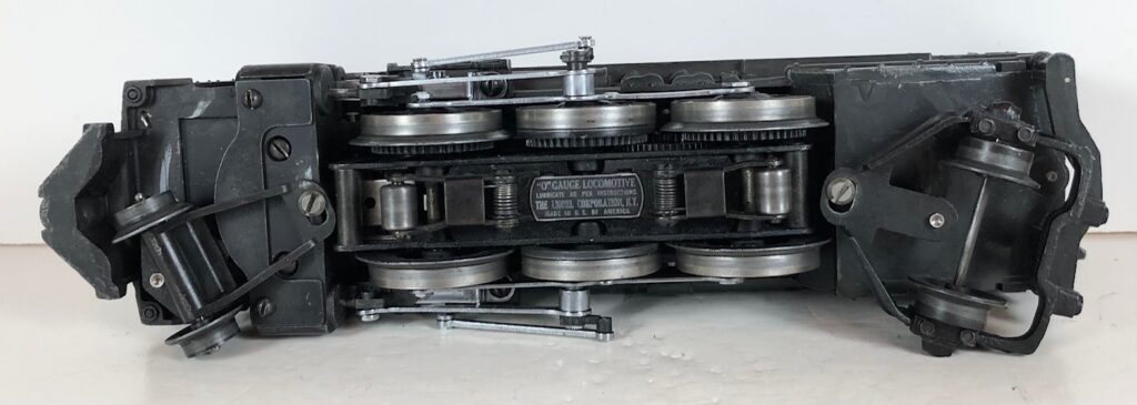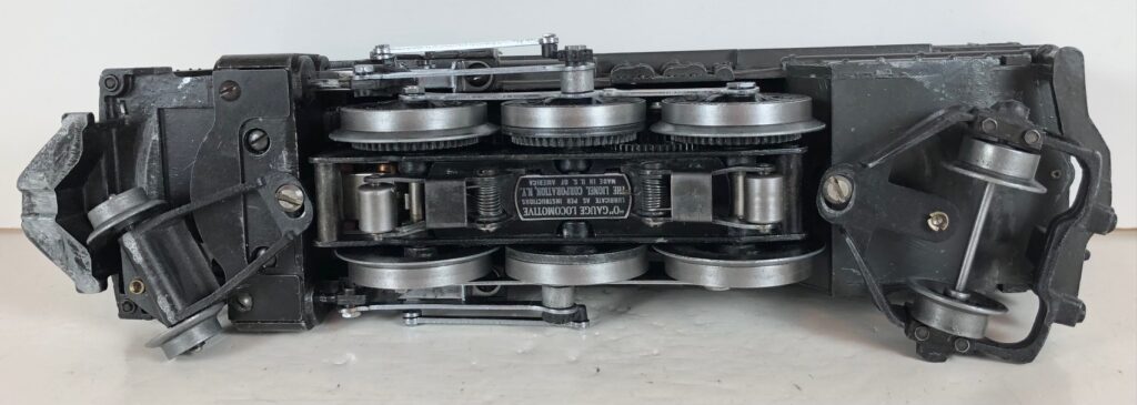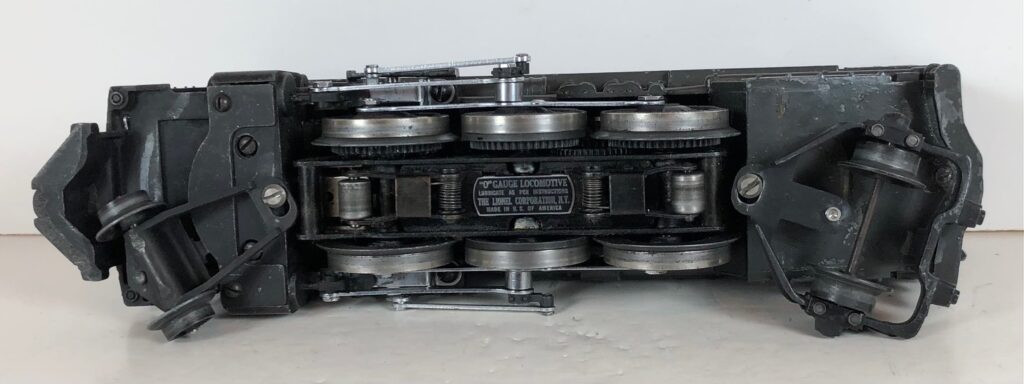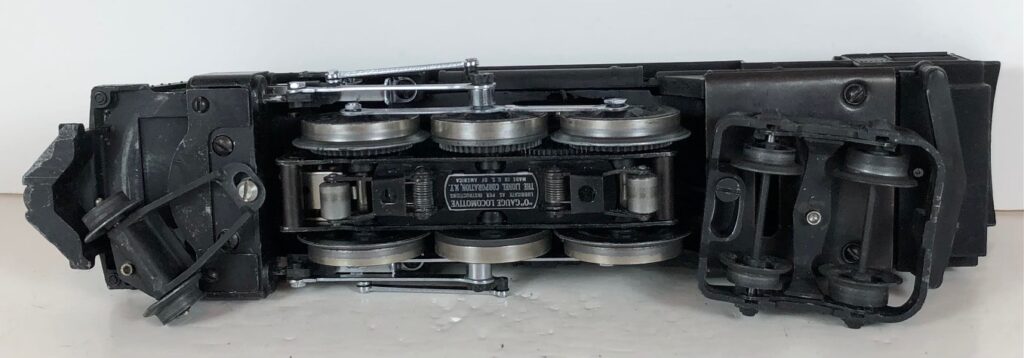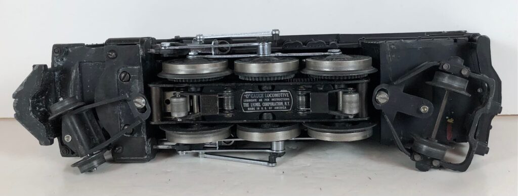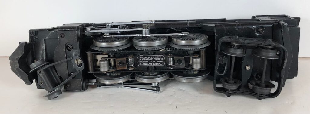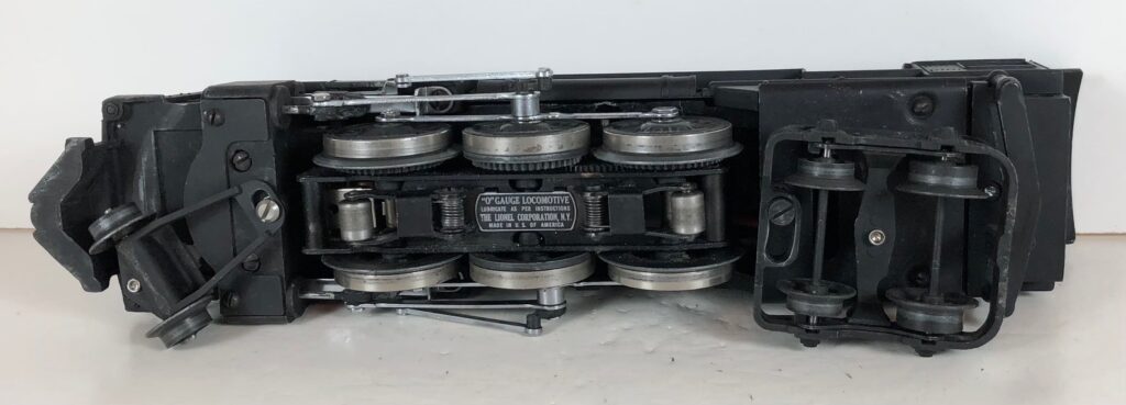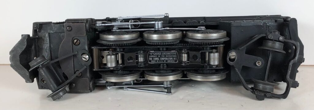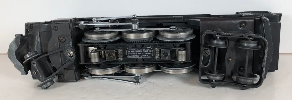 The No. 226 Locomotive has nickel trim, wire handrails and an “O” Gauge six drive wheel motor with Baldwin Disc drive wheels. The locomotive has an operating headlight, red firebox light and a remotely operated reverse with a lever on the top of the boiler that engages or disengages the reversing unit. The number is on an aluminum plate below the cab windows. A few No. 226 Locomotives have “Lionel Lines” on the aluminum plate in lieu of the number.