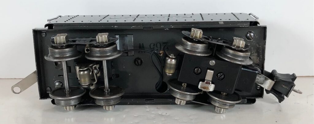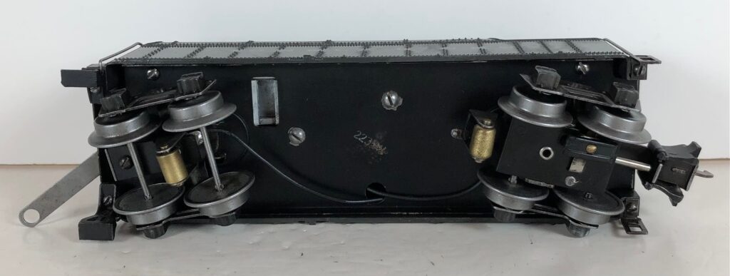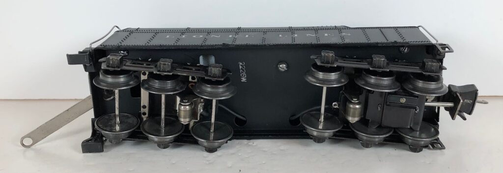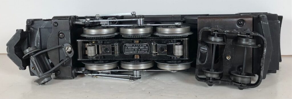 The No. 225 Locomotive has nickel trim, wire handrails and an “O” Gauge six drive wheel motor with Baldwin Disc drive wheels. The locomotive has an operating headlight and a remotely operated reverse with a lever on the top of the boiler that engages or disengages the reversing unit. The number is on an aluminum plate below the cab windows.