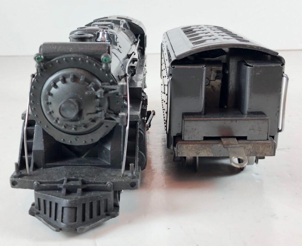 2. No. 226E / 2226W 2-6-4 Steam Locomotive in black with nickel trim and aluminum “226E” number plates on the sides of the cab (1938). The No. 2226W Tender is black with “Lionel Lines” stamped on the sides of the tender with tall lettering. The tender has six wheel trucks, black journals and a late style operating box coupler.