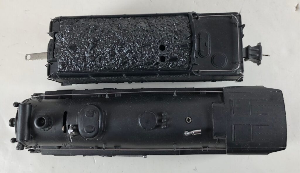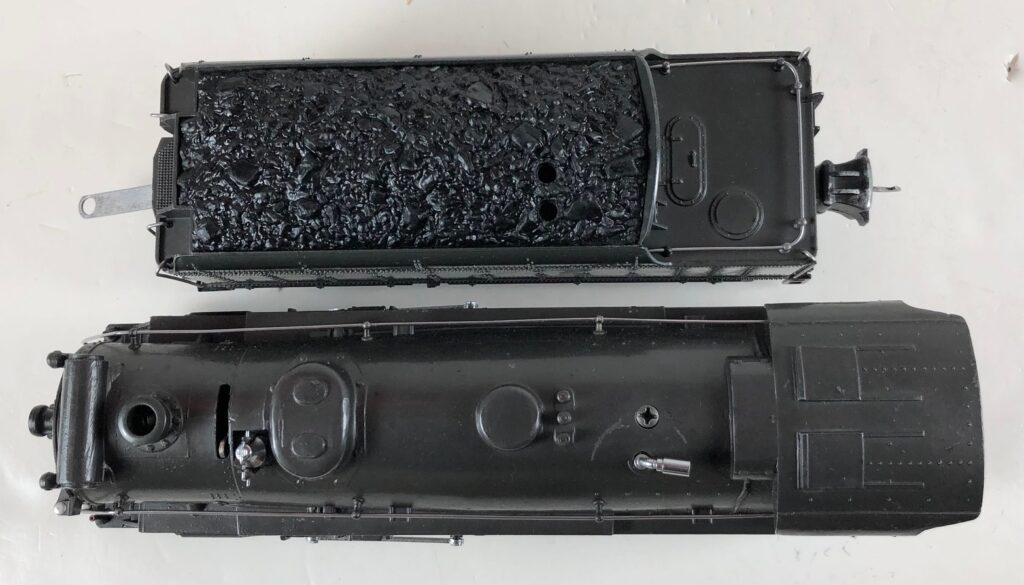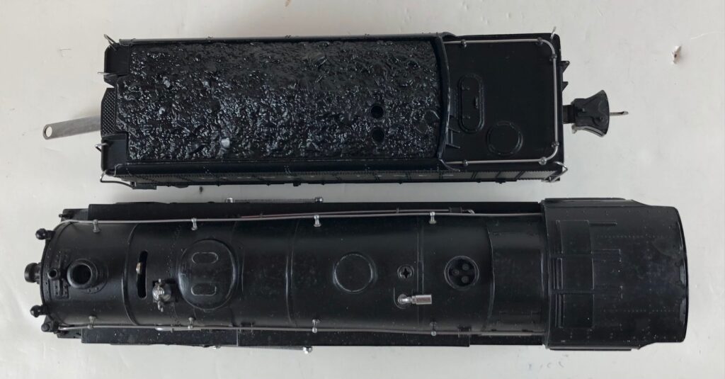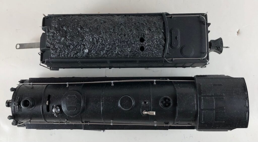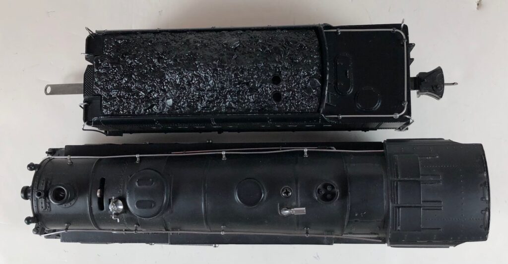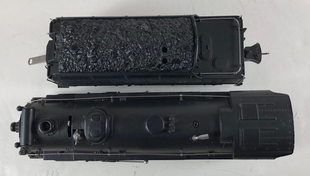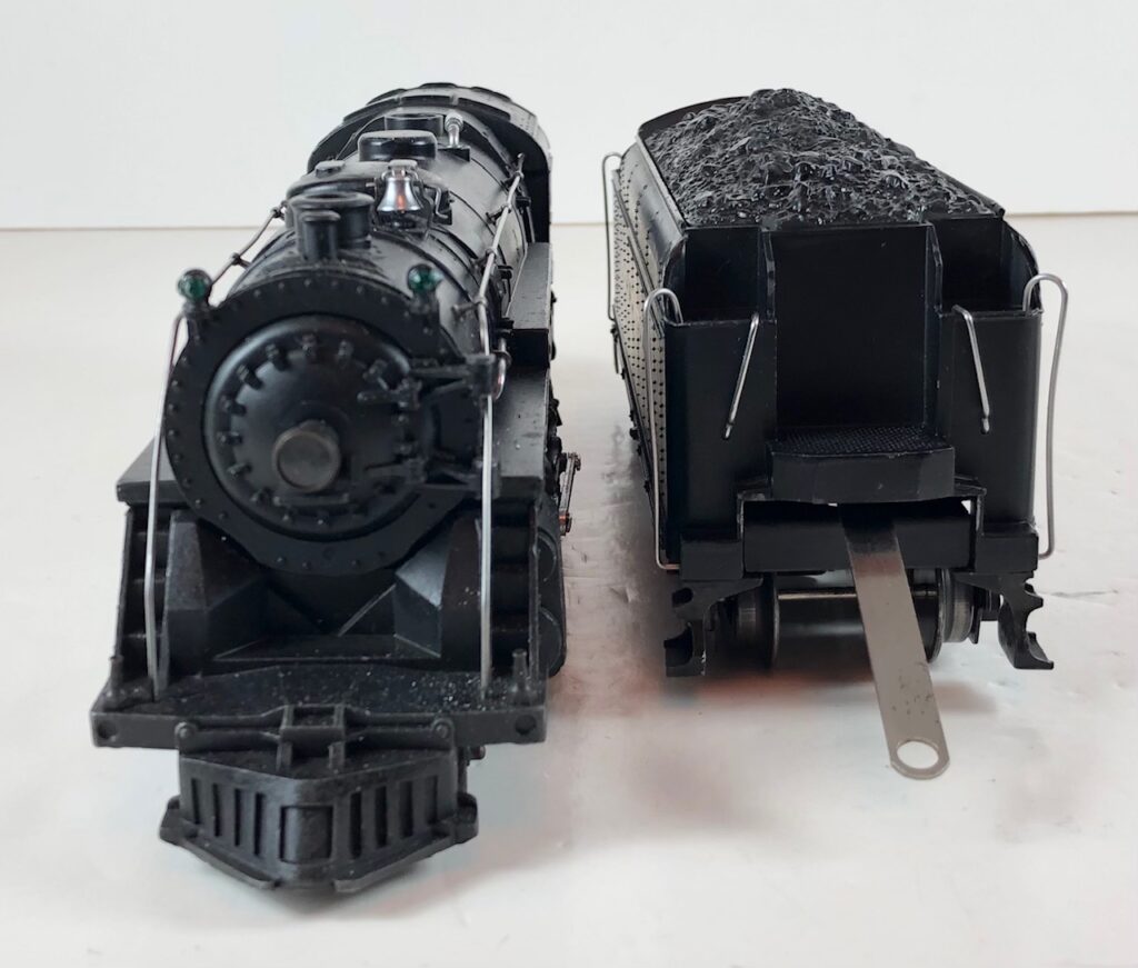 1. No. 225E / 2265W 2-6-2 Steam Locomotive in gunmetal gray with nickel trim and aluminum “225E” number plates on the sides of the cab (1938). The No. 2265W Tender is gunmetal gray with nickel plates on the sides of the tender. The tender has nickel journals and an early style operating box coupler.