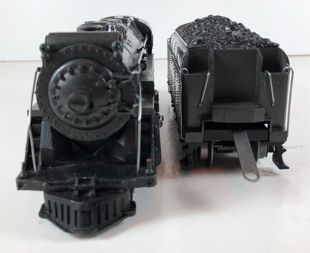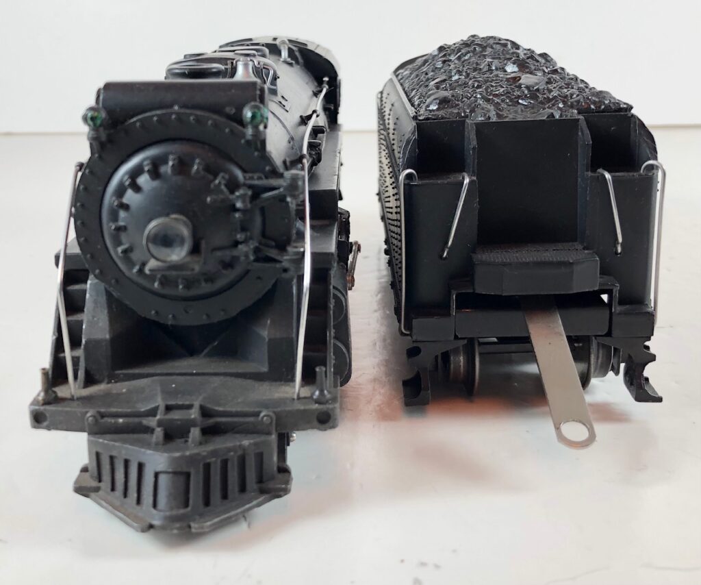 3. No. 226E / 2226W 2-6-4 Steam Locomotive in black with nickel trim and aluminum “226E” number plates on the sides of the cab (1938). The No. 2226W Tender is black with “Lionel Lines” stamped on the sides of the tender with short lettering. The tender has six wheel trucks, black journals and a late style operating box coupler.