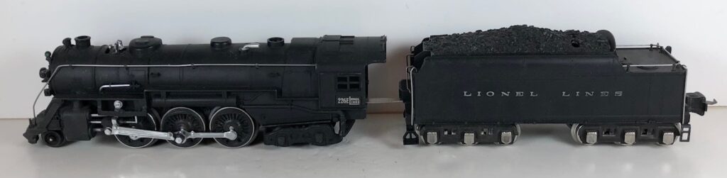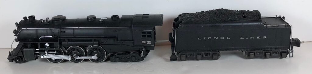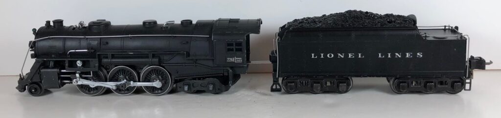 5. No. 225 / 2235W 2-6-2 Steam Locomotive in black with nickel trim and aluminum “225” number plates on the sides of the cab (1941-1942). The No. 2235W Tender is black with “Lionel Lines” stamped on the sides of the tender. The tender has black journals and a late style operating box coupler.