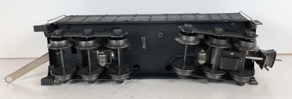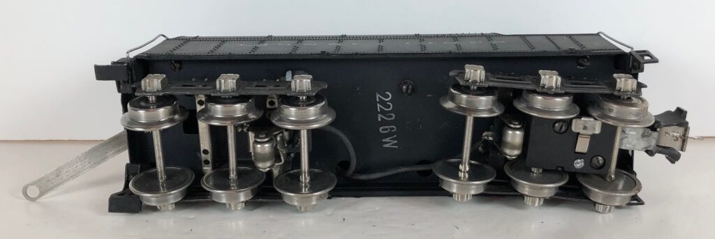 The No. 226 Steam Locomotive was always paired with a No. 2226W Coal Tender. The No. 2226W Tenders have a black diecast body with wire handrails on the deck and corners, a separate plastic coal pile and front and rear steps. The tender has “Lionel Lines” stamped on the sides. Some 2226W Tenders have larger lettering that stands about 3/16-inches tall. Other tenders have shorter lettering that stands about 1/8-inches tall. The No. 226 / 2226W Steam engine and tender combined measure 21-inches in total length.