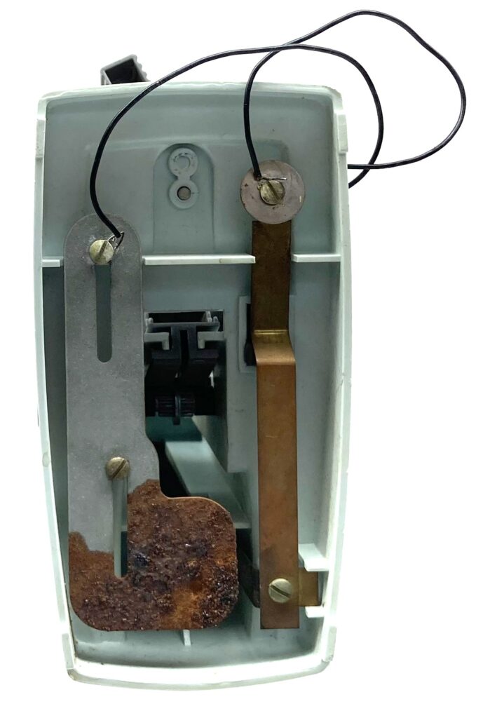 gray parts are painted cast metal, crackle finish, black parts are plastic